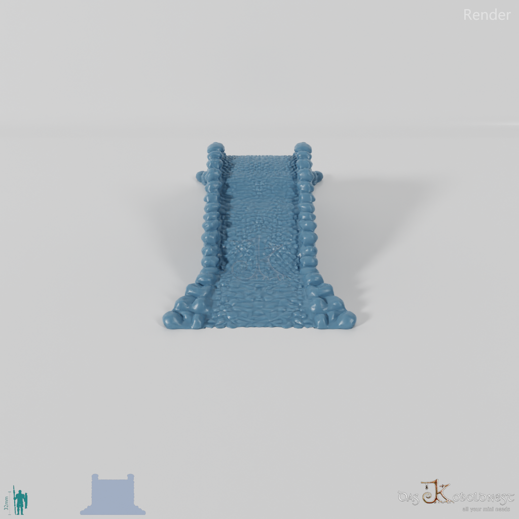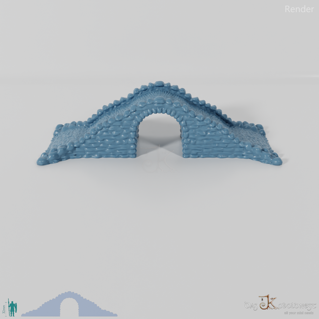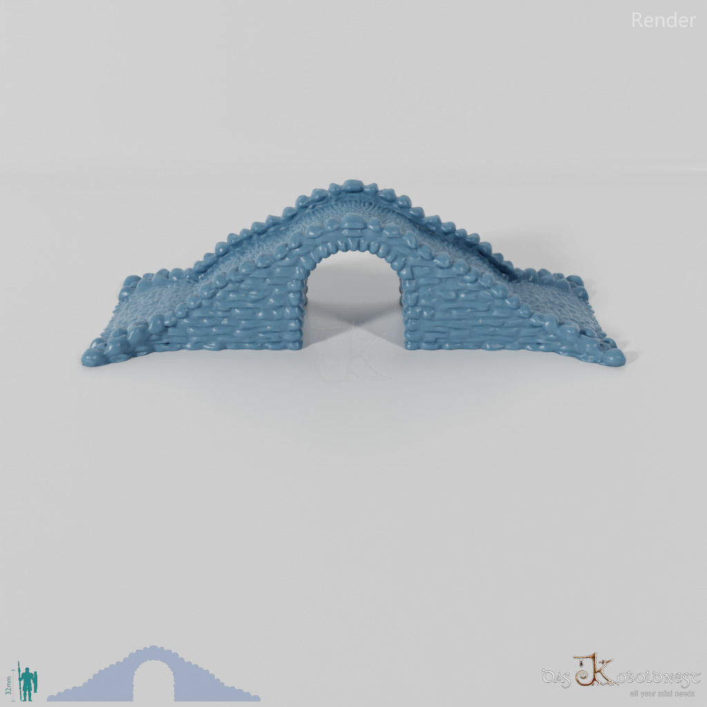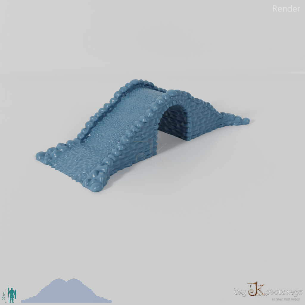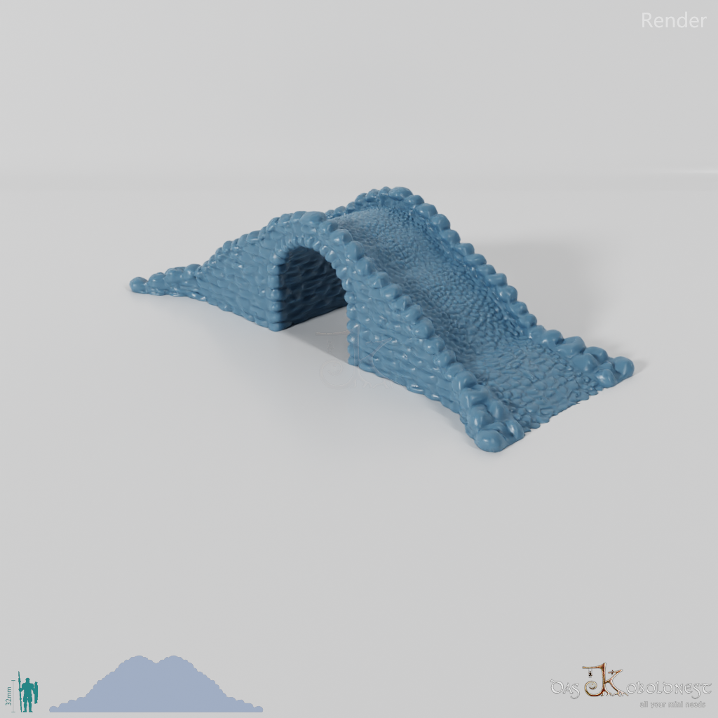 Mit runden Steinen gesäumte Brücke, die steil ansteigt und mit feinen Steinen bedeckt ist