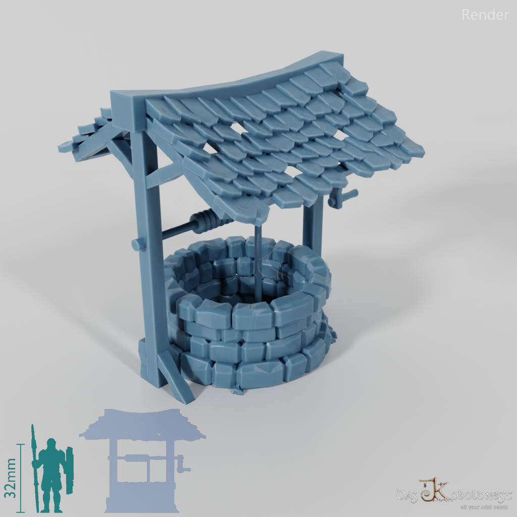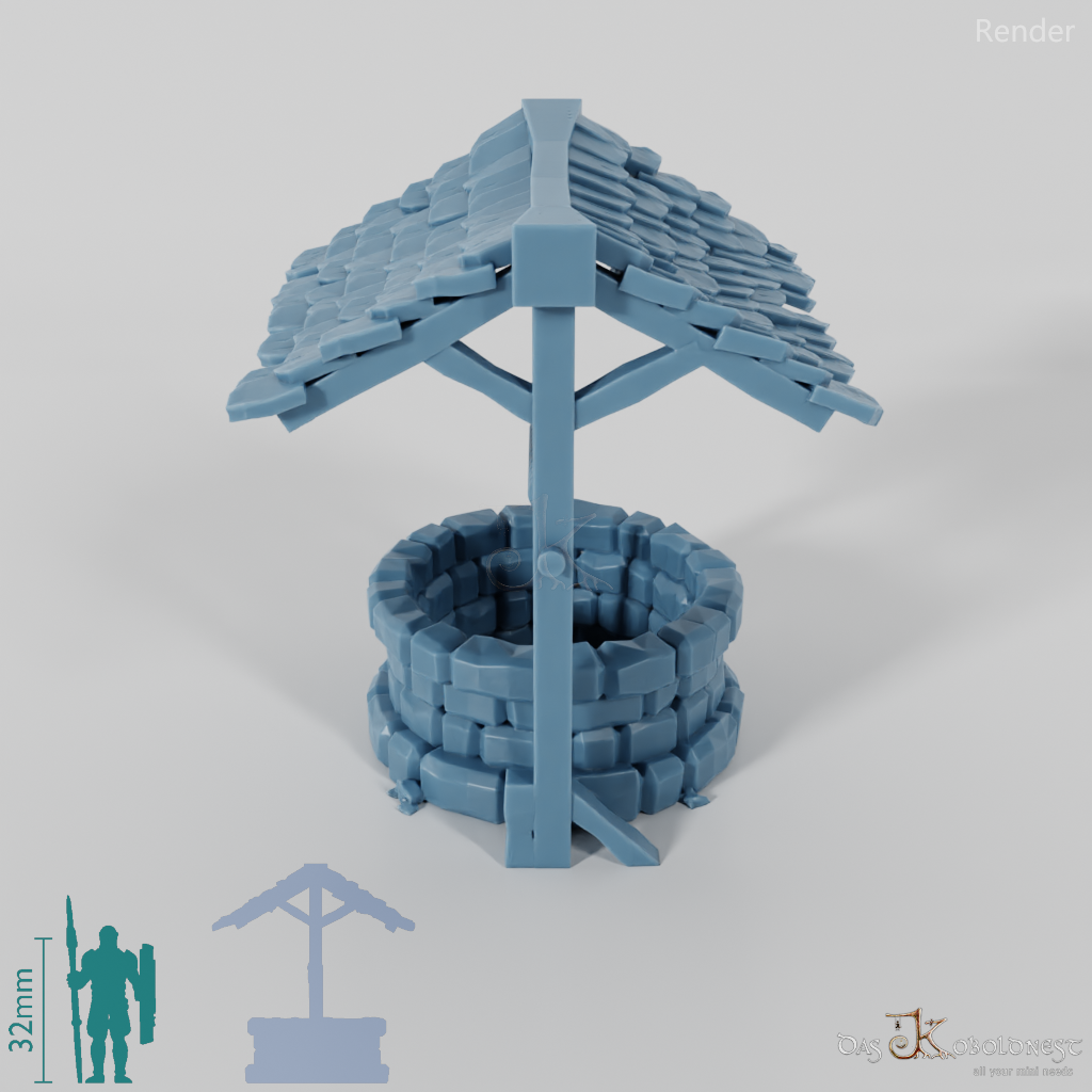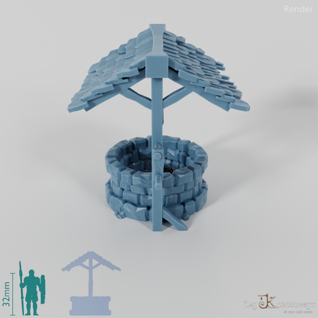 Überdachter Steinbrunnen mit löchrigem Dach.   Modell: Old Well RPG Terrain by llewinidas, lizenziert unter CC BY 3.0.