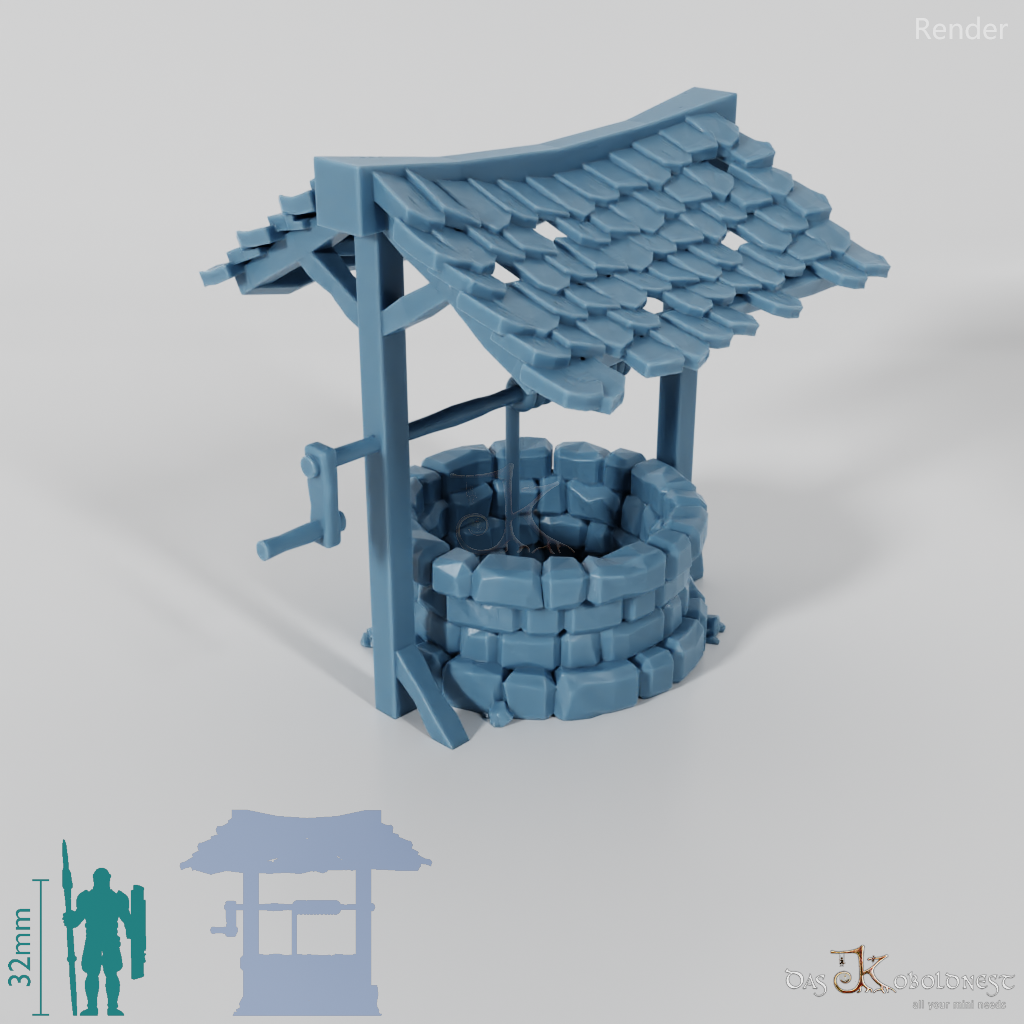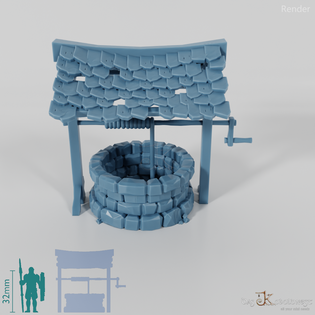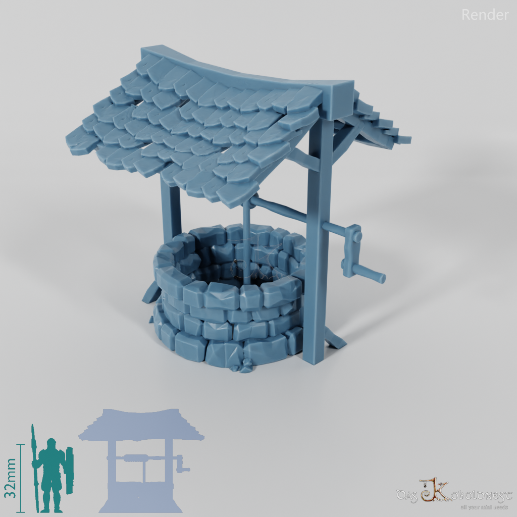 Überdachter Steinbrunnen mit löchrigem Dach.   Modell: Old Well RPG Terrain by llewinidas, lizenziert unter CC BY 3.0.