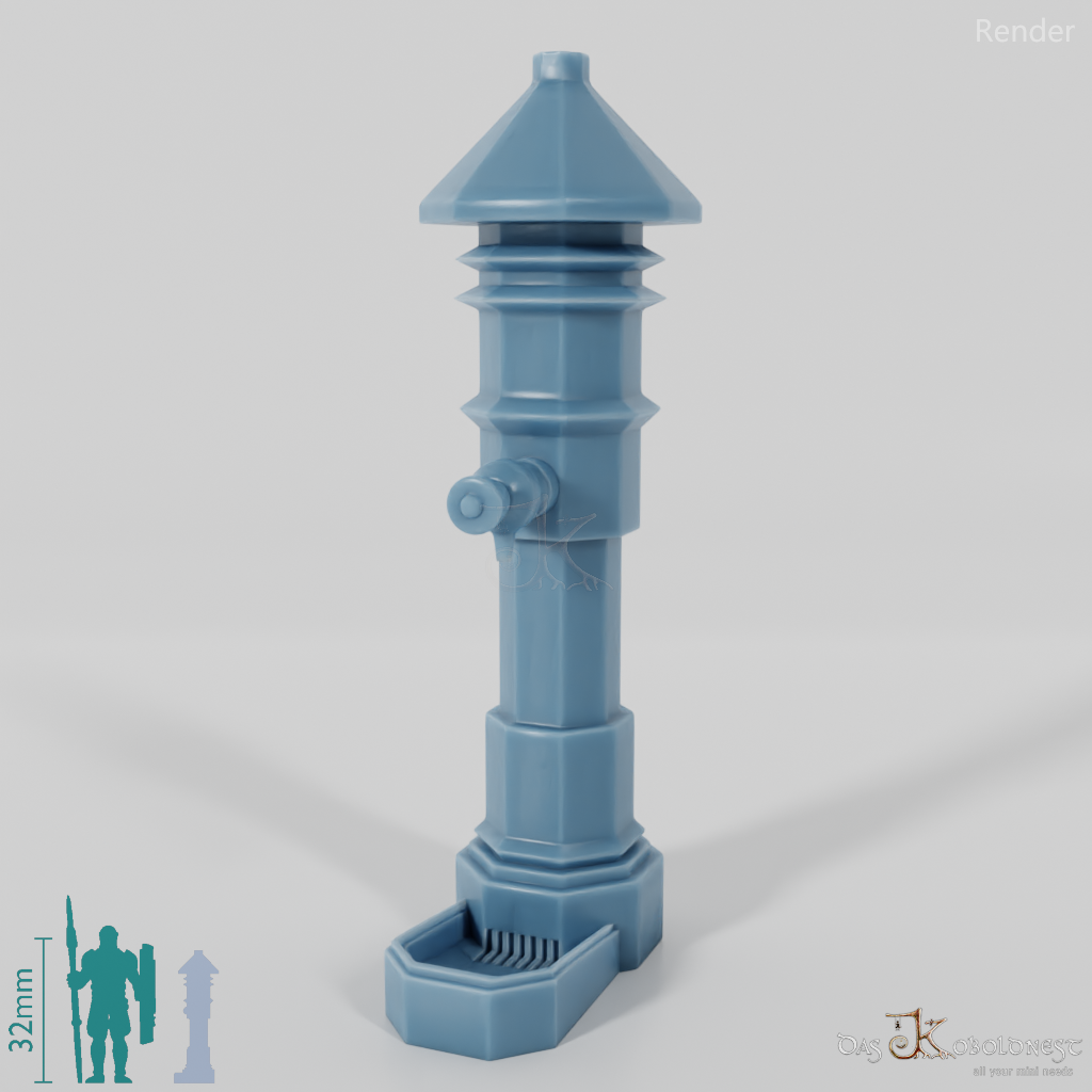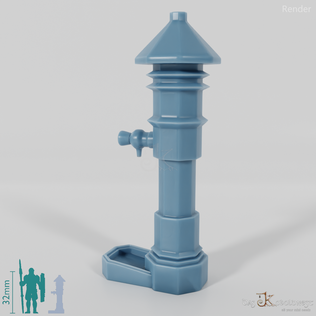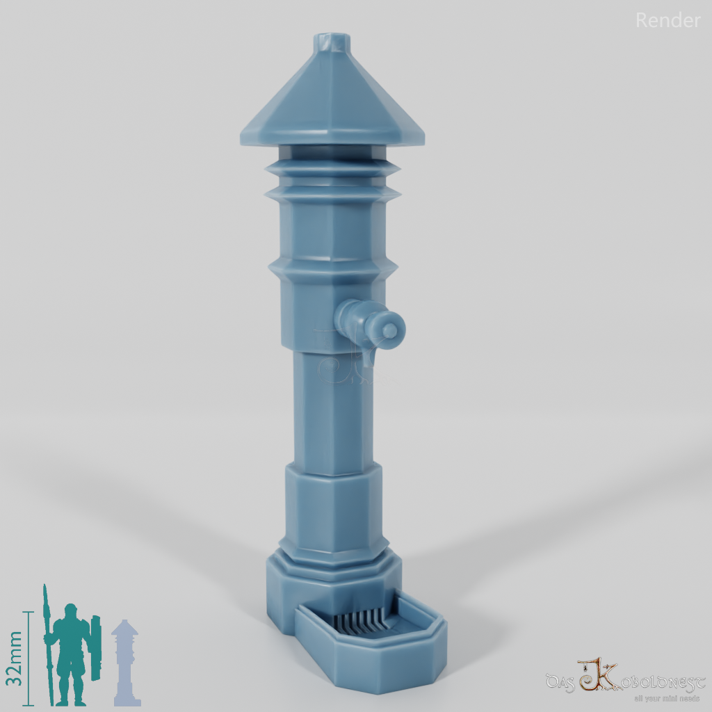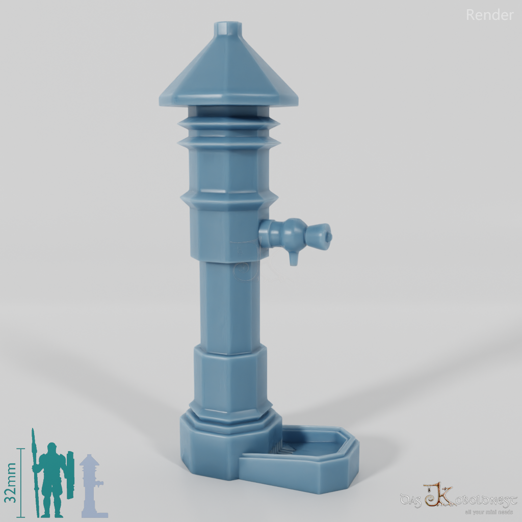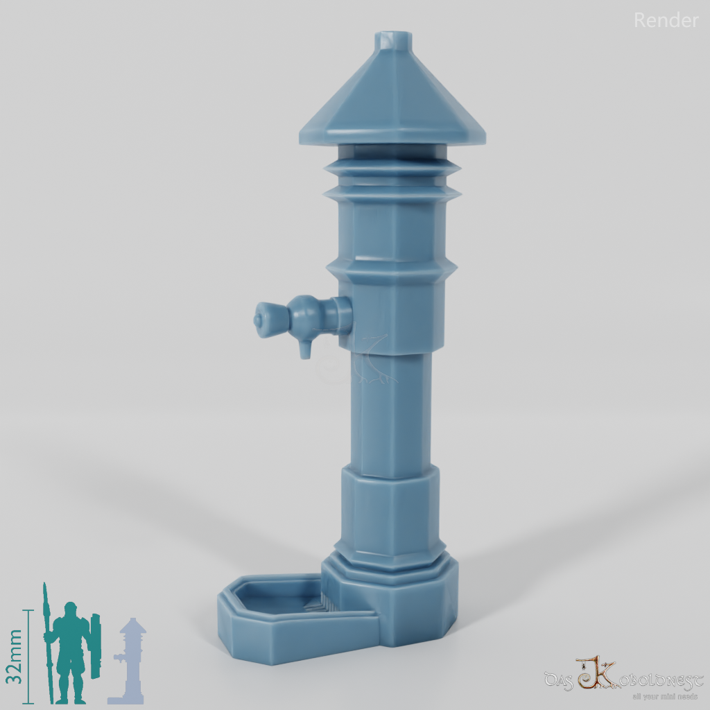 Schlanker Trinkbrunnen mit Wasserhahn und achteckigem Dach