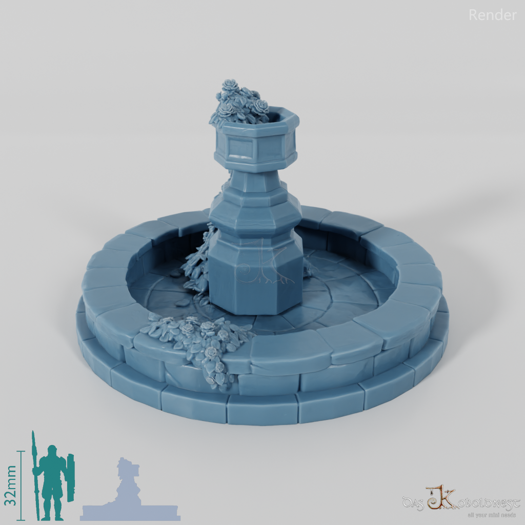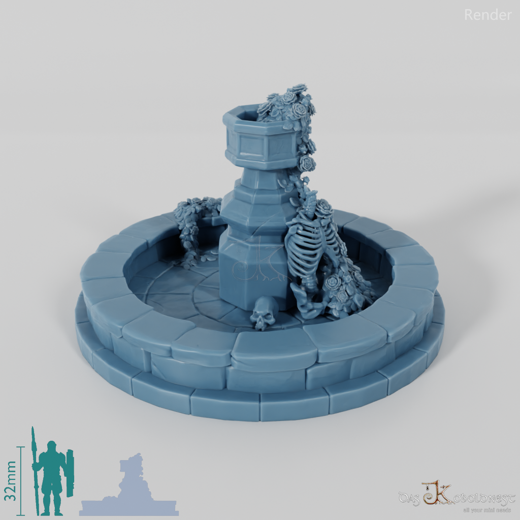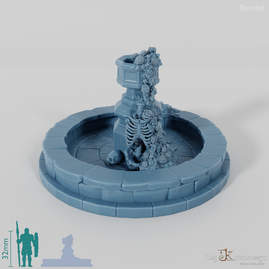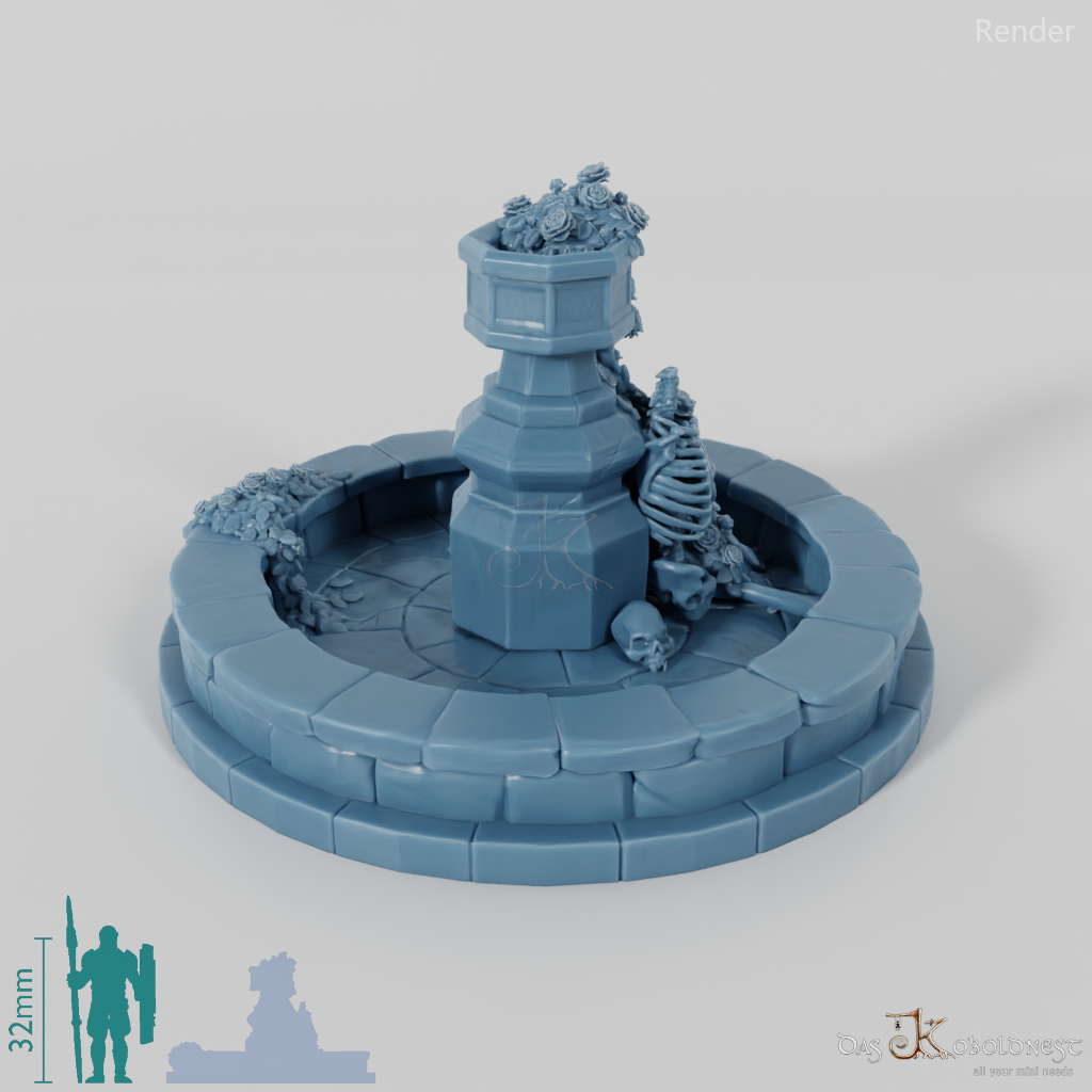 Wasserloser Brunnen in dessen Mitte eine Säule mit herabrankenden Rosen steht, an der ein halb überwuchertes Skelett lehnt