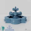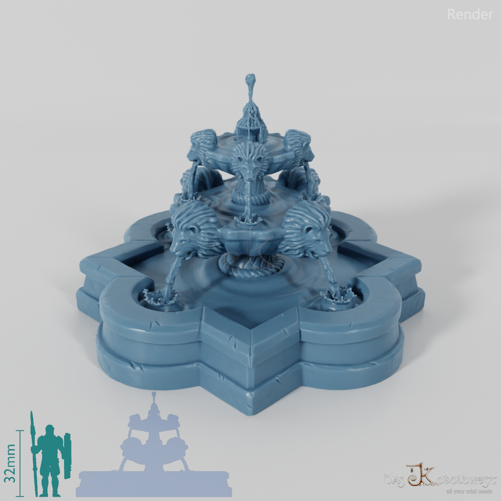 Großer, quadratischer Stadtbrunnen mit mehreren Etagen und acht Löwenköpfen als Wasserspeier