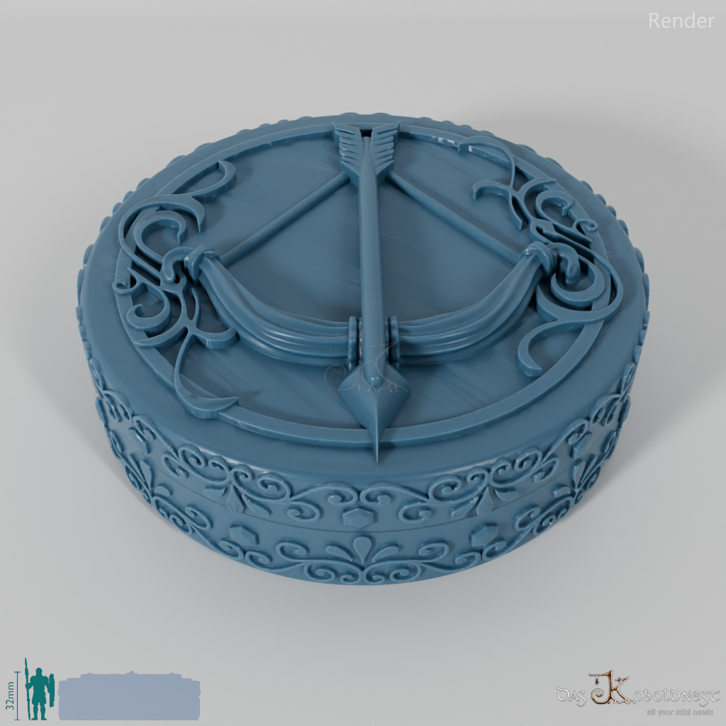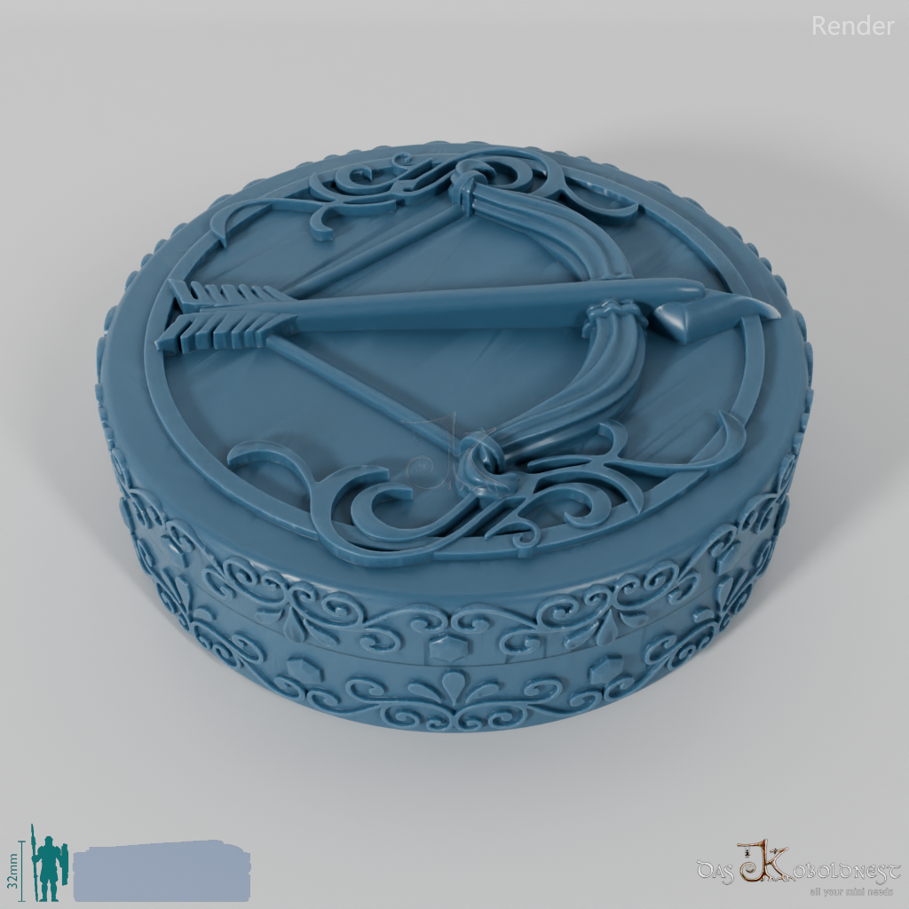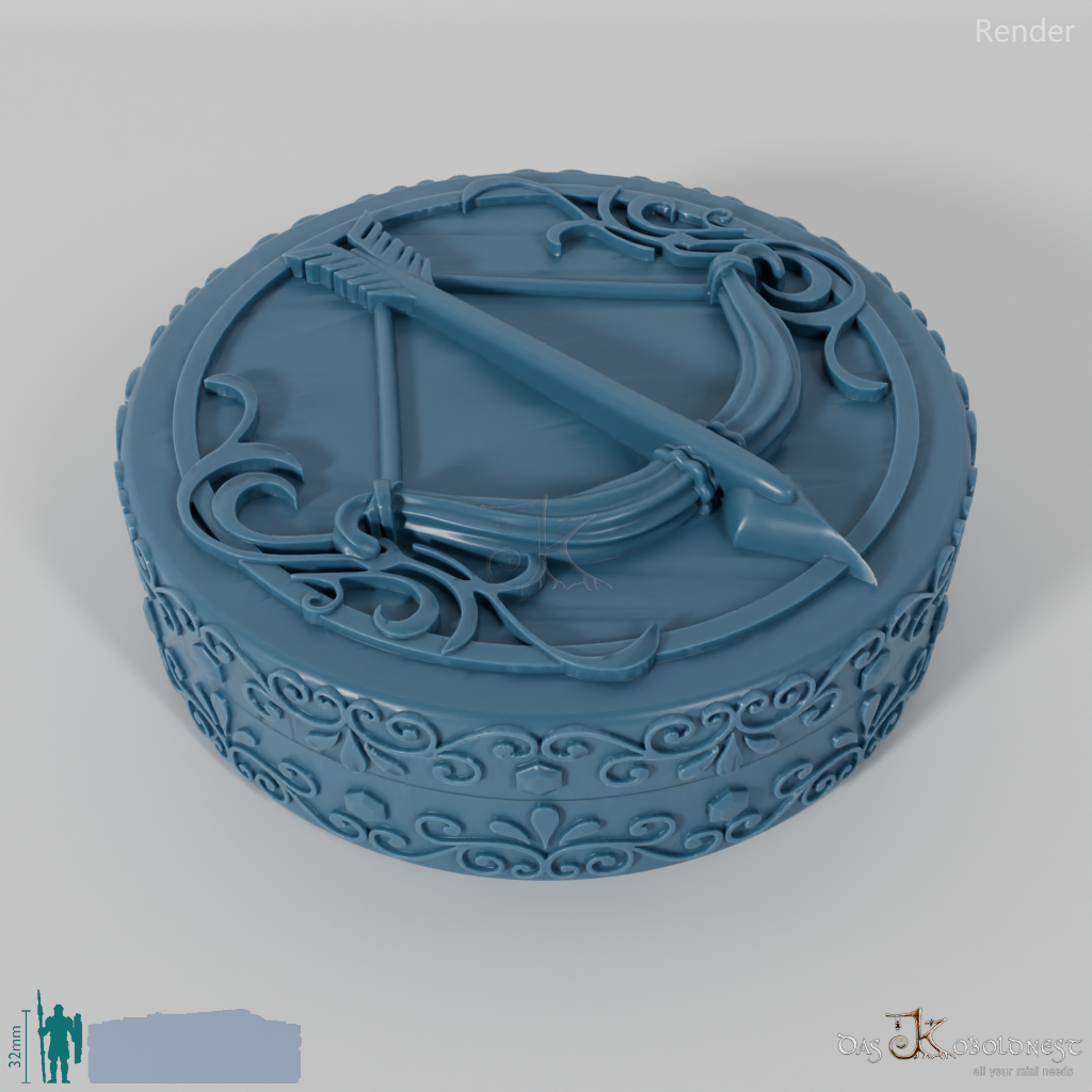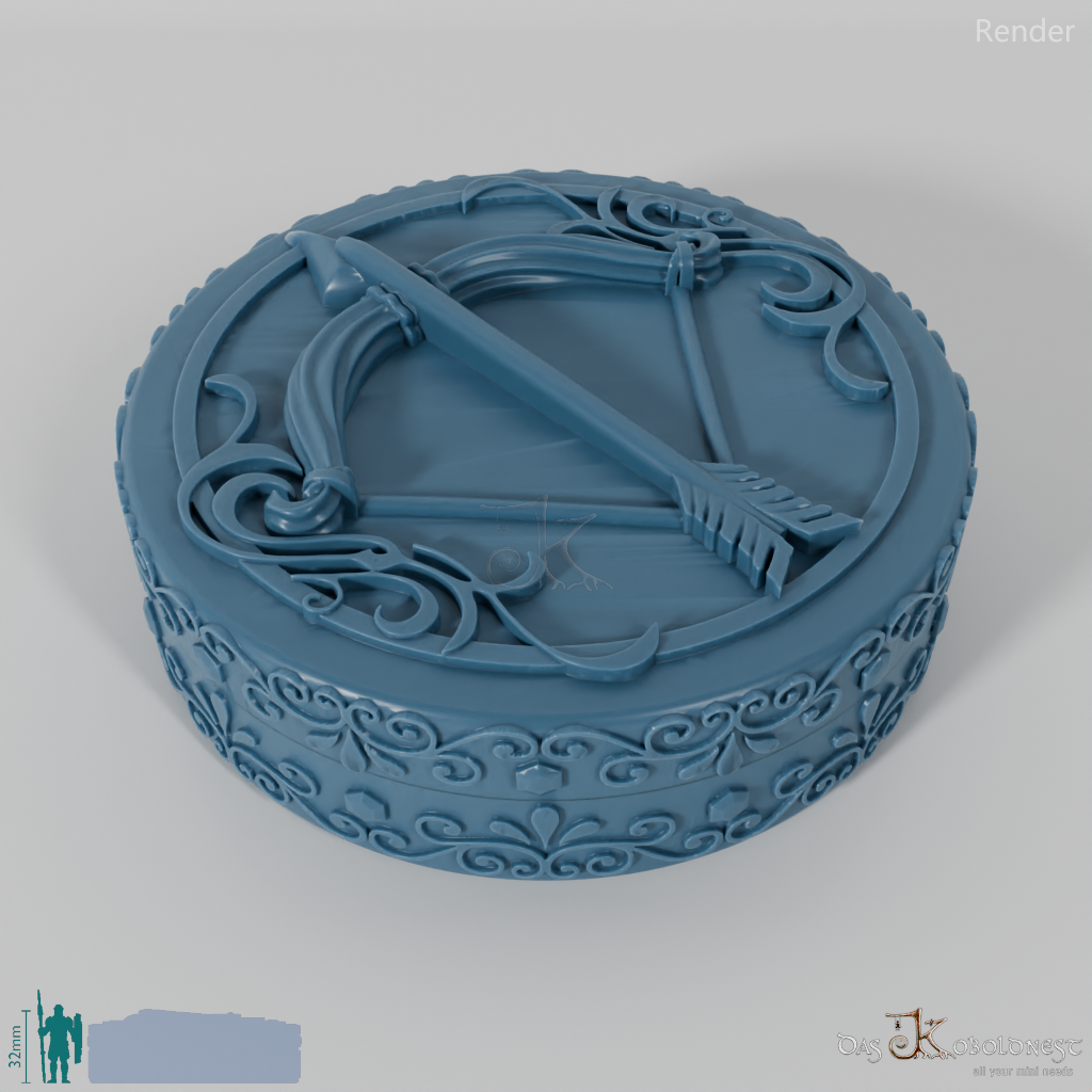 Verzierte Aufbewahrungsbox für sieben Würfel mit dem Relief eines gespannten Bogens auf dem Deckel.