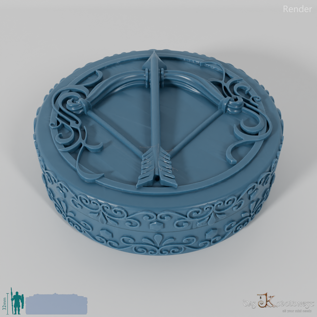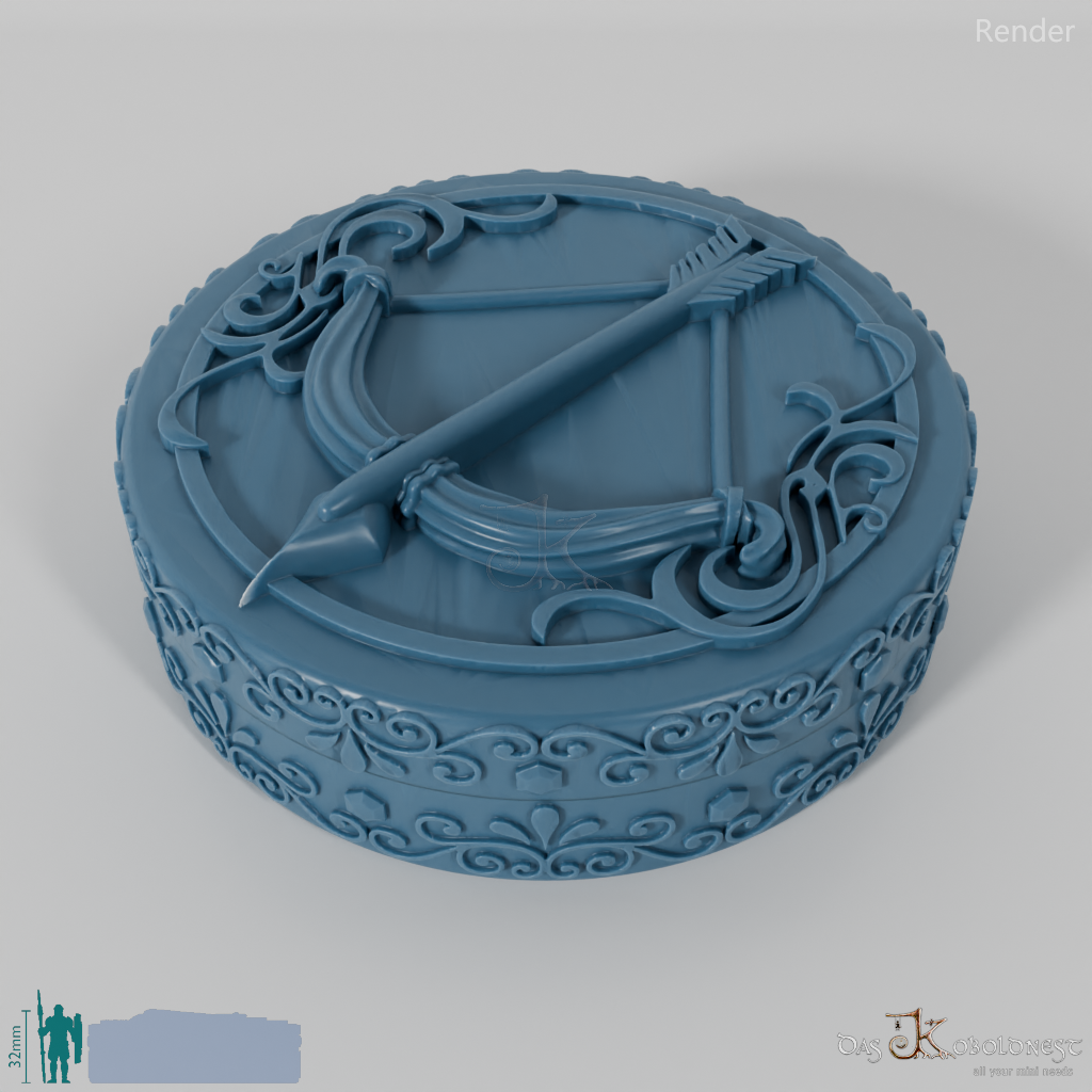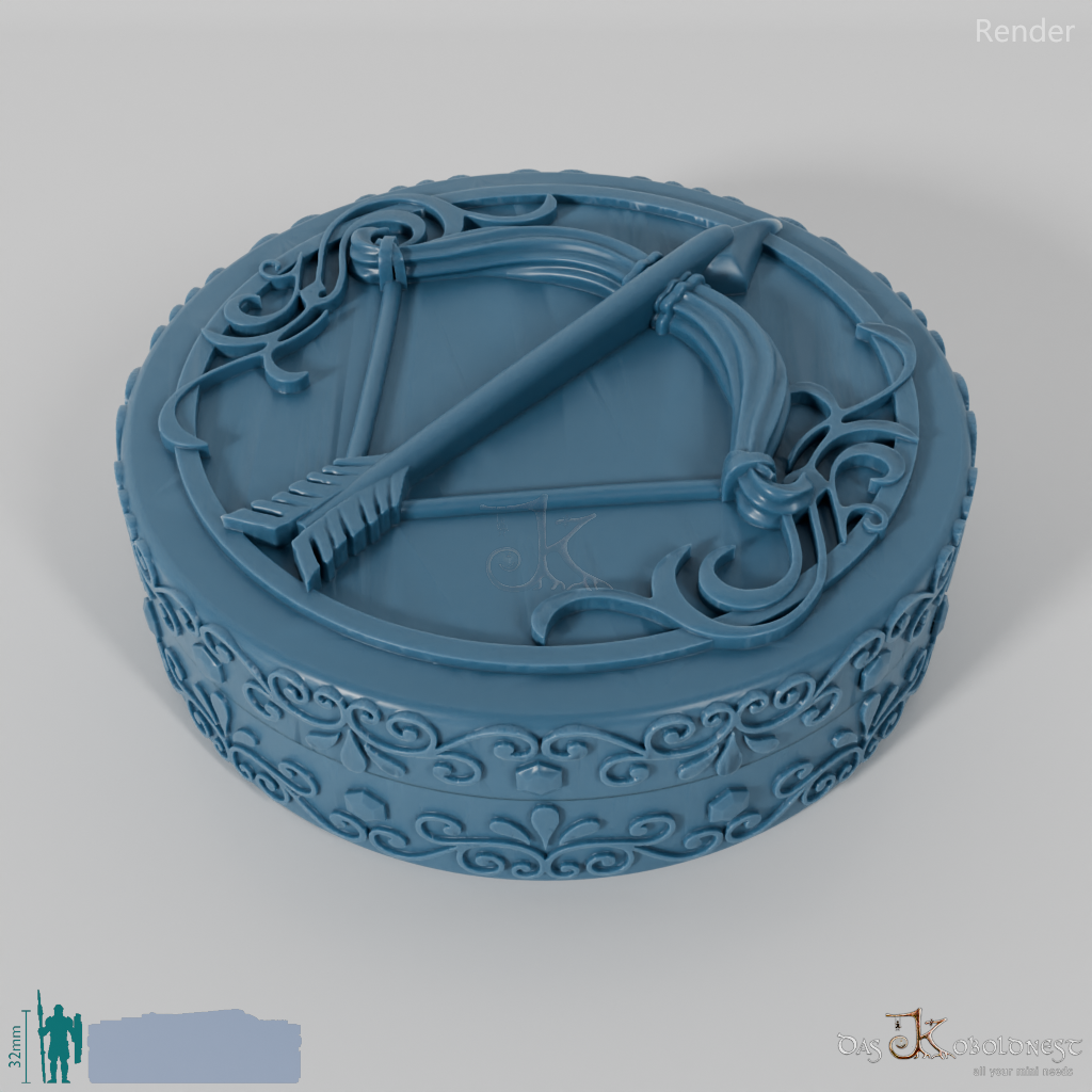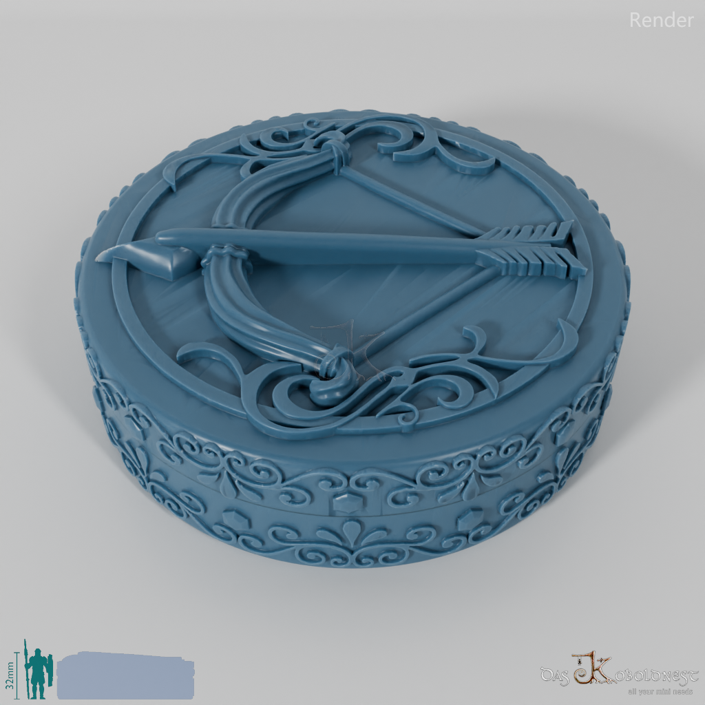 Verzierte Aufbewahrungsbox für sieben Würfel mit dem Relief eines gespannten Bogens auf dem Deckel.