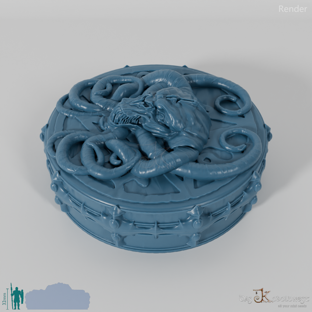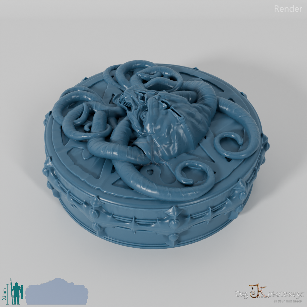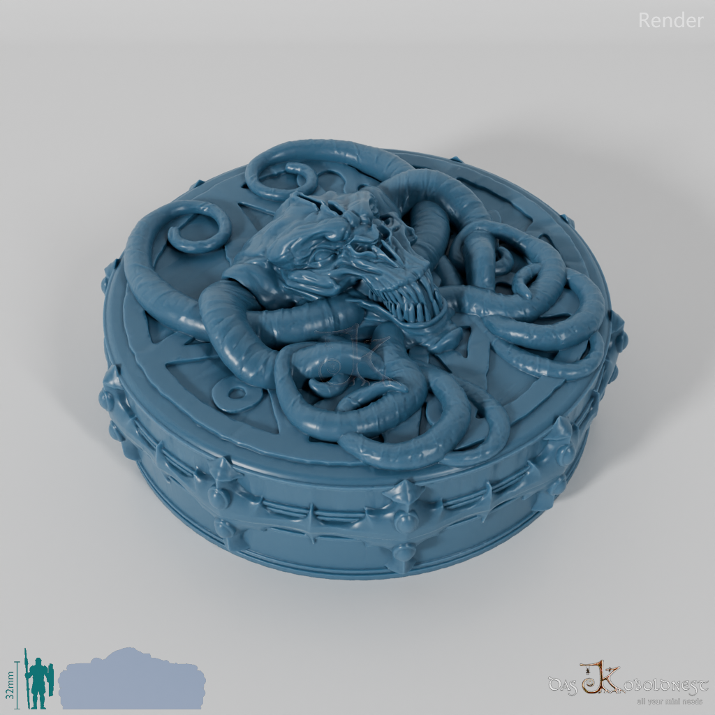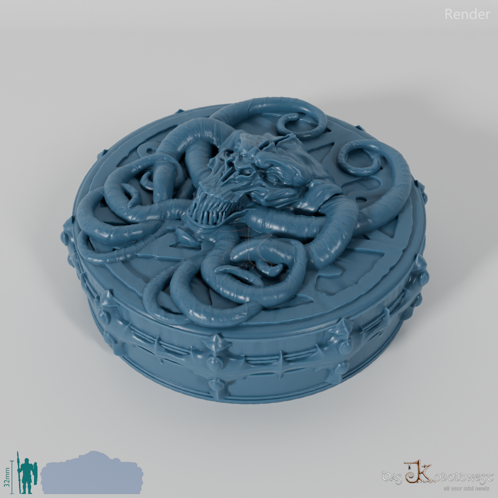 Verzierte Aufbewahrungsbox für sieben Würfel mit dem Relief eines düsteren Dämonenkopfes auf dem Deckel.