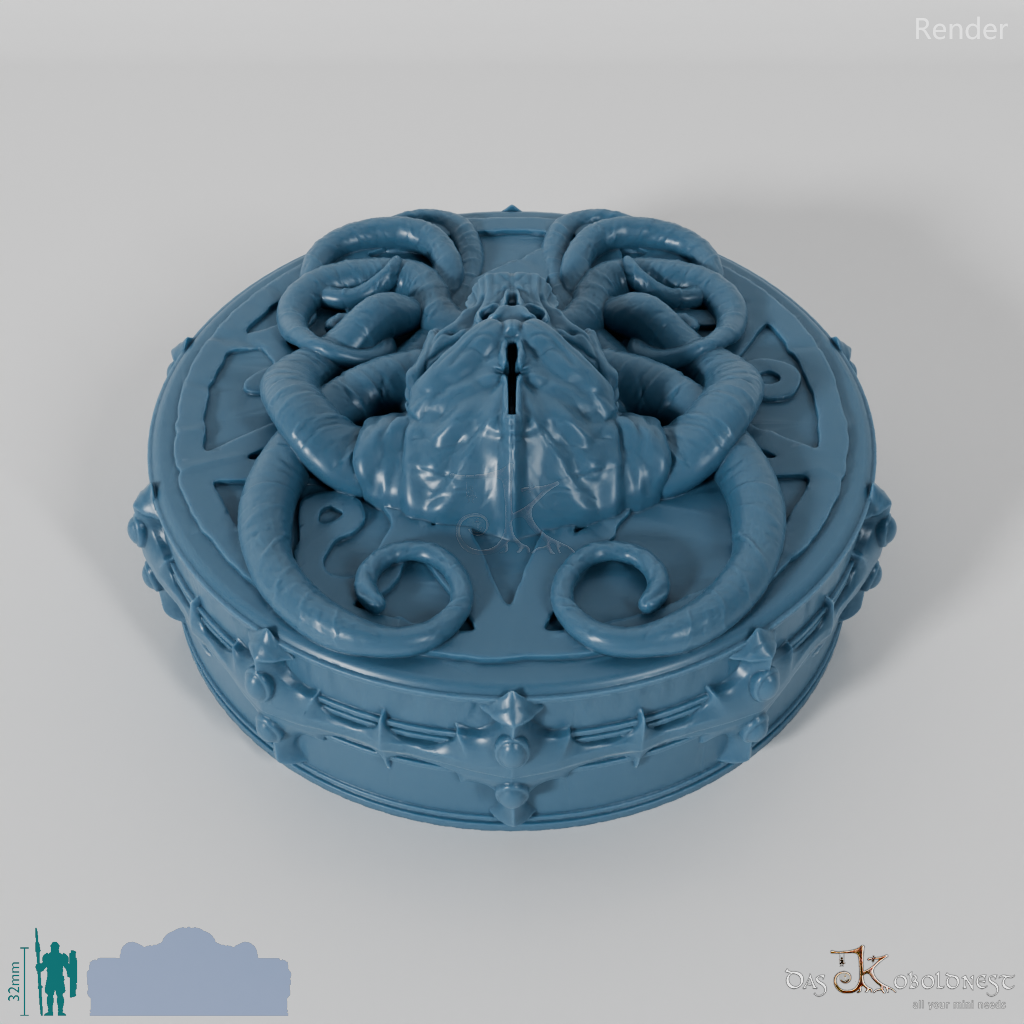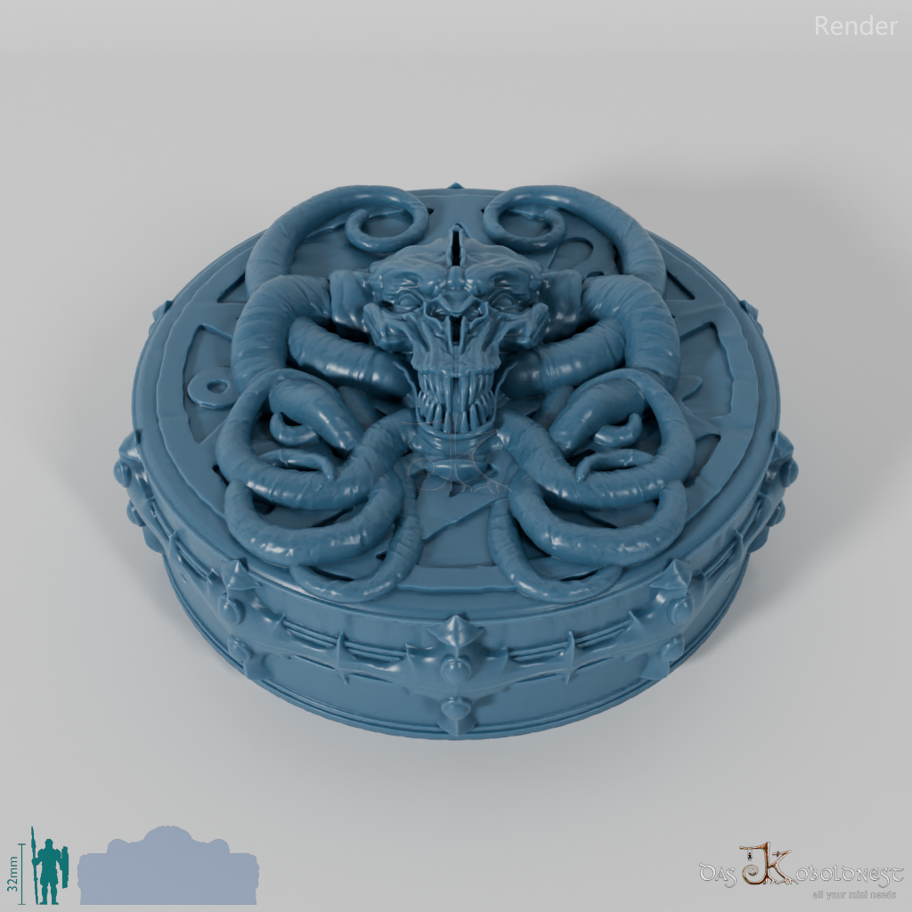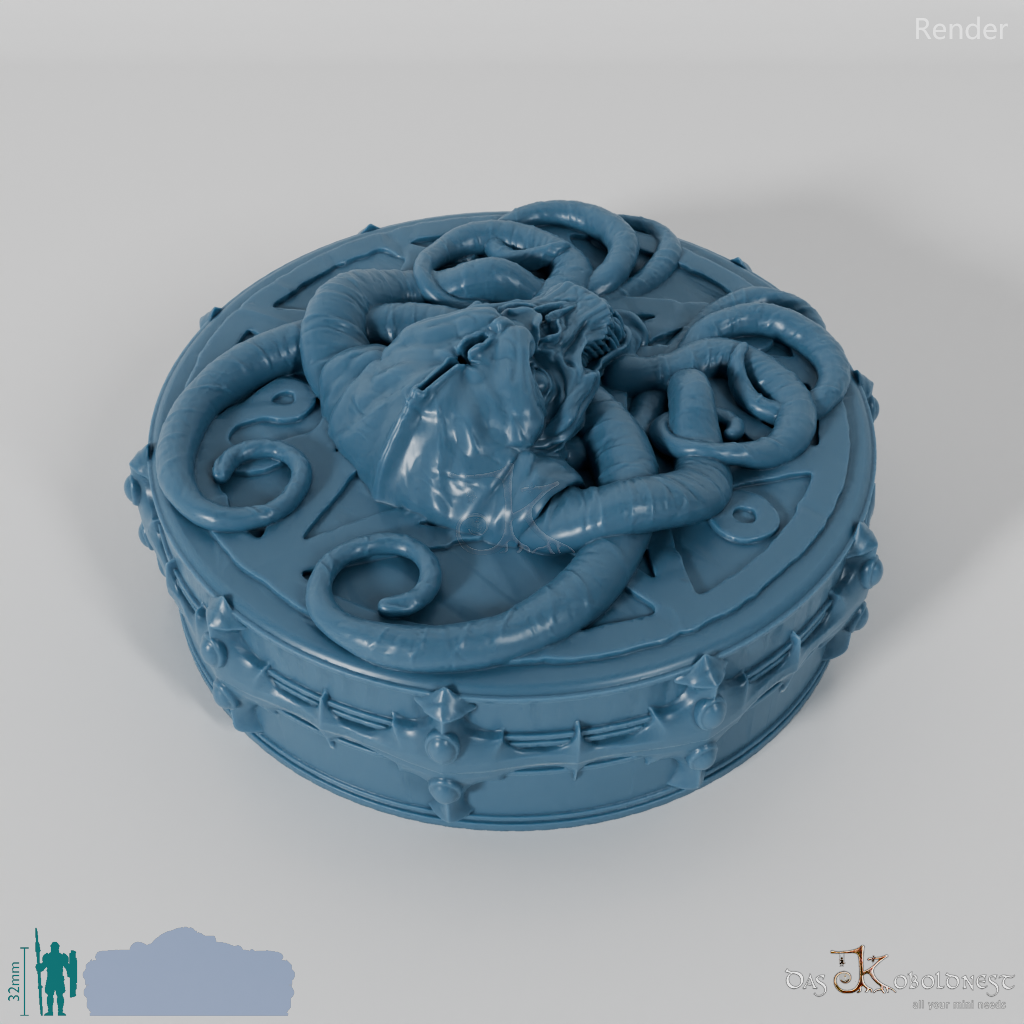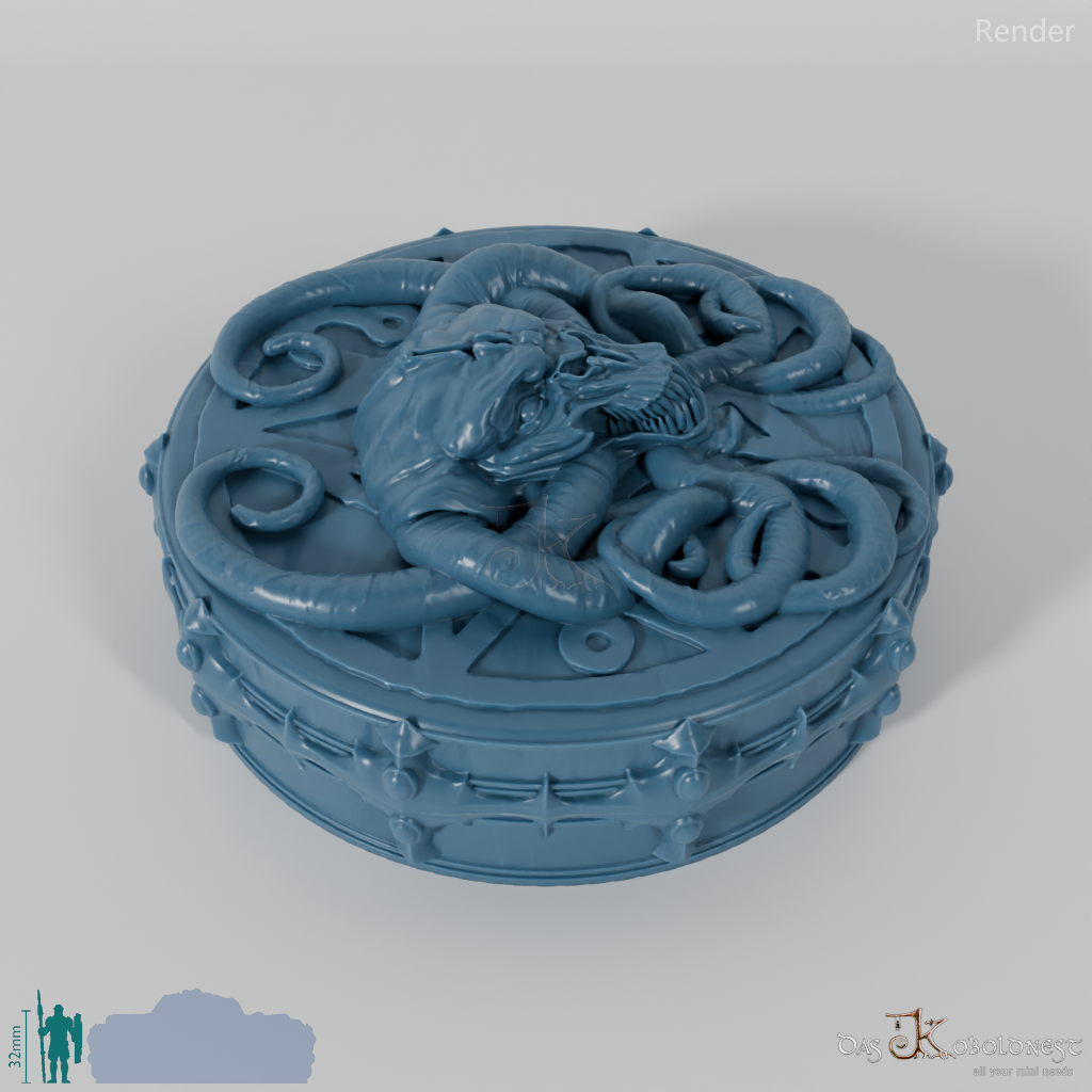 Verzierte Aufbewahrungsbox für sieben Würfel mit dem Relief eines düsteren Dämonenkopfes auf dem Deckel.