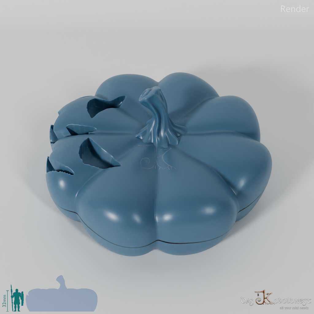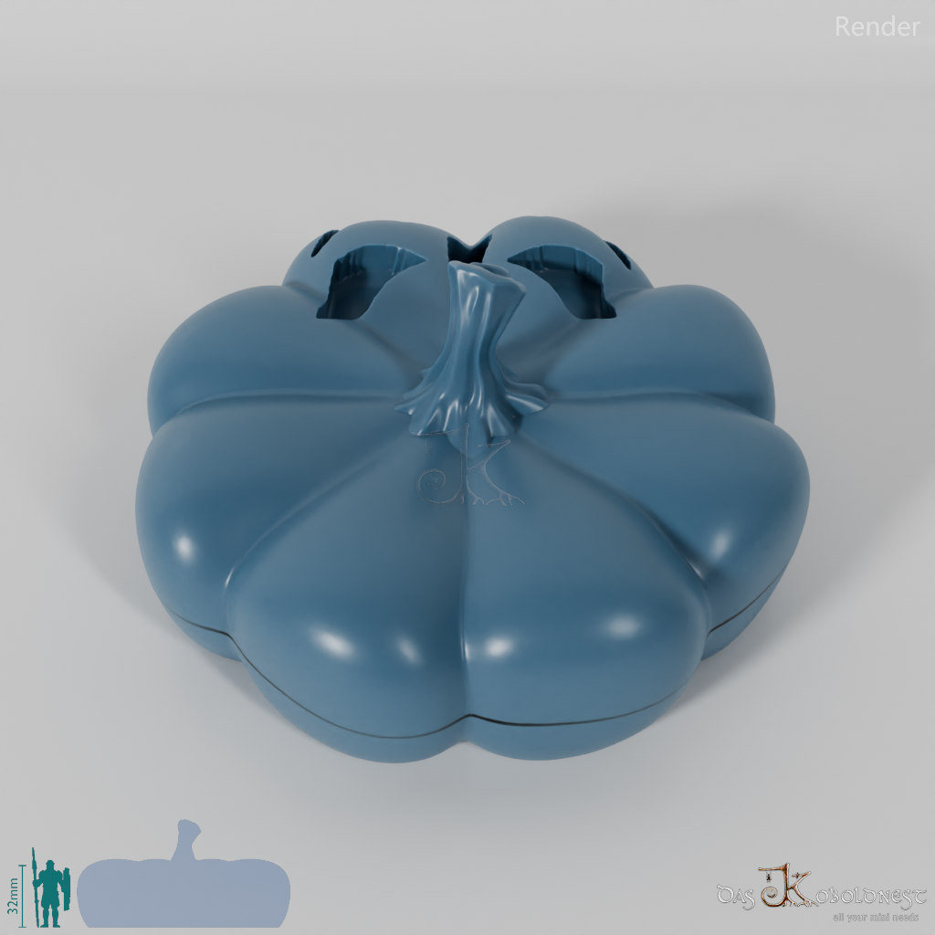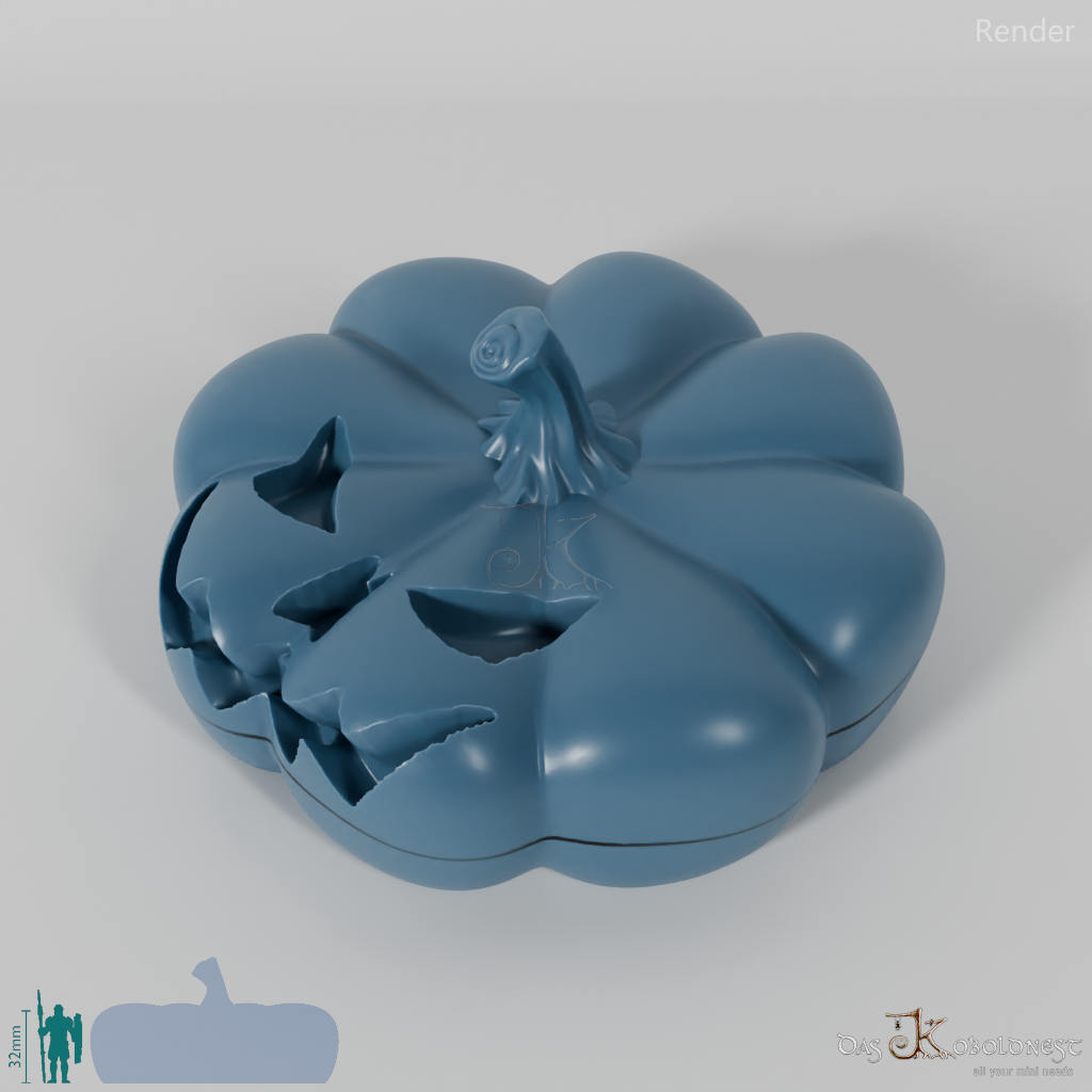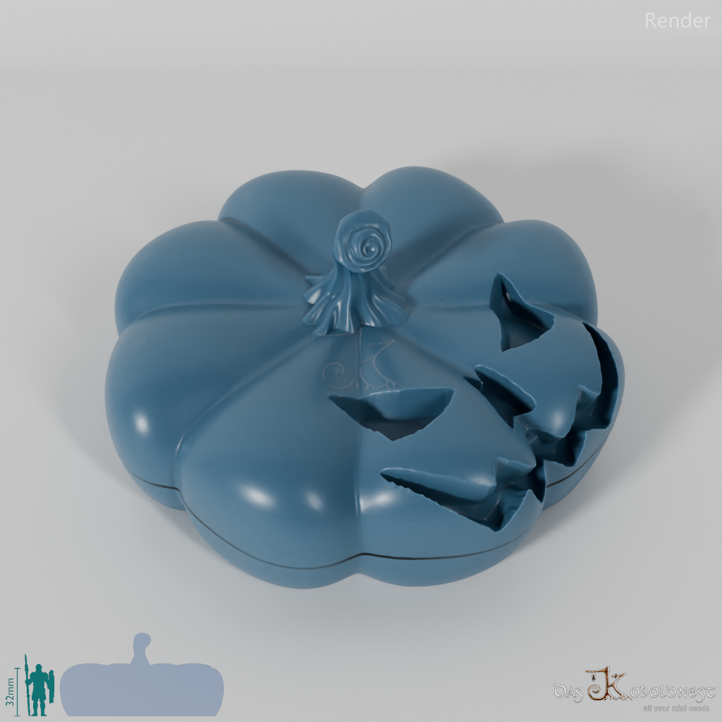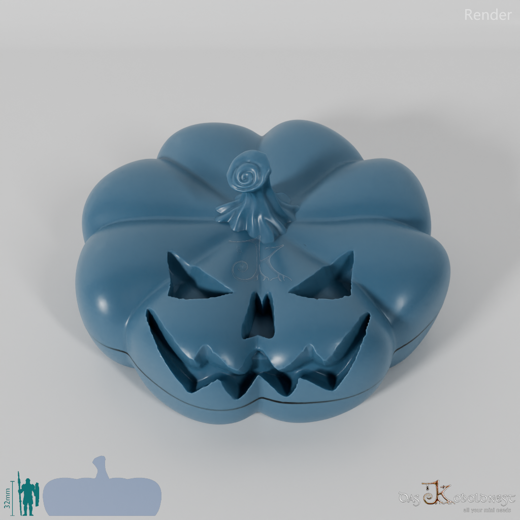 Verzierte Aufbewahrungsbox für sieben Würfel in Form eines Gruselkürbisses.