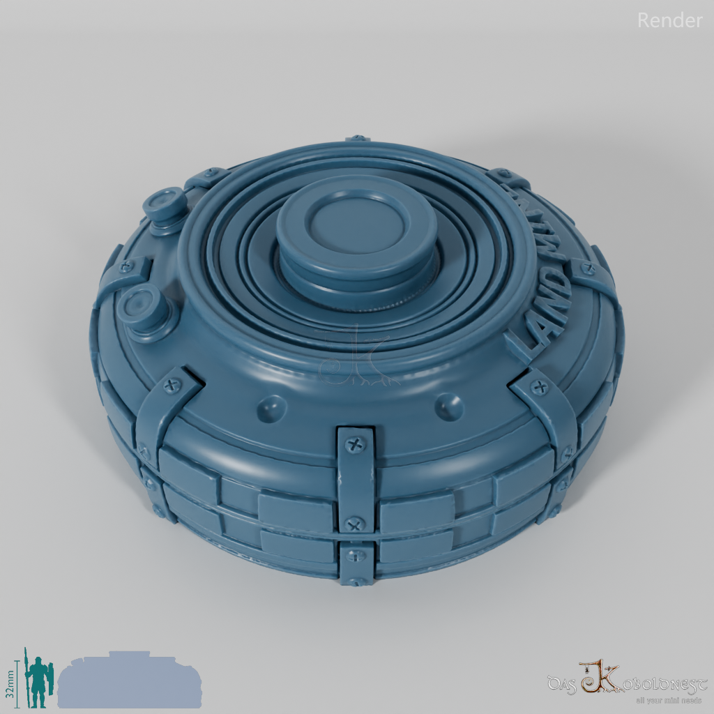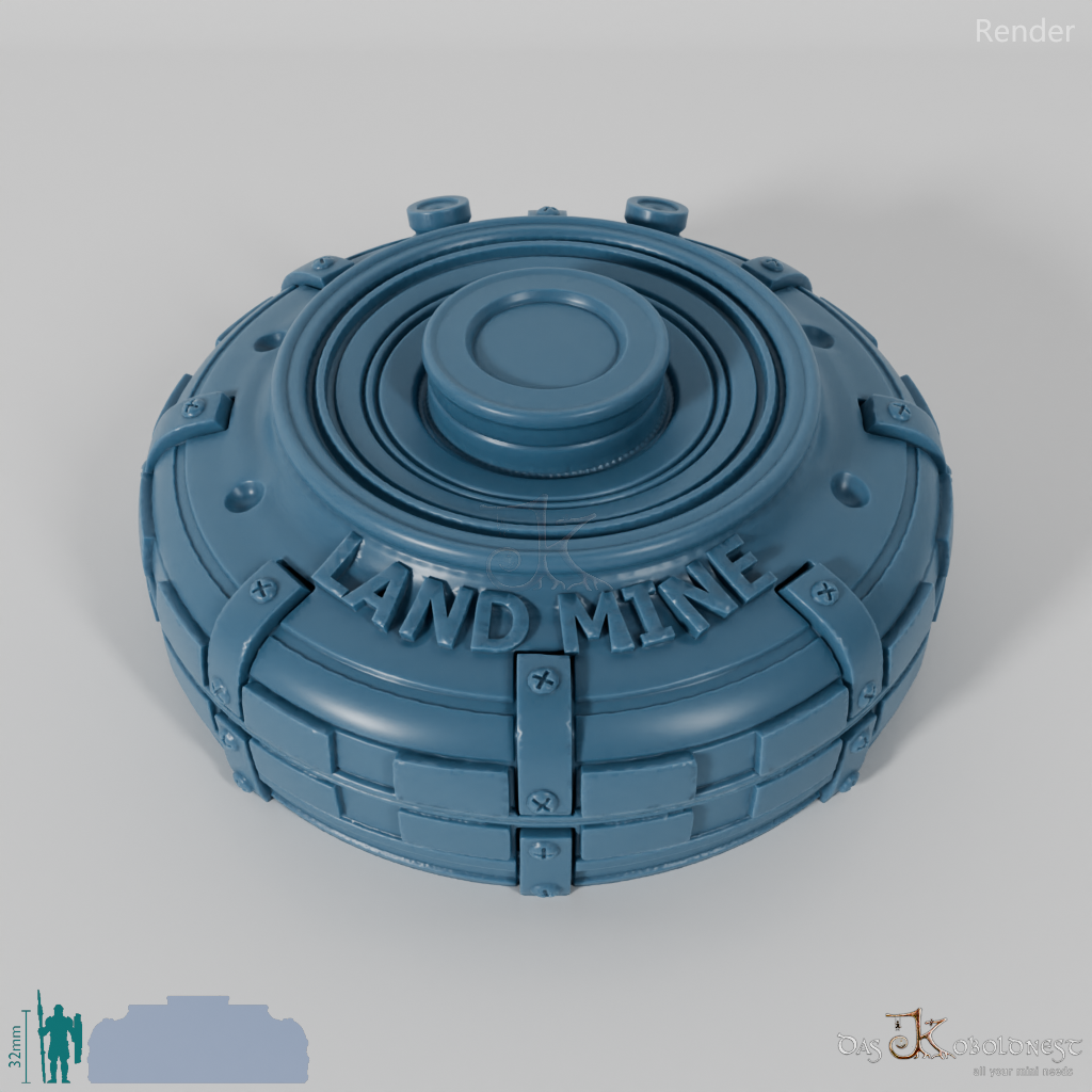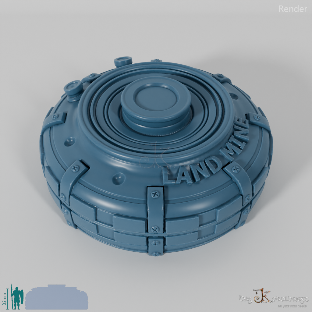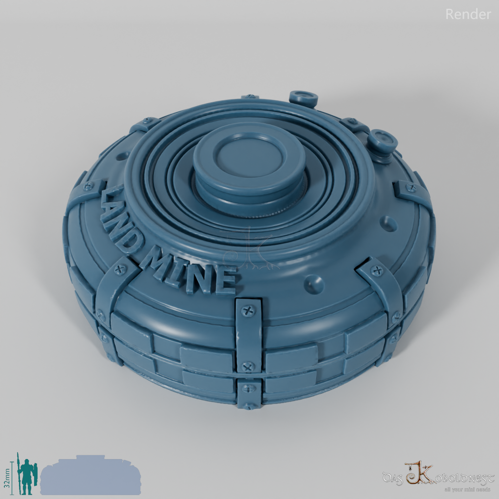 Verzierte Aufbewahrungsbox für sieben Würfel in Form einer Landmine mit der Aufschrift "Land Mine".