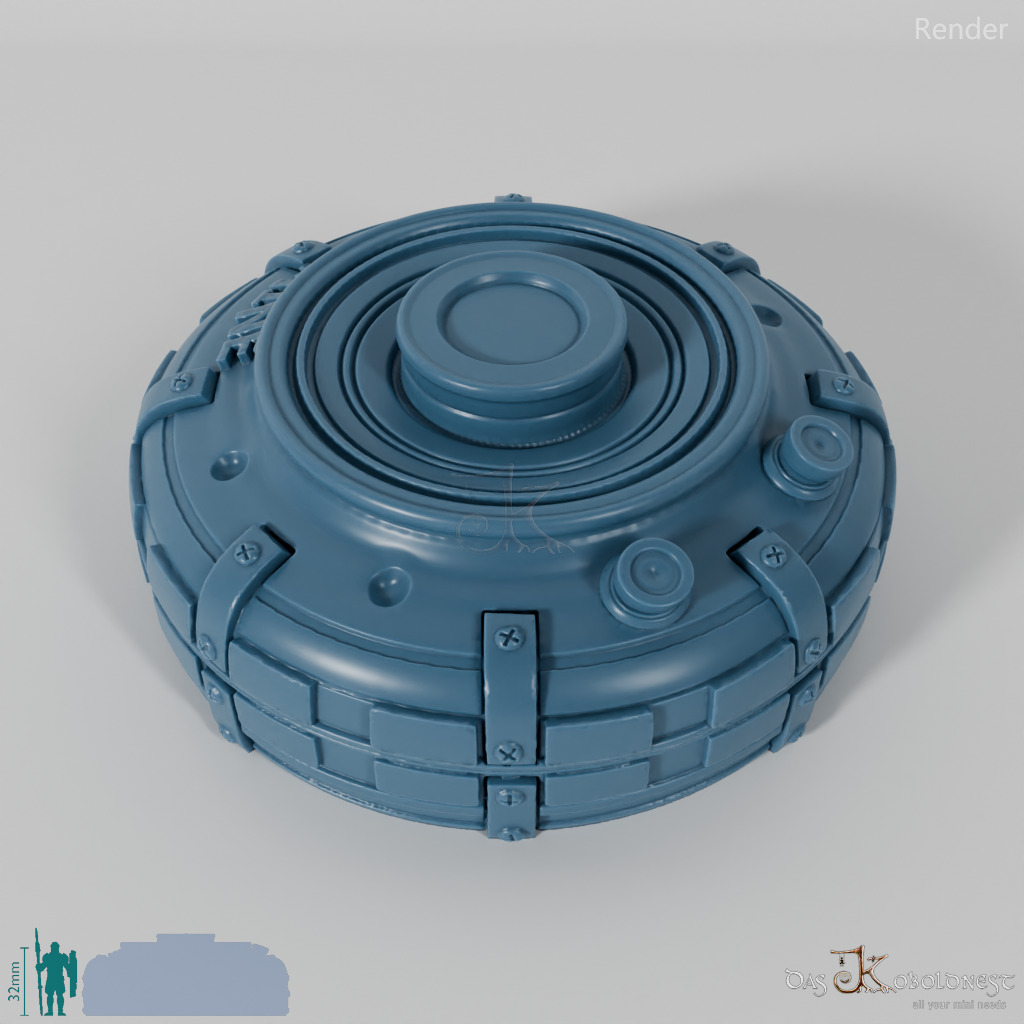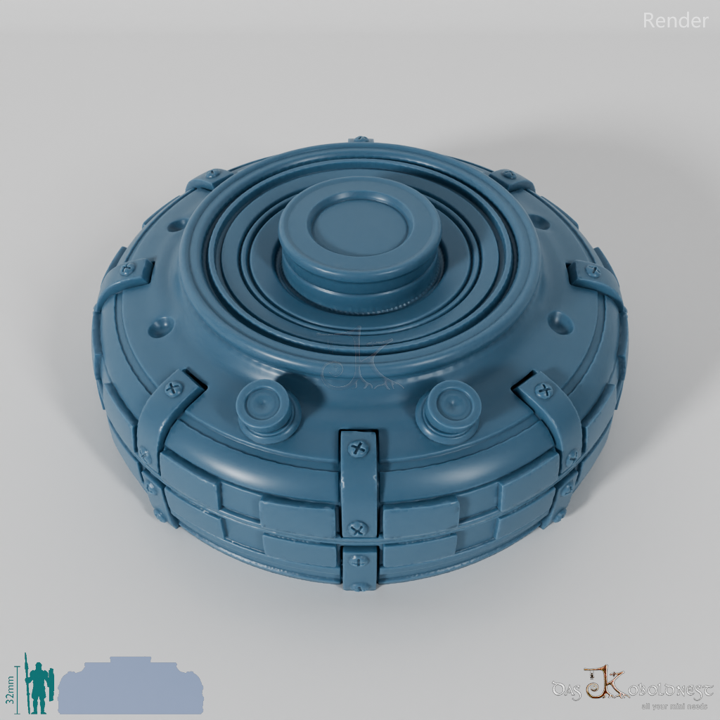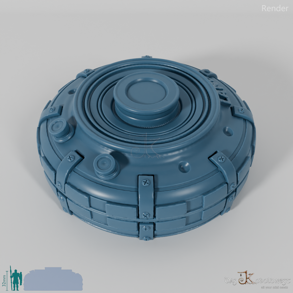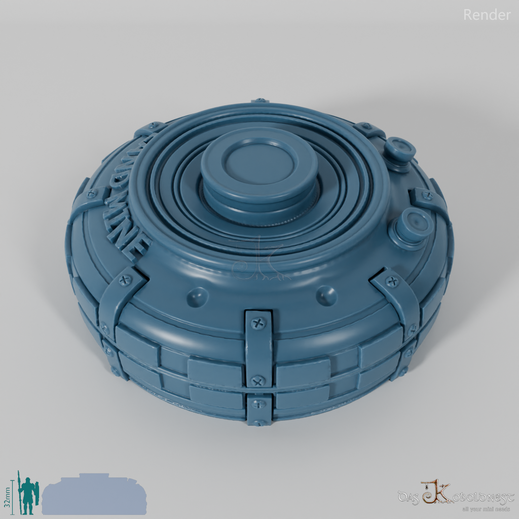 Verzierte Aufbewahrungsbox für sieben Würfel in Form einer Landmine mit der Aufschrift "Land Mine".