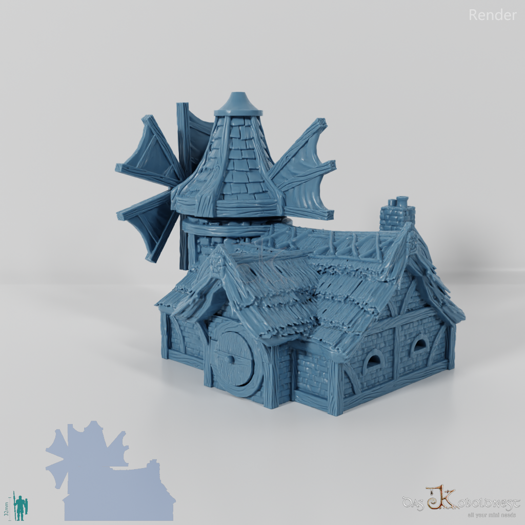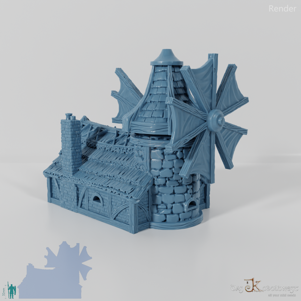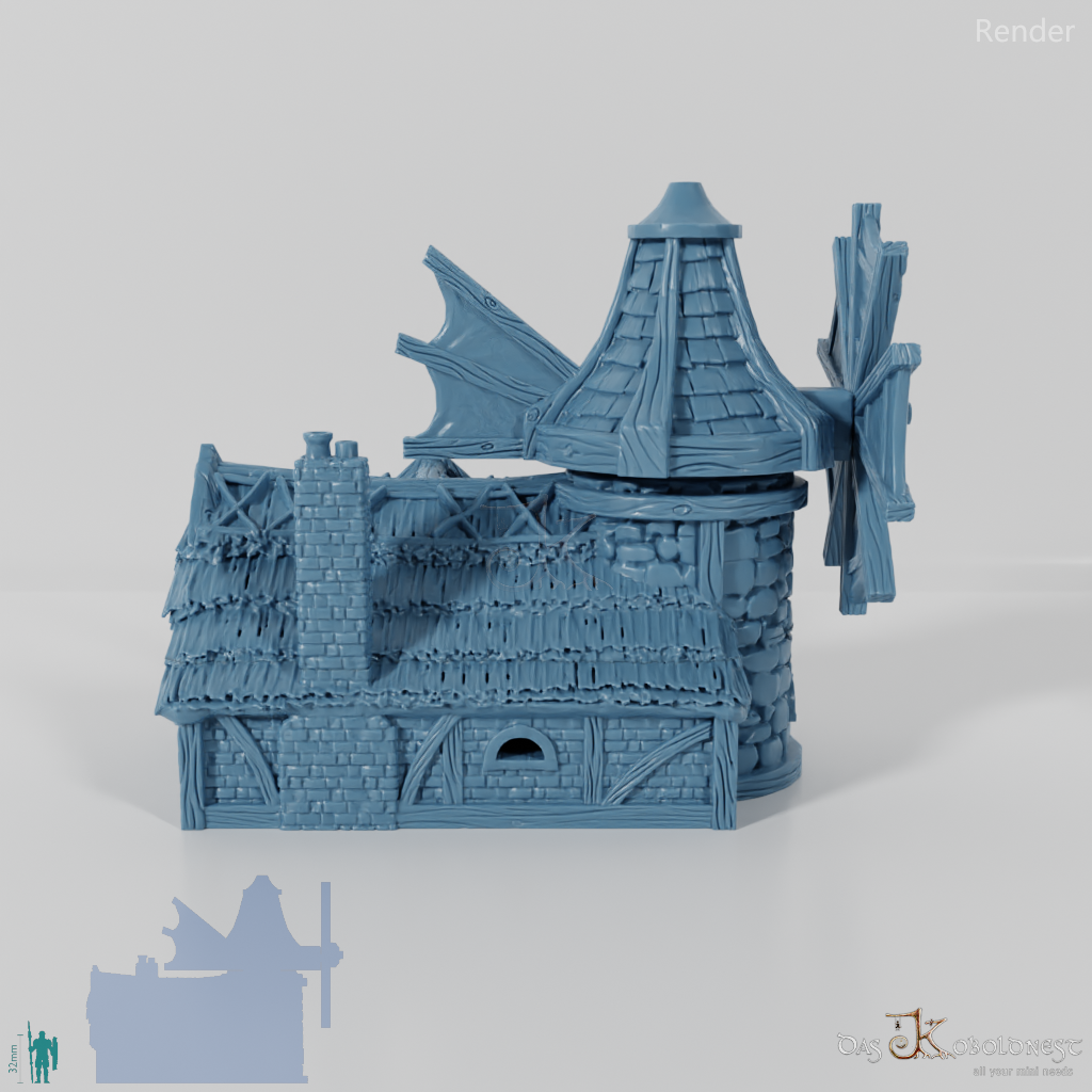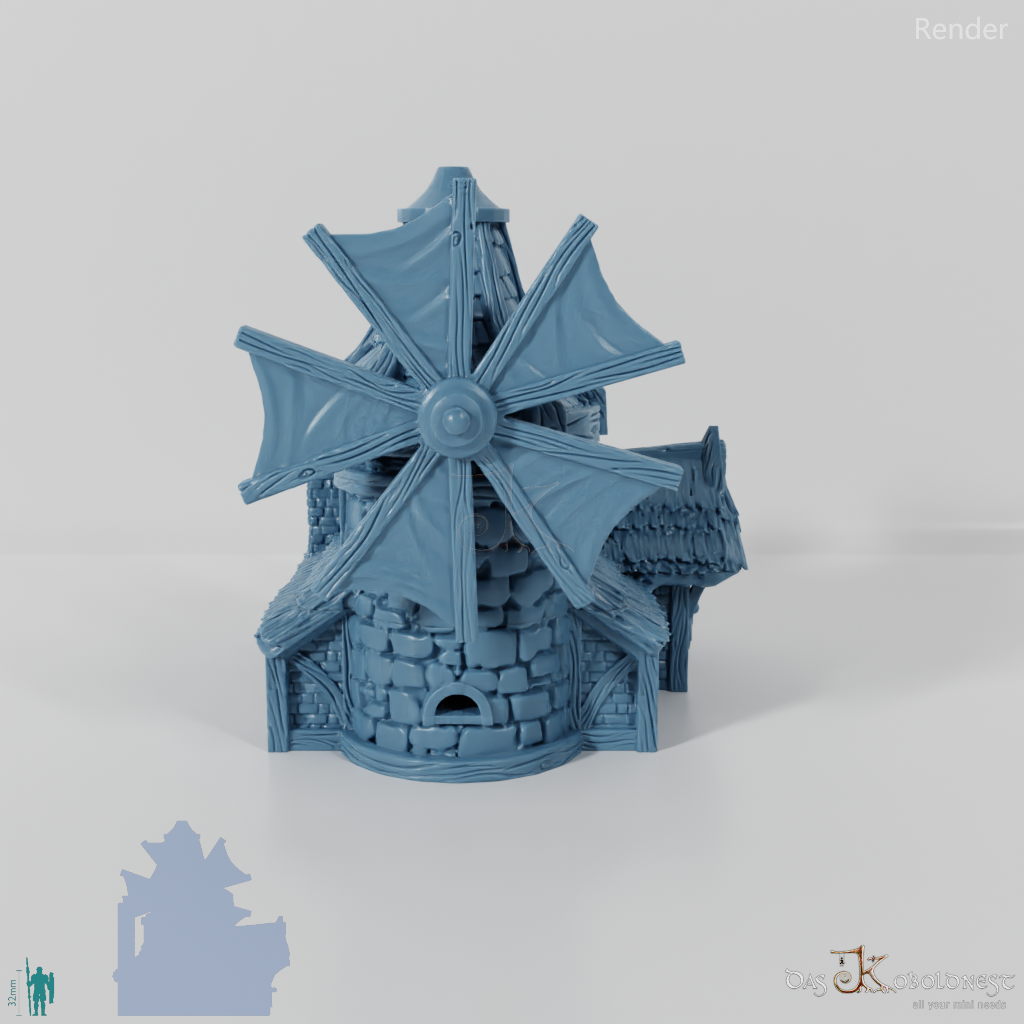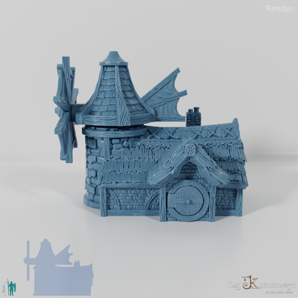 Aus Naturstein und Ziegeln gemauerte Windmühle in Halblinggröße mit runder Tür, frei rotierbarem Turm und rotierbaren Flügeln. Die Tür kann mit einem dünnen Holz- oder Metallstab so befestigt werden, dass sie auf- und zuschwingen kann. Dach und Turm sind abnehmbar und die Mühle somit voll bespielbar. Der Holzboden der Mühle hat im 32 mm Maßstab eine Feldgröße von genau einem Zoll. Maße 32 mm Maßstab: Grundfläche 12,4 x 14,4 cm, Höhe ohne Turm 9,1 cm, mit Turm 15,3 cm Maße 28 mm Maßstab: Grundfläche 10,8 x 12,6 cm, Höhe ohne Turm 8 cm, mit Turm 13,4 cm Model by DarkRealms