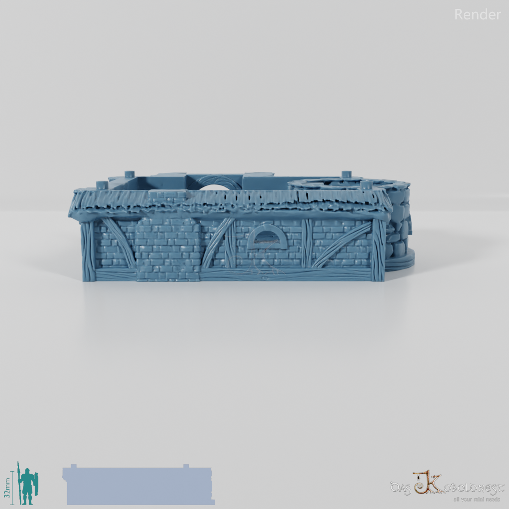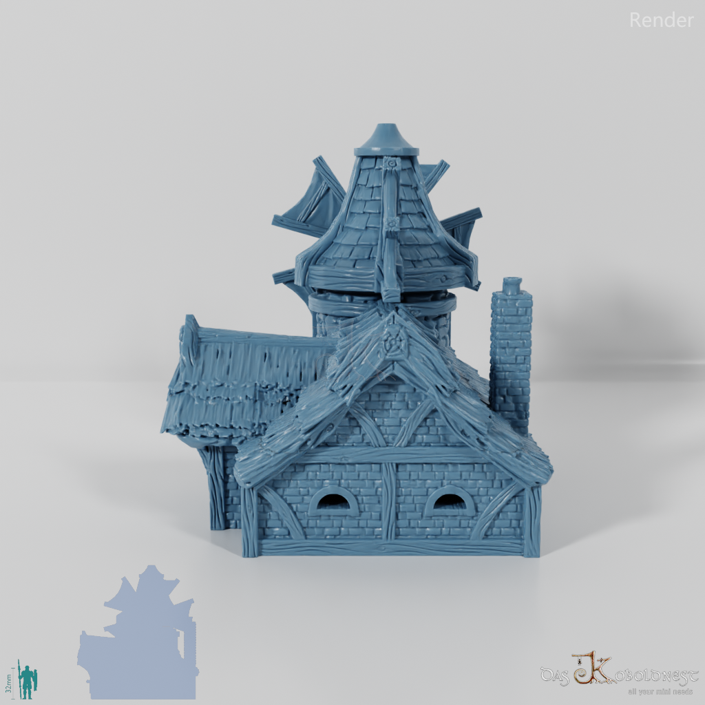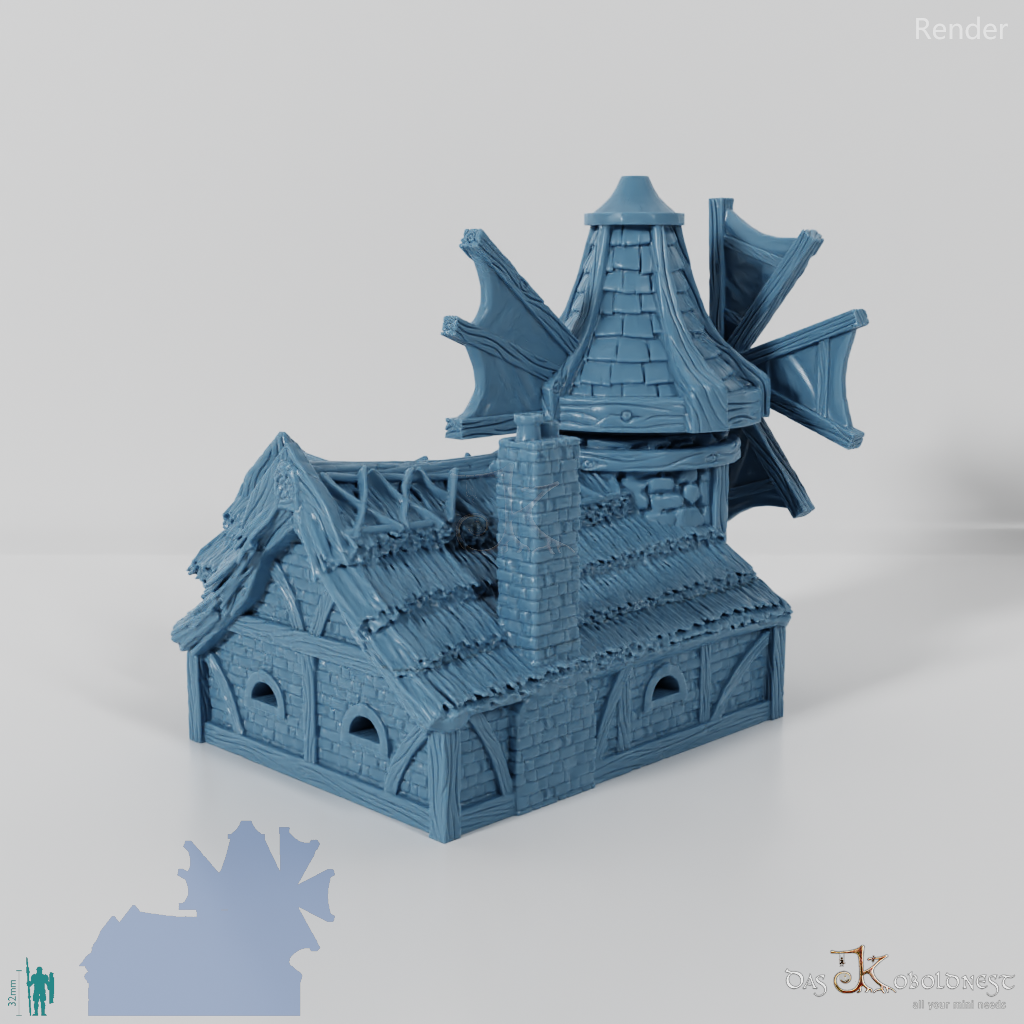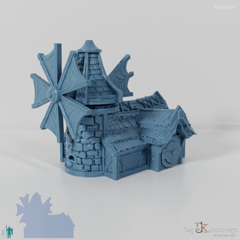 Aus Naturstein und Ziegeln gemauerte Windmühle in Halblinggröße mit runder Tür, frei rotierbarem Turm und rotierbaren Flügeln. Die Tür kann mit einem dünnen Holz- oder Metallstab so befestigt werden, dass sie auf- und zuschwingen kann. Dach und Turm sind abnehmbar und die Mühle somit voll bespielbar. Der Holzboden der Mühle hat im 32 mm Maßstab eine Feldgröße von genau einem Zoll. Maße 32 mm Maßstab: Grundfläche 12,4 x 14,4 cm, Höhe ohne Turm 9,1 cm, mit Turm 15,3 cm Maße 28 mm Maßstab: Grundfläche 10,8 x 12,6 cm, Höhe ohne Turm 8 cm, mit Turm 13,4 cm Model by DarkRealms