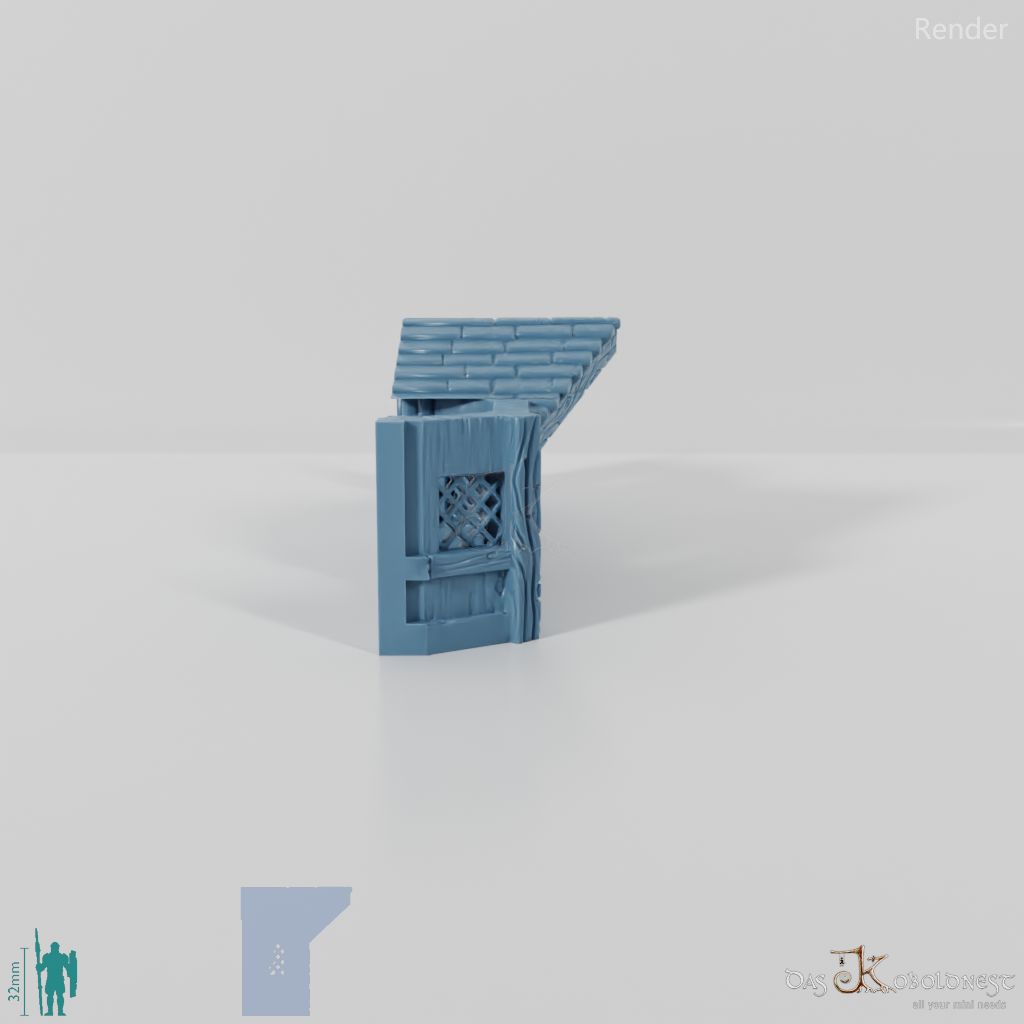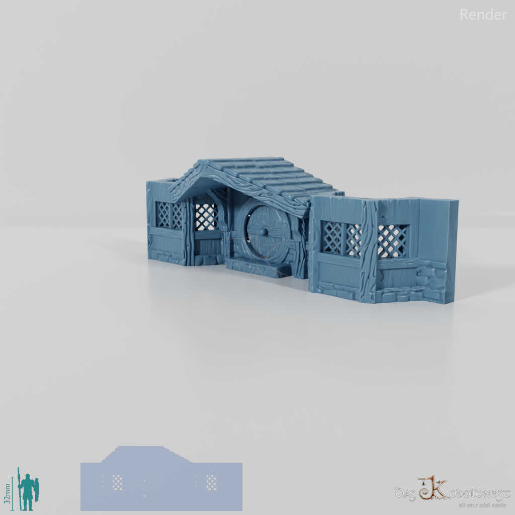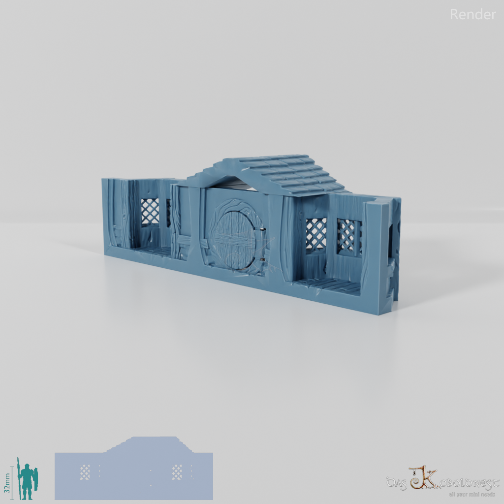 Hausfassade für eine Halblingshöhle mit zwei Erkern und runder, überdachter Eingangstür. Die Haustür kann mit einem dünnen Holz- oder Metallstab so befestigt werden, dass sie auf- und zuschwingen kann. Alternative Türen sind hier zu finden. Maße 32 mm Maßstab: Ca. 19,5 cm Breite, 4,3 cm Tiefe, 6cm Höhe Maße 28 mm Maßstab: Ca. 17 cm Breite, 3,7 cm Tiefe, 5,2 cm Höhe Model by DarkRealms