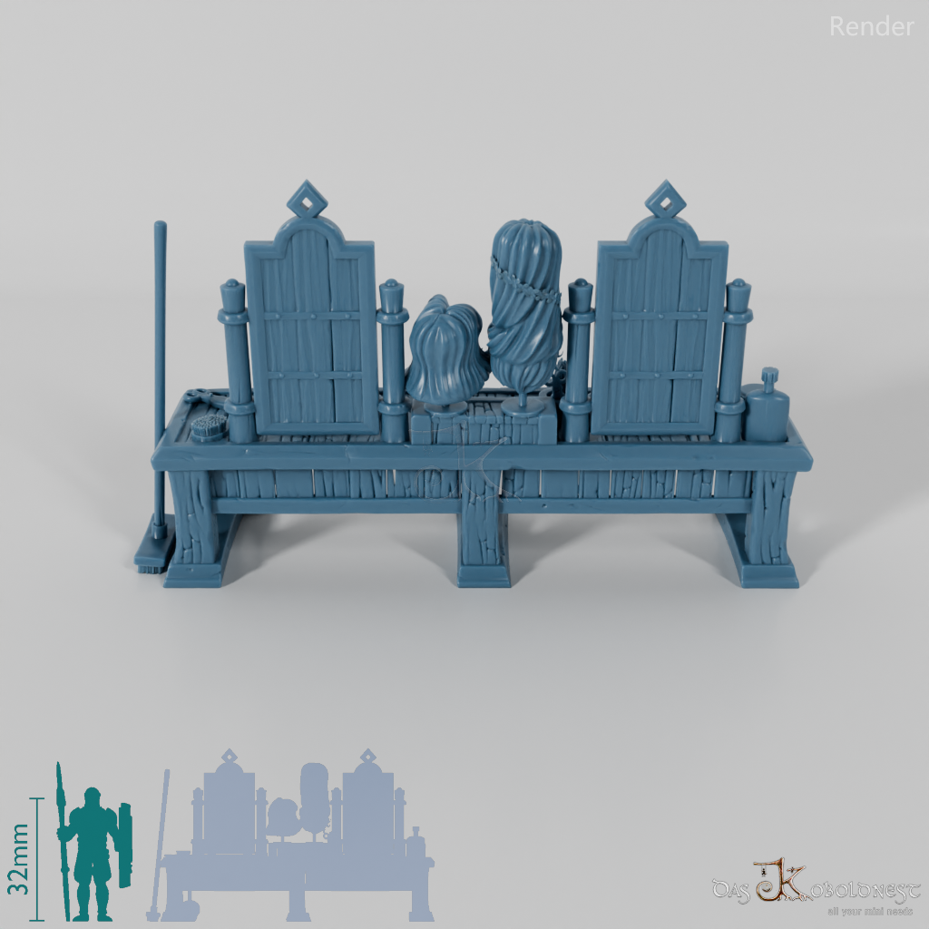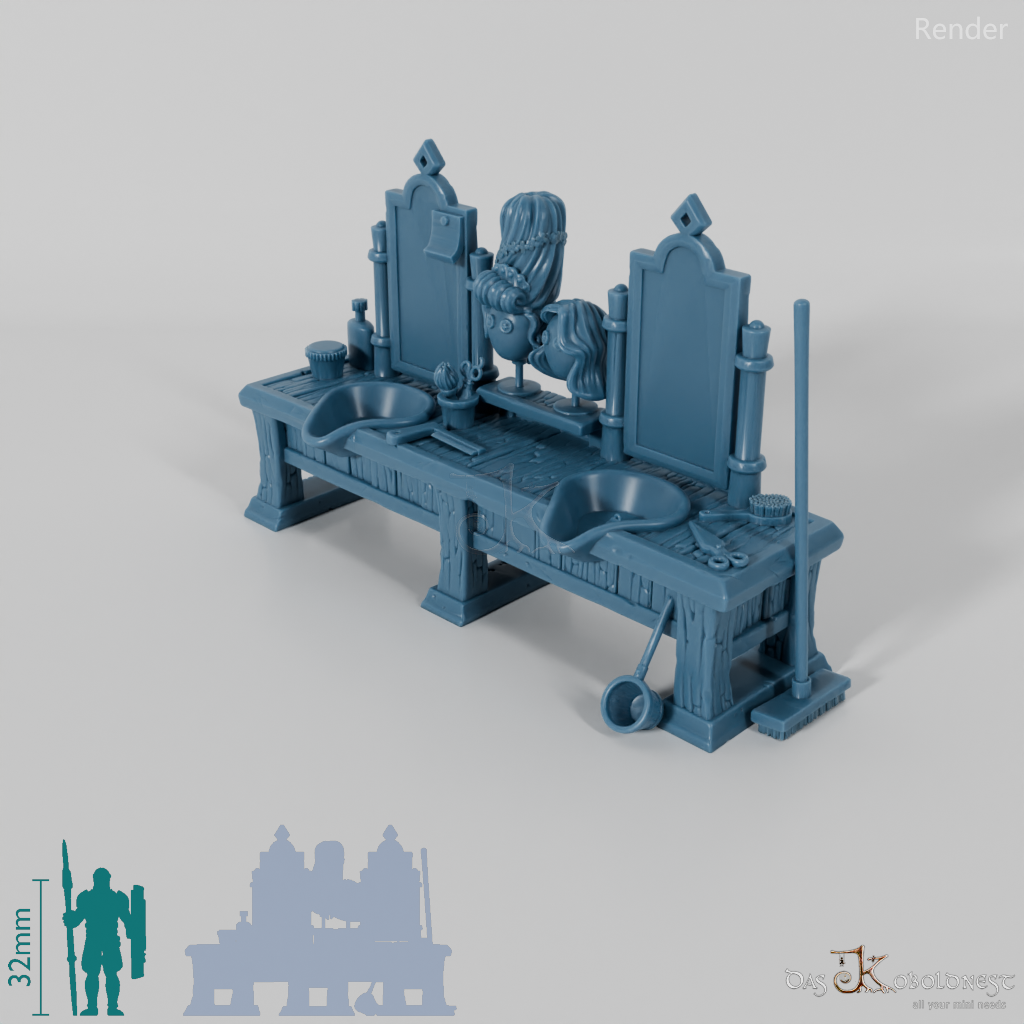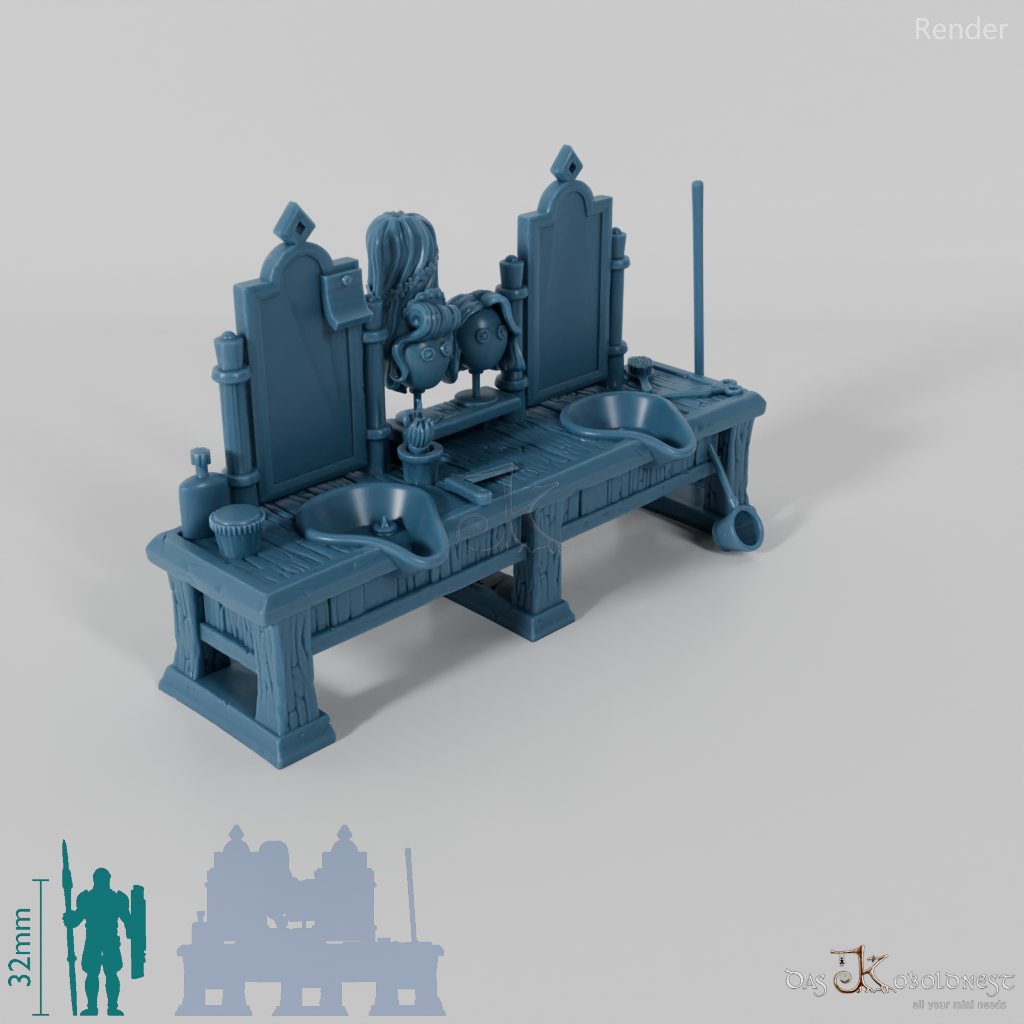 Eine doppelte Waschstation, komplett mit zwei Waschbecken, Spiegeln und zusätzlichen Puppenköpfen mit Perücken. Diese Waschstation ist ein ästhetisches Highlight, das jedem Friseursalon-Diorama Tiefe und rustikalen Realismus verleiht.