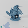 Massiger Drache mit Flügelmembranen an den Vorderbeinen, der mit massiven Metallplatten gerüstet ist und einen Bolzenwerfer auf dem Rücken trägt