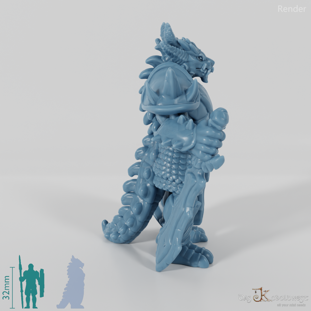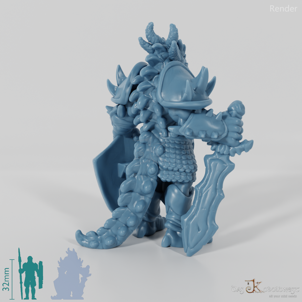 Humanoider Drache in Plattenrüstung mit Schwert und Schild bewaffnet
