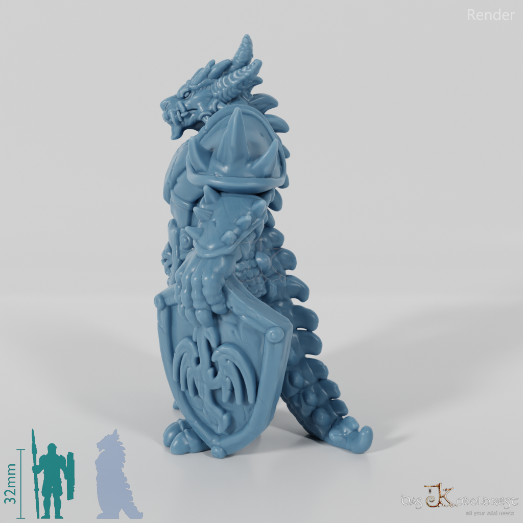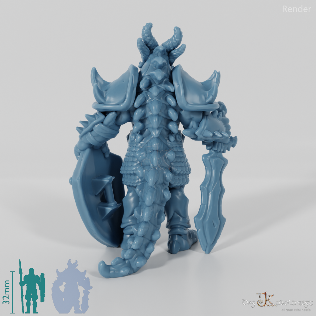 Spärlich bekleideter humanoider Drache mit Schwert in einer, Flamme in der anderen Hand