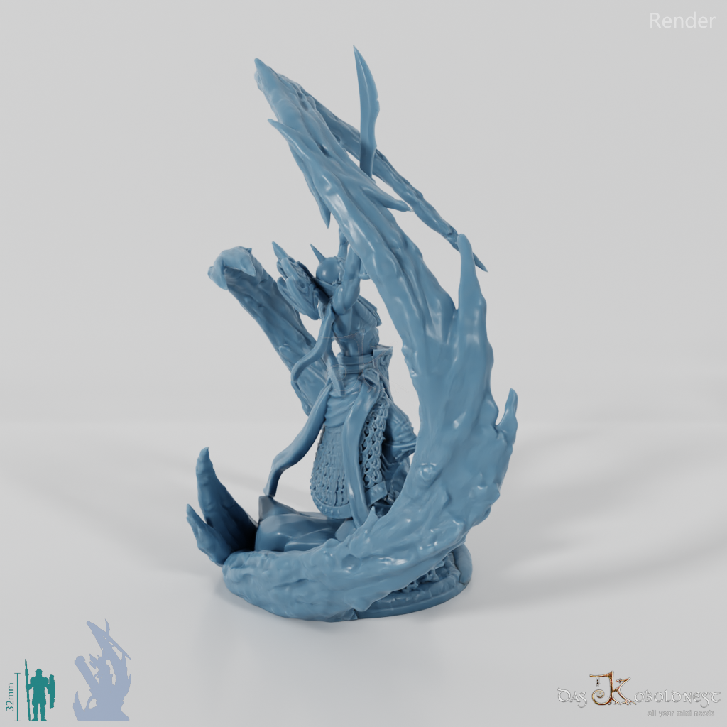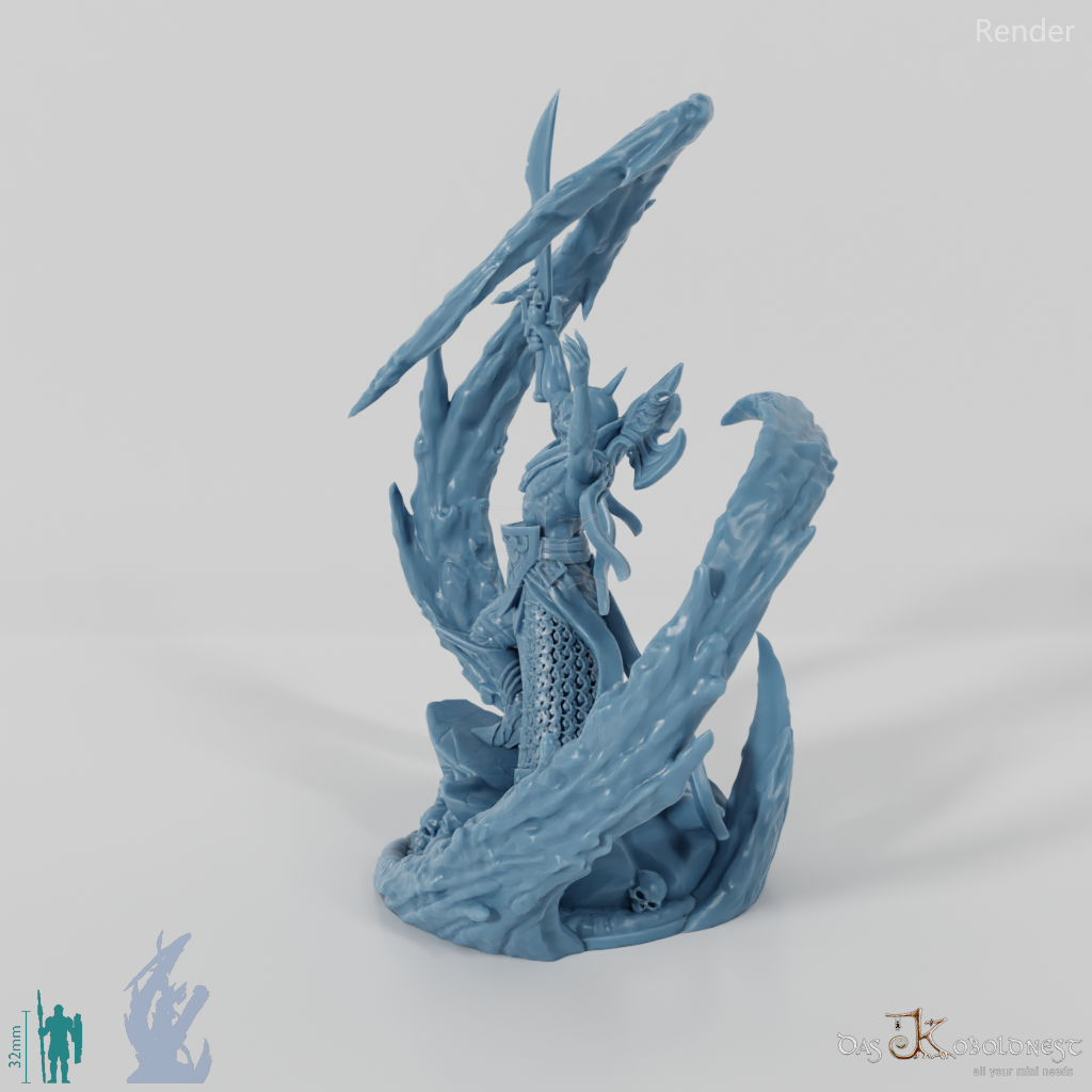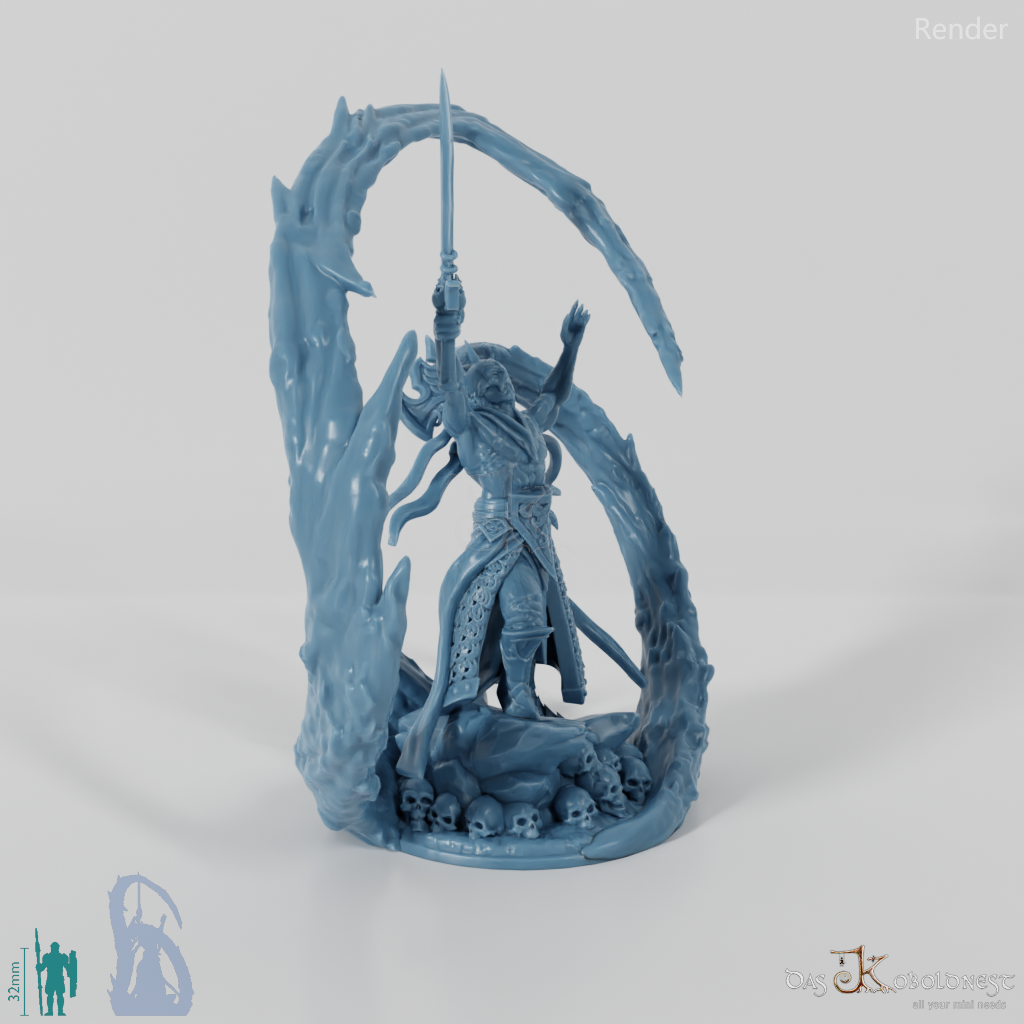 Heerführer mit freiem Oberkörper und Helm, der auf einem von Schädeln umgebenen Felsen steht und mit erhobenem Schwert eindrucksvolle Blutmagie wirkt. Modell steht auf szenischer 32 mm-Rundbase.