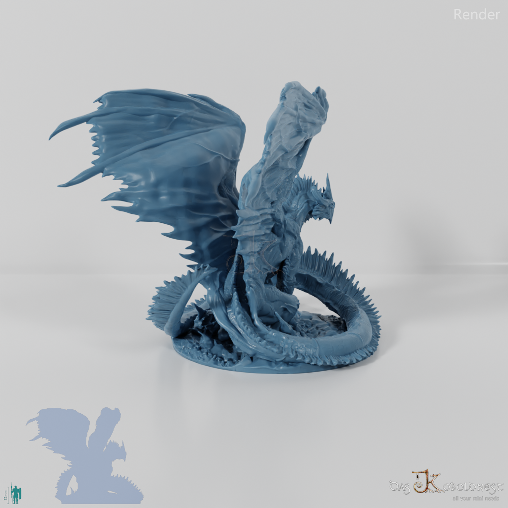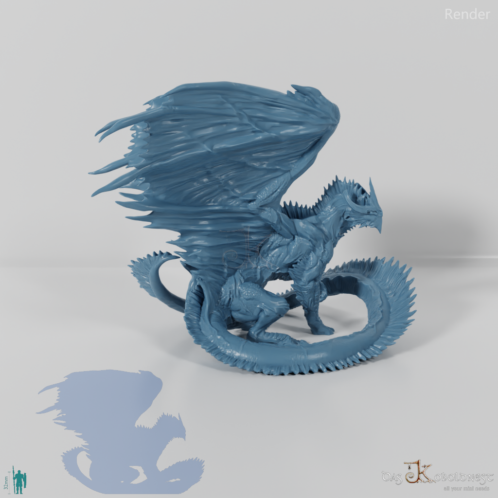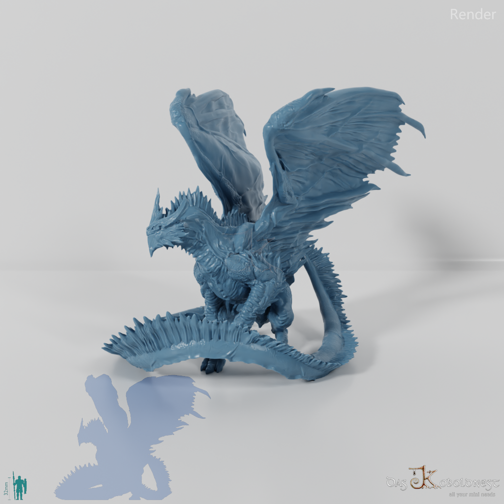 Gewaltiger goldener Drache mit dornigem Rückenkamm, der sich von der Schwanzspitze bis auf den Kopf erstreckt.