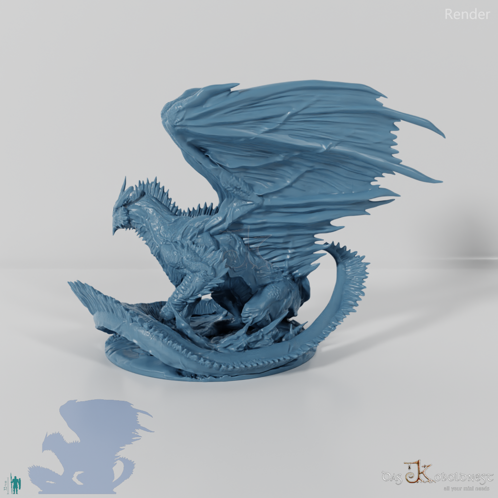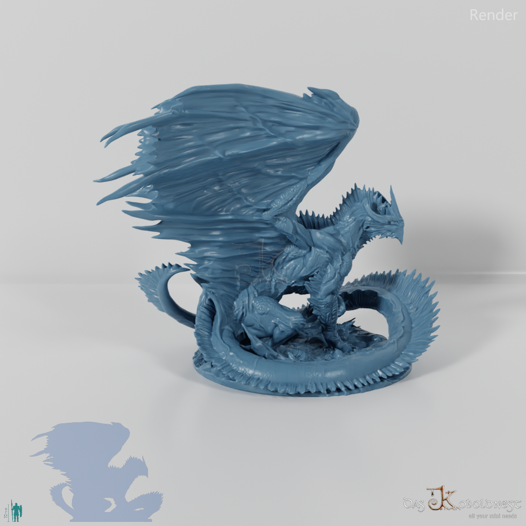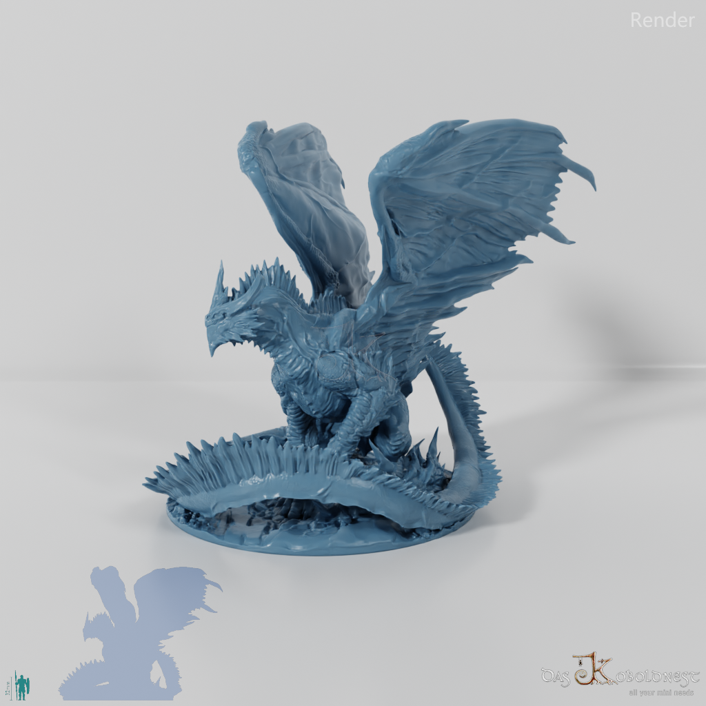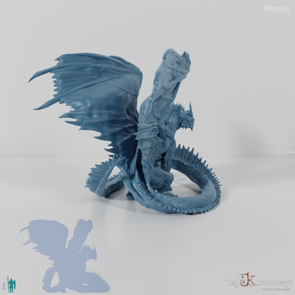 Gewaltiger goldener Drache mit dornigem Rückenkamm, der sich von der Schwanzspitze bis auf den Kopf erstreckt.