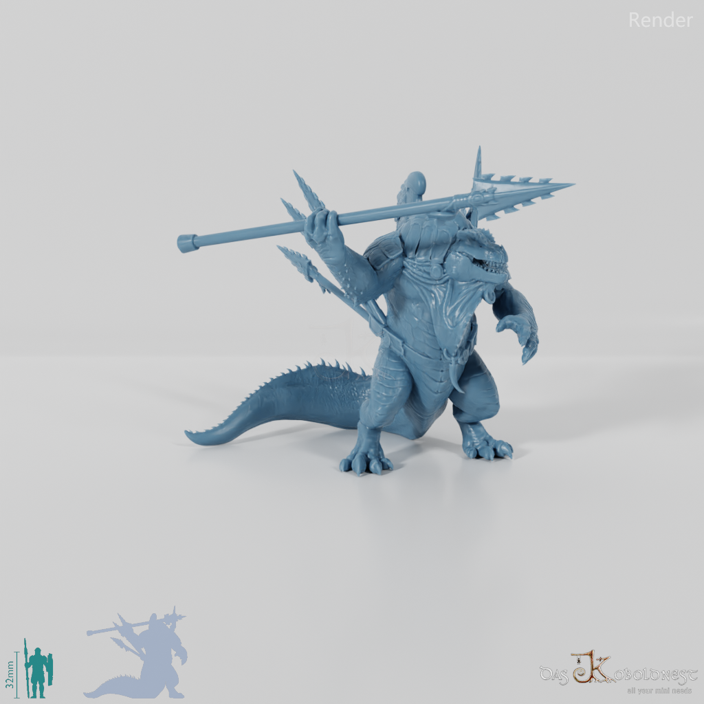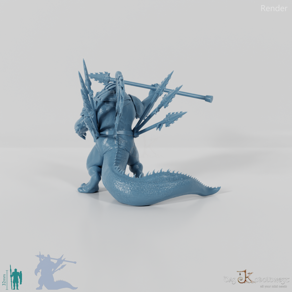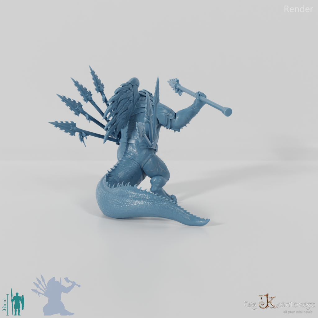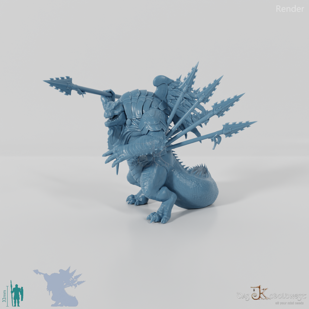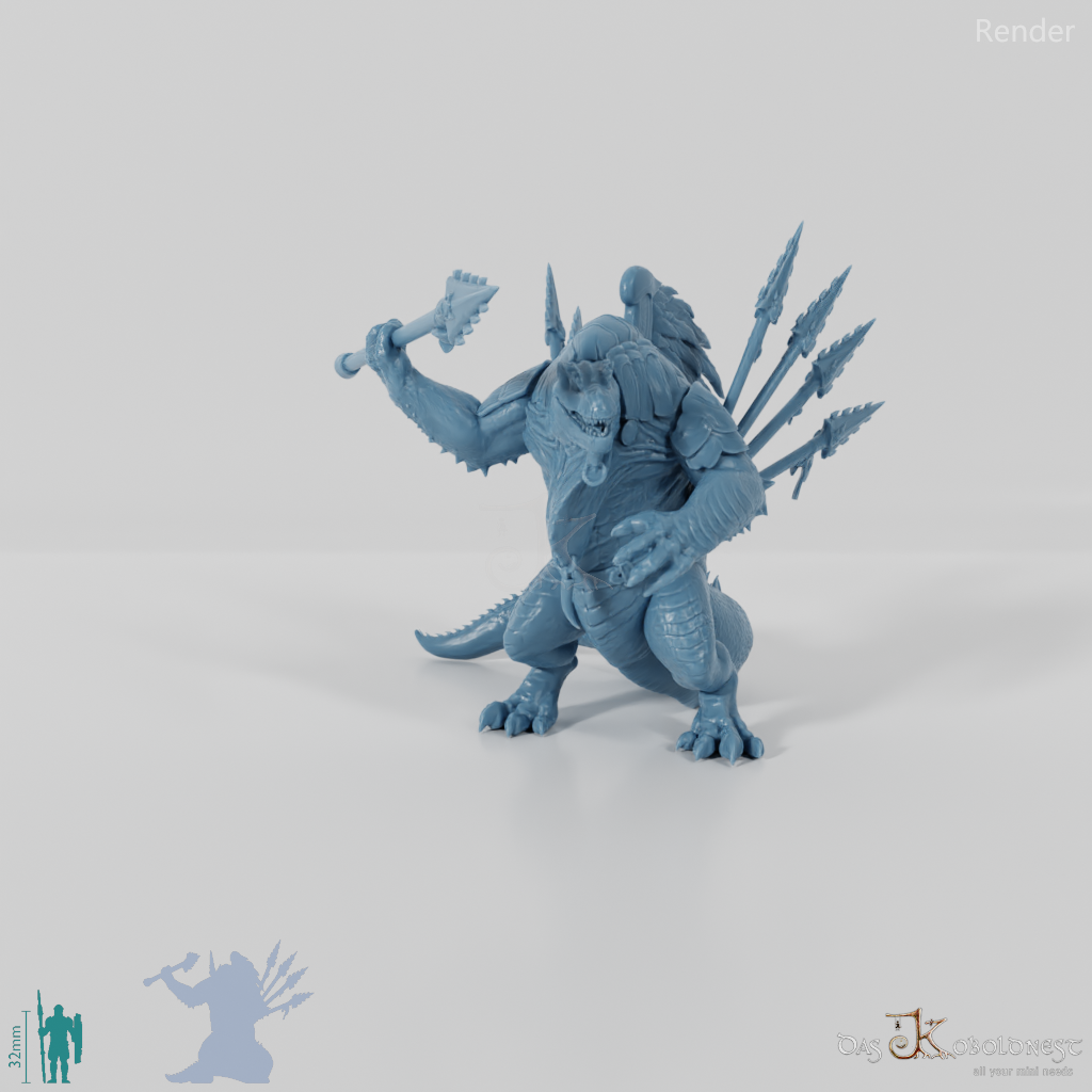 Echsenvolk mit dinosaurierähnlichem Kopf, spitzem Rückenkamm und massigem Schwanz, der mit Wurfspeeren bewaffnet ist und einen gefiederten Plattenpanzer trägt