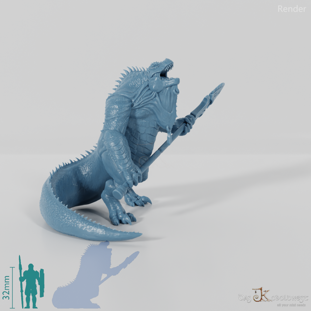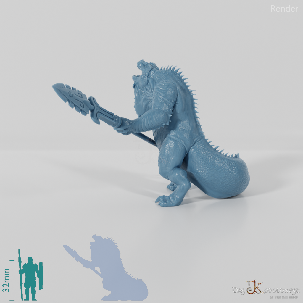 Echsenvolk mit dinosaurierähnlichem Kopf, spitzem Rückenkamm und massigem Schwanz, der mit einem verzierten Speer bewaffnet ist