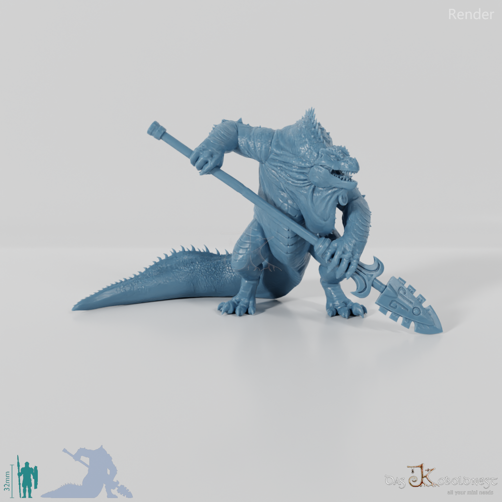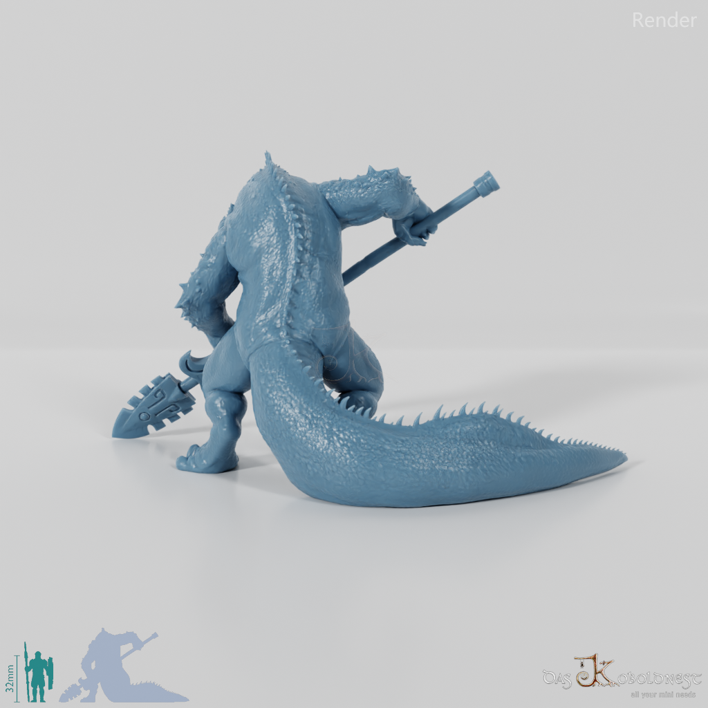 Echsenvolk mit dinosaurierähnlichem Kopf, spitzem Rückenkamm und massigem Schwanz, der mit einem verzierten Speer bewaffnet ist