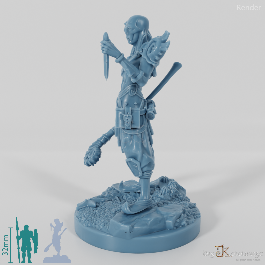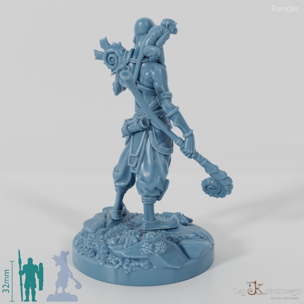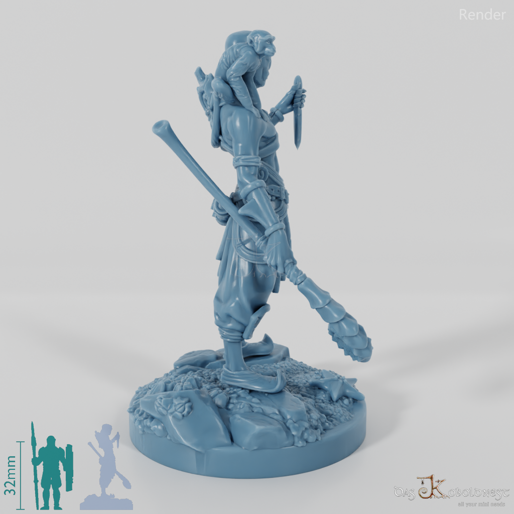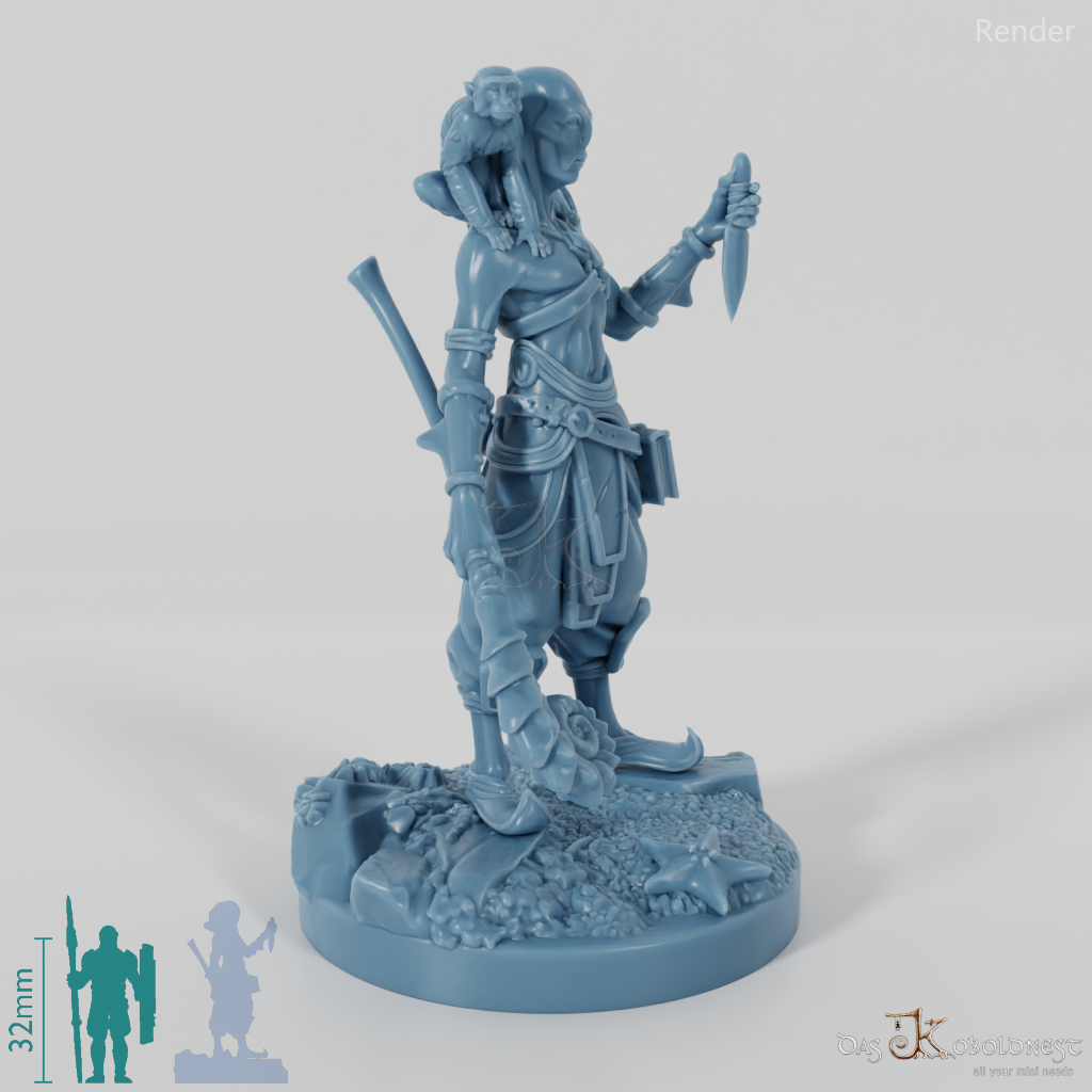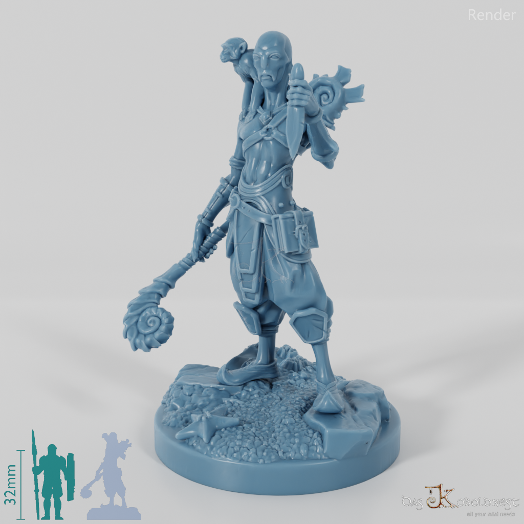Aquatischer Humanoid, der Rüstung und Waffen aus Muscheln trägt und einen kleinen Affen auf der Schulter hat