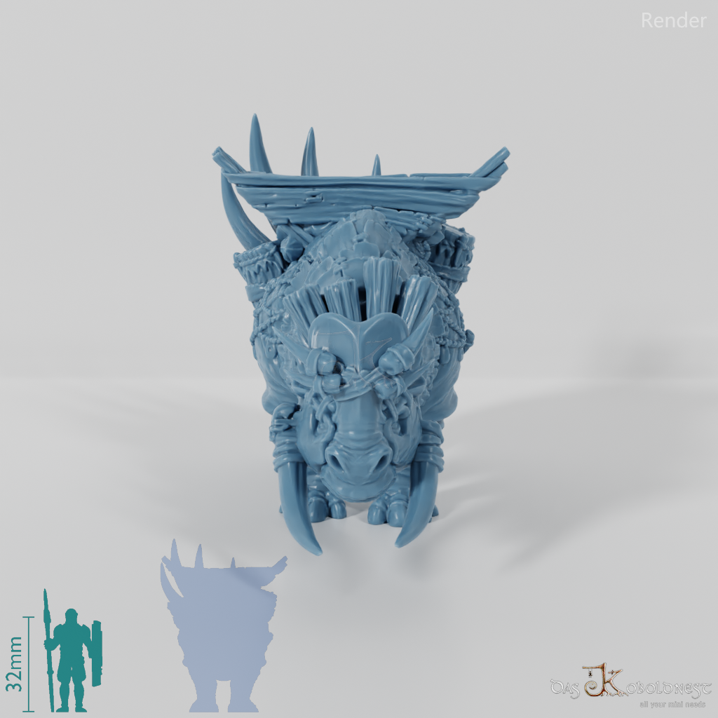 Prähistorisches, nashörnähnliches Säugetier mit gegabeltem, stumpfem Nasenhorn, das mit einer Reitplattform und Horn- und Knochenrüstung ausgestattet ist