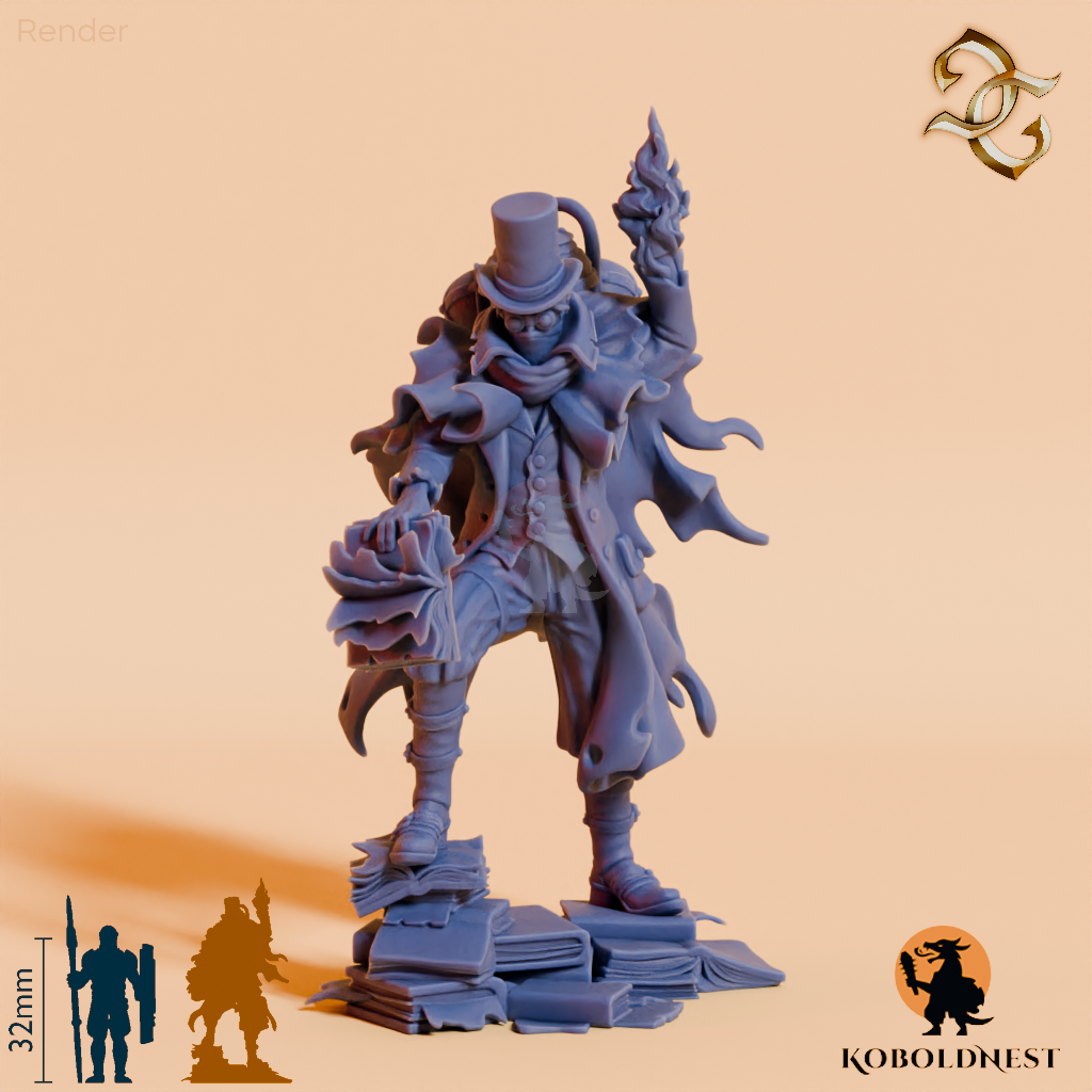 Vermummter Mann mit Zylinder und edler Kleidung, der auf einem Bücherhaufen stehend über einen mit einem Schlauch verbundenen Rückentank eine Flamme in seiner behandschuhten Hand entstehen lässt.