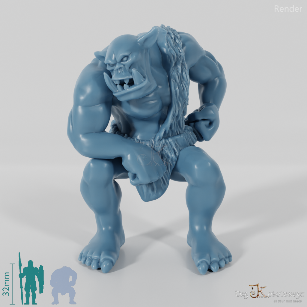 Sitzender Ork in Fellkleidung, der sich mit einem Unterarm auf sein Knie stützt. Modell sitzt nicht von alleine, sondern benötigt eine Bank oder Ähnliches zum platzieren.