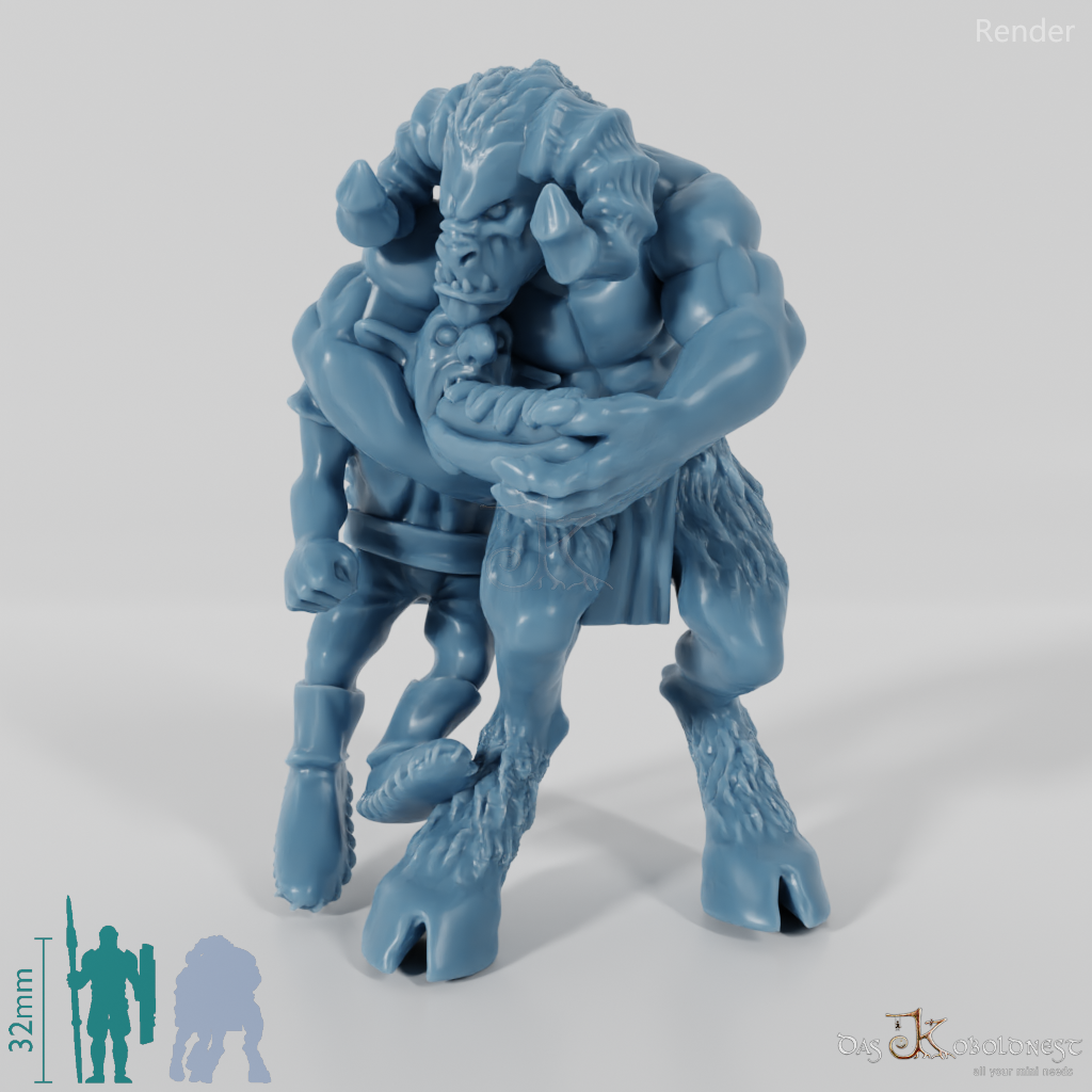 Ziegenmensch, der einen kleinen Goblin im Schwitzkasten hält und ihm ein riesiges Sandwich in den Mund stopft.