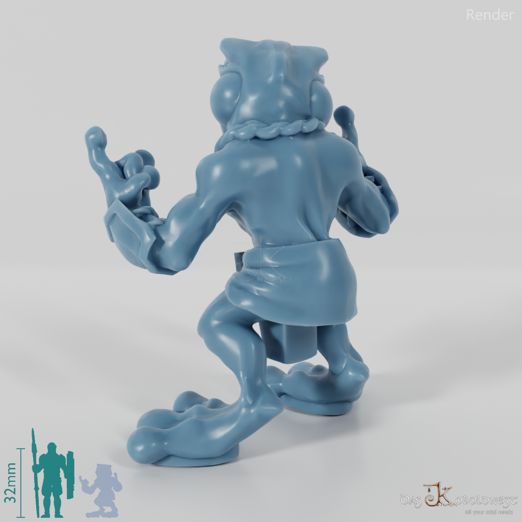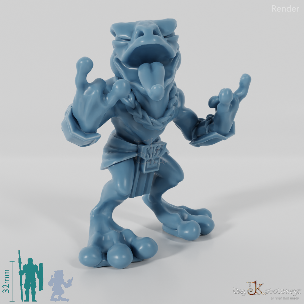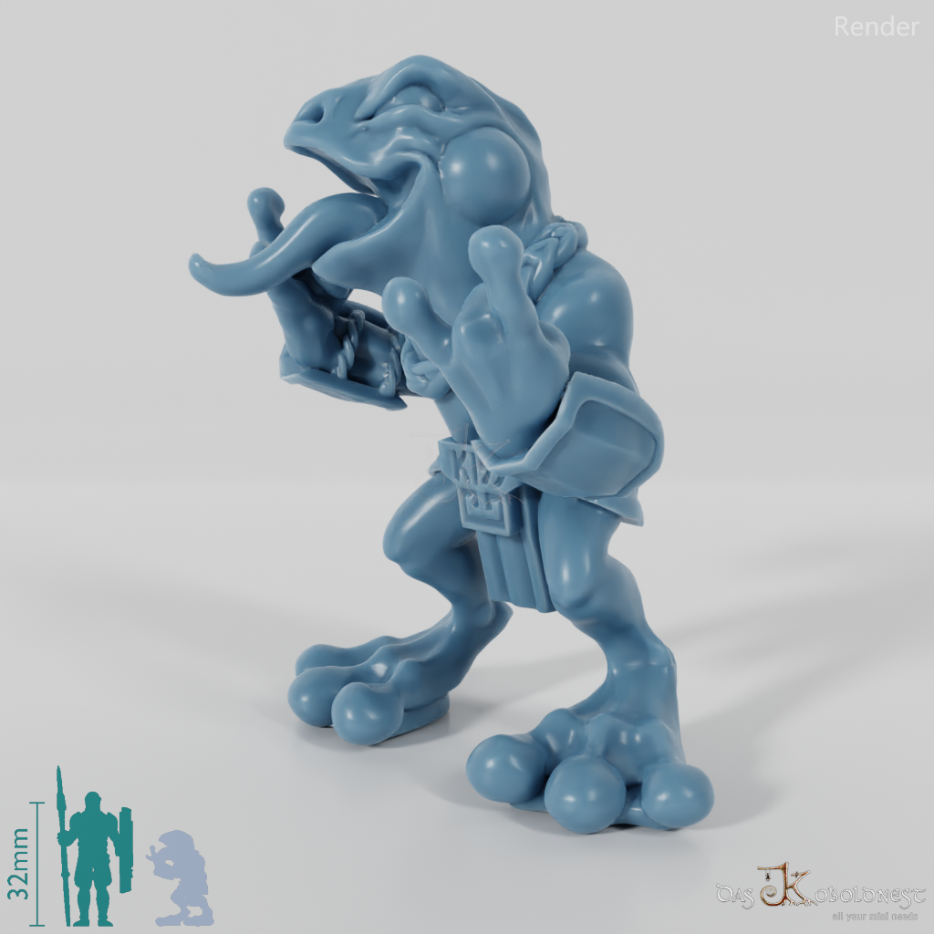 Jubelnder humanoider Frosch mit herausgestreckter Zunge, der mit beiden Händen Teufelshörner macht und einen Gürtel mit der Aufschrift "KISS" trägt.