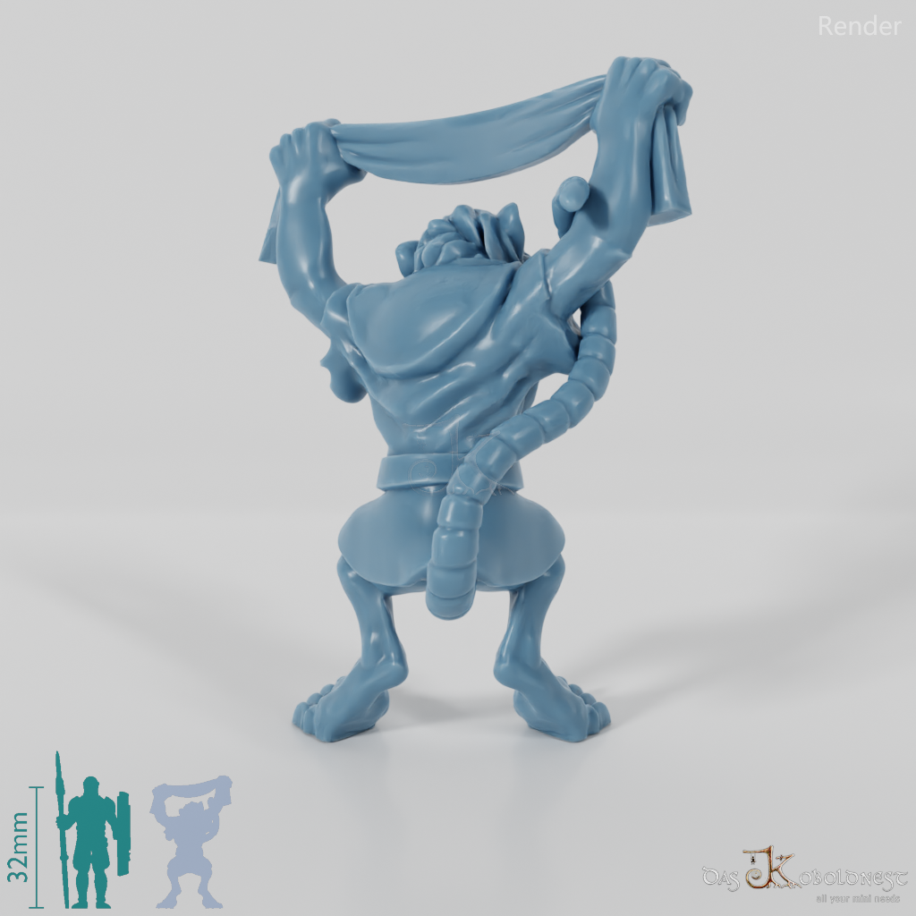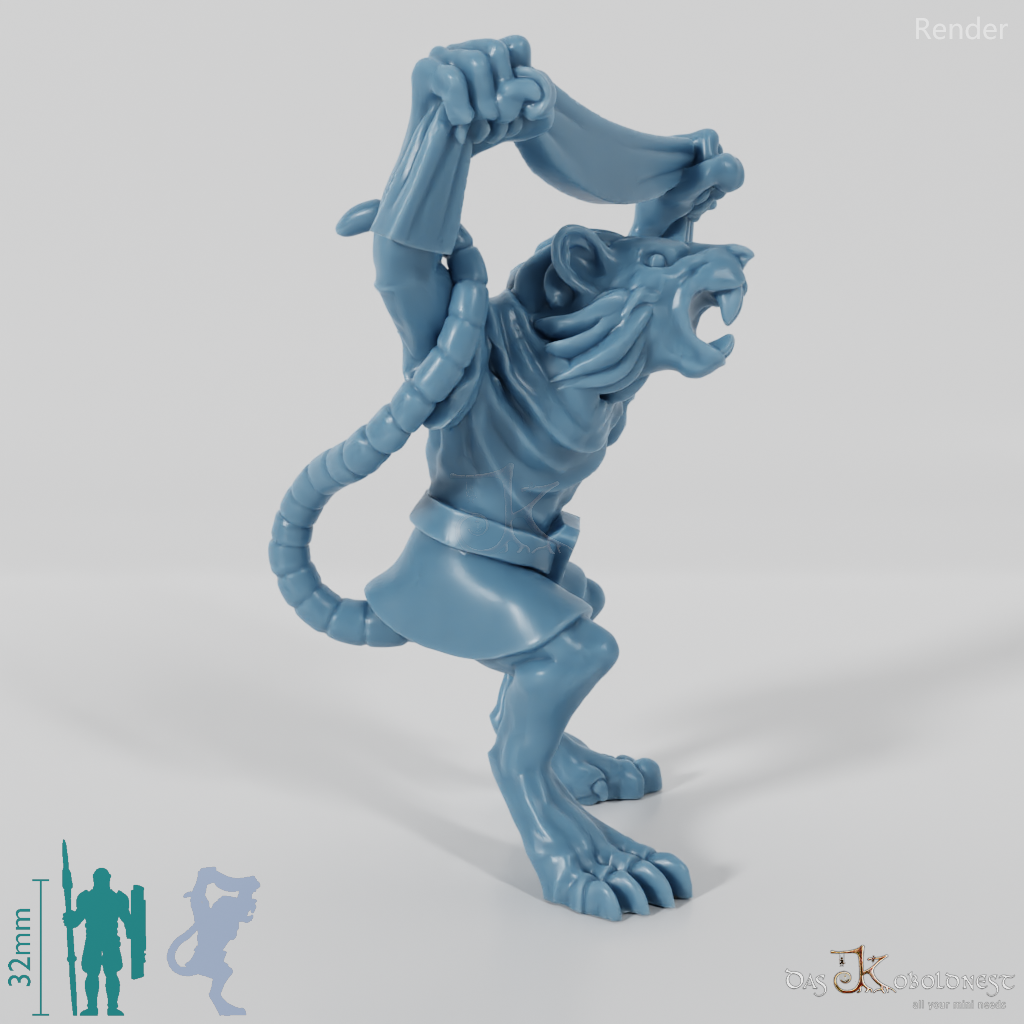 Sitzender Rattenmensch, der begeistert ein Banner in die Höhe reckt. Modell sitzt nicht von alleine, sondern benötigt eine Bank oder Ähnliches zum platzieren.
