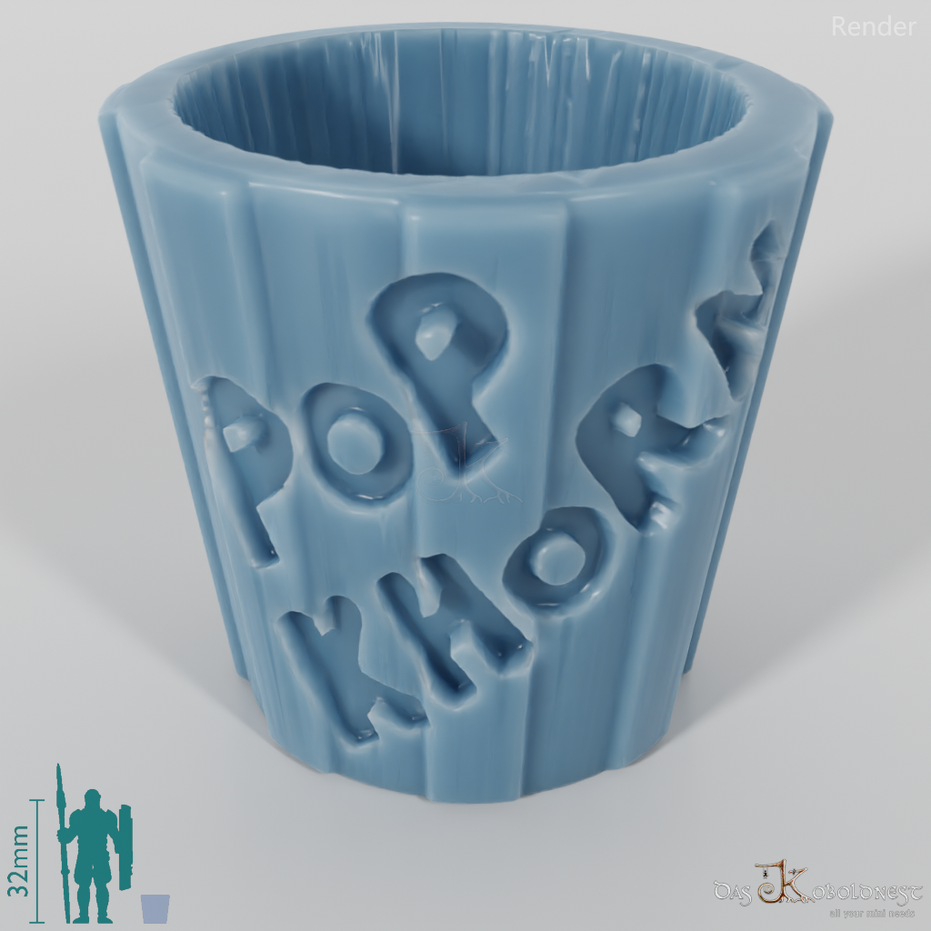 Leerer Behälter mit der zweizeiligen Aufschrift "Popkhorn".
