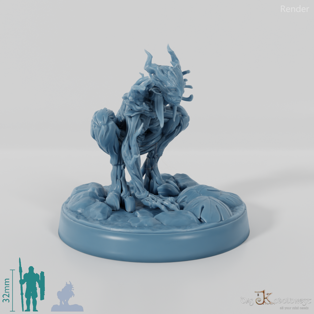 Weibliche Gestalt, die aus Ästen und Rinde geschaffen ist und auf großen Hufen geht