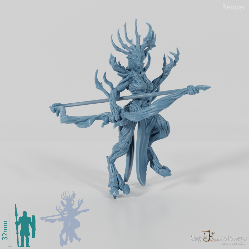 Hoch aufragende, weibliche Gestalt, die aus Ästen und Rinde geschaffen ist, auf großen Hufen geht und mit einem knorrigen Bogen bewaffnet ist.