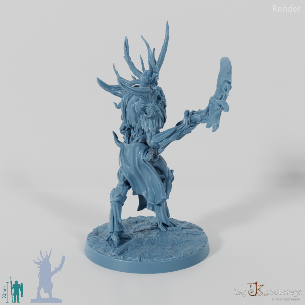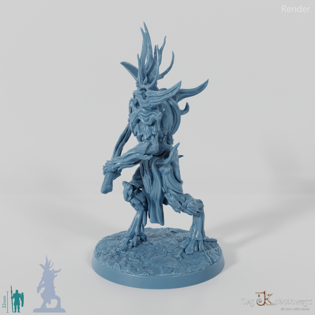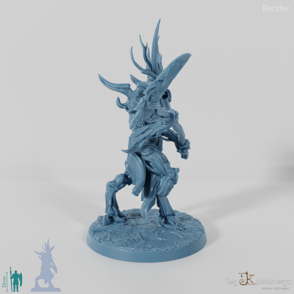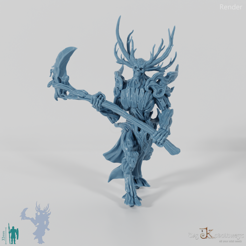 Hoch aufragende, männliche Gestalt, die aus Ästen und Baumrinde geschaffen ist, auf großen Hufen geht und mit einer gewaltigen Sense bewaffnet ist.