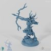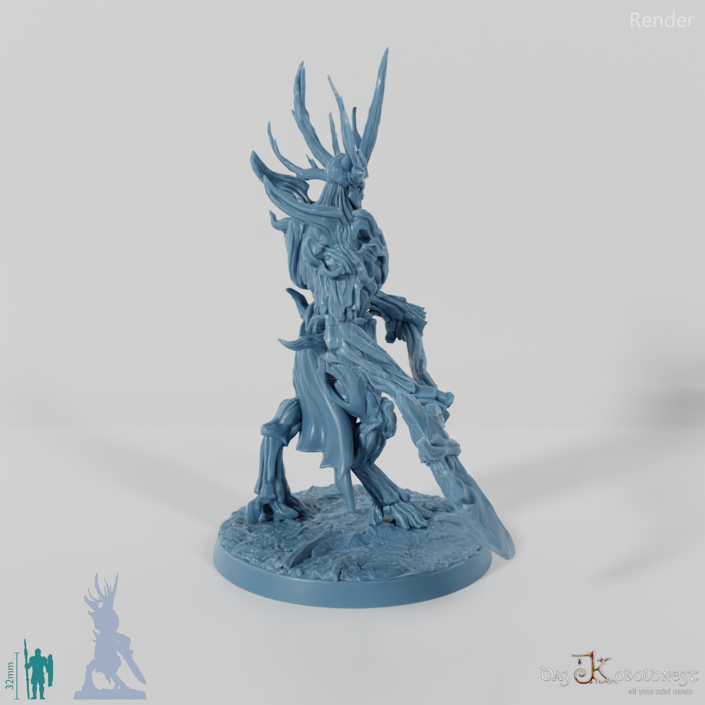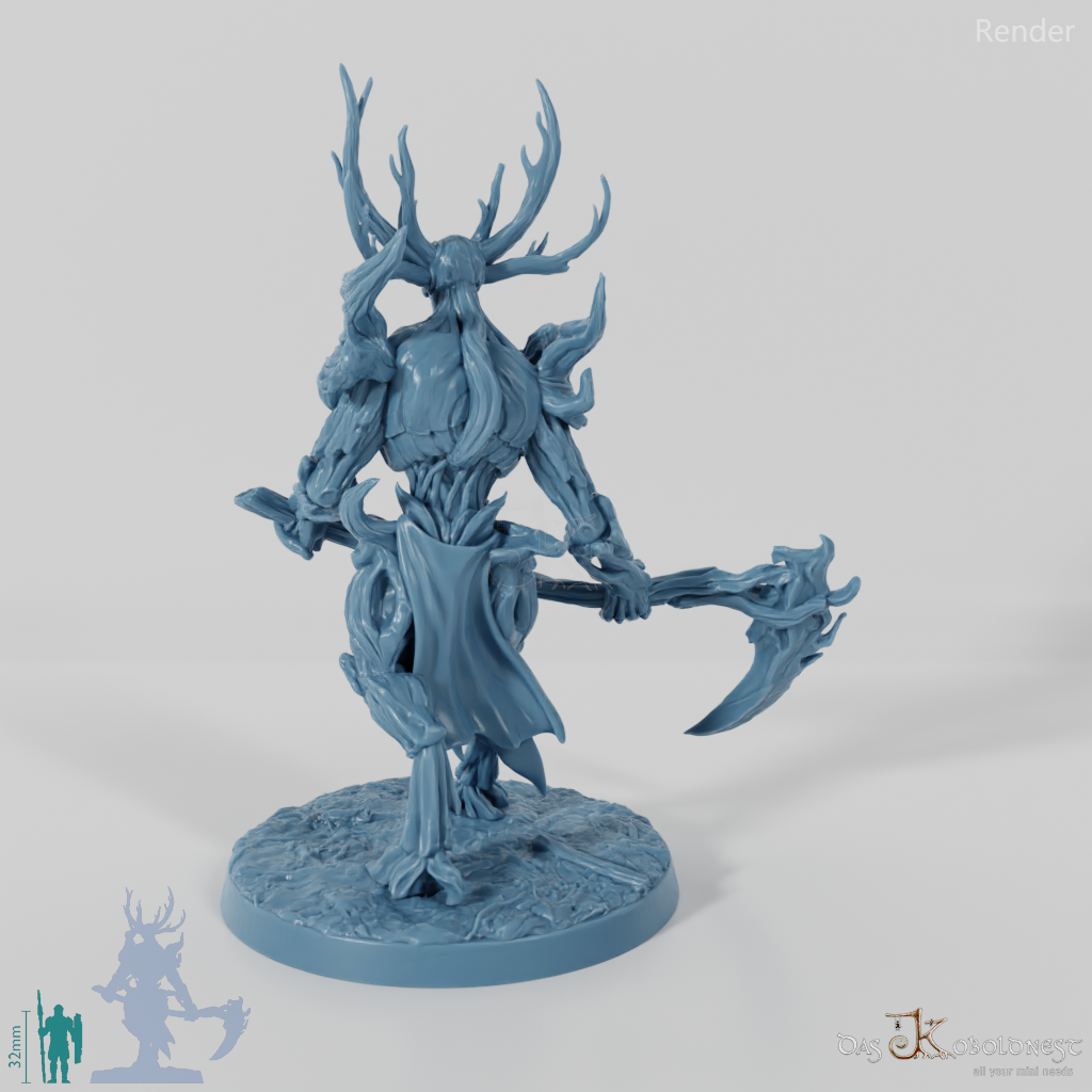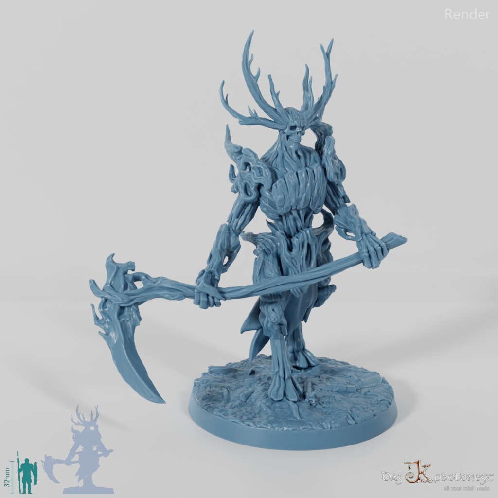 Hoch aufragende, männliche Gestalt, die aus Ästen und Baumrinde geschaffen ist, auf großen Hufen geht und mit einer gewaltigen Sense bewaffnet ist.