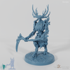 Hoch aufragende, männliche Gestalt, die aus Ästen und Baumrinde geschaffen ist, auf großen Hufen geht und mit einem gewaltigen Schwert bewaffnet ist.