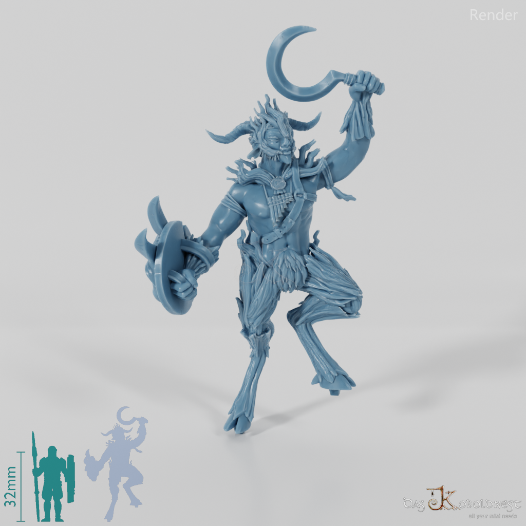 Gehörnter Faun mit Panflöte um den Hals, der mit Sichel und Schild bewaffnet ist.