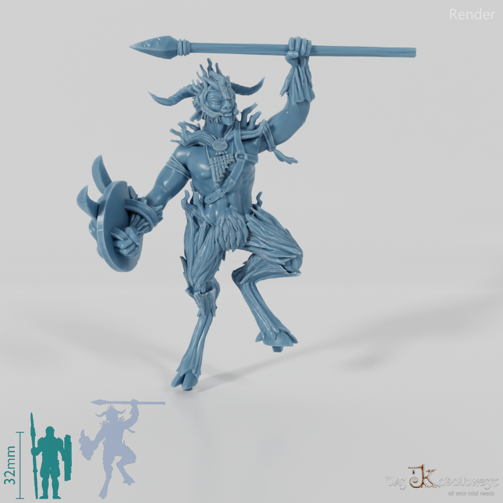 Gehörnter Faun mit Panflöte um den Hals, der mit Speer und Schild bewaffnet ist.
