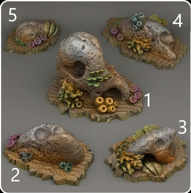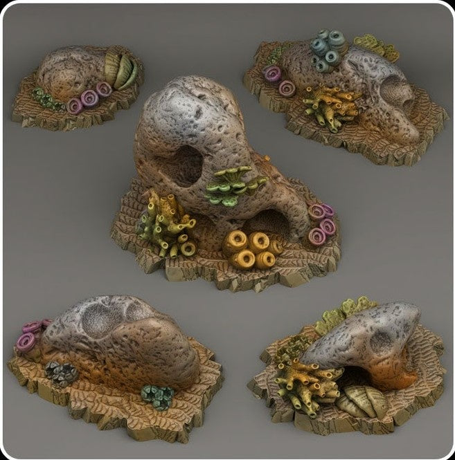 Verwitterte Felsen, die auf dem Meeresboden liegen und von Korallen, Schwämmen und Seepocken bewachsen sind