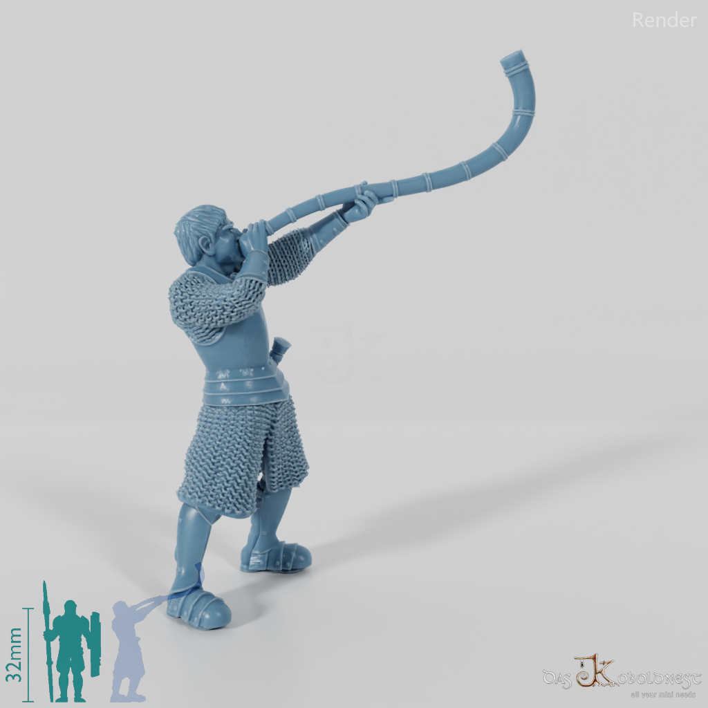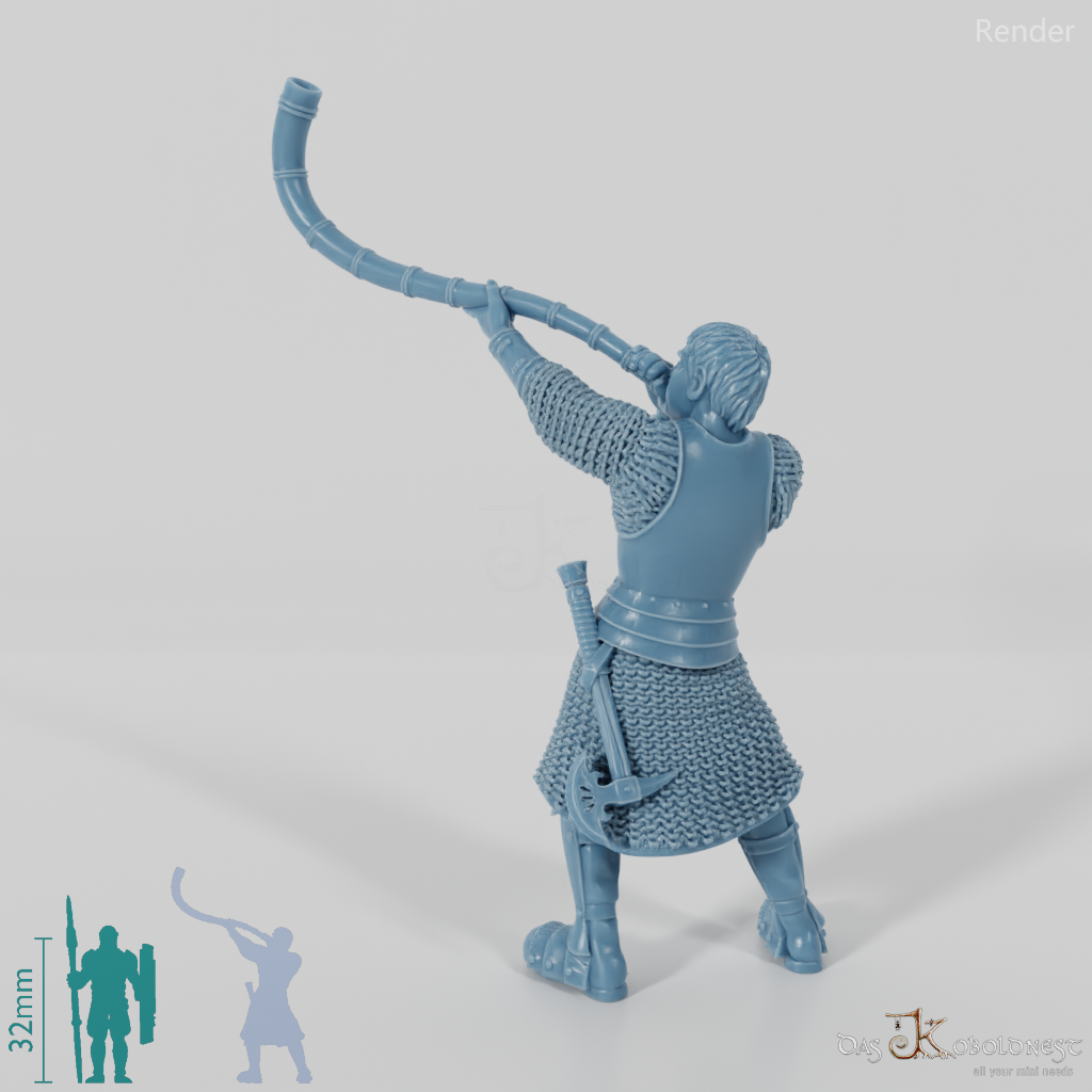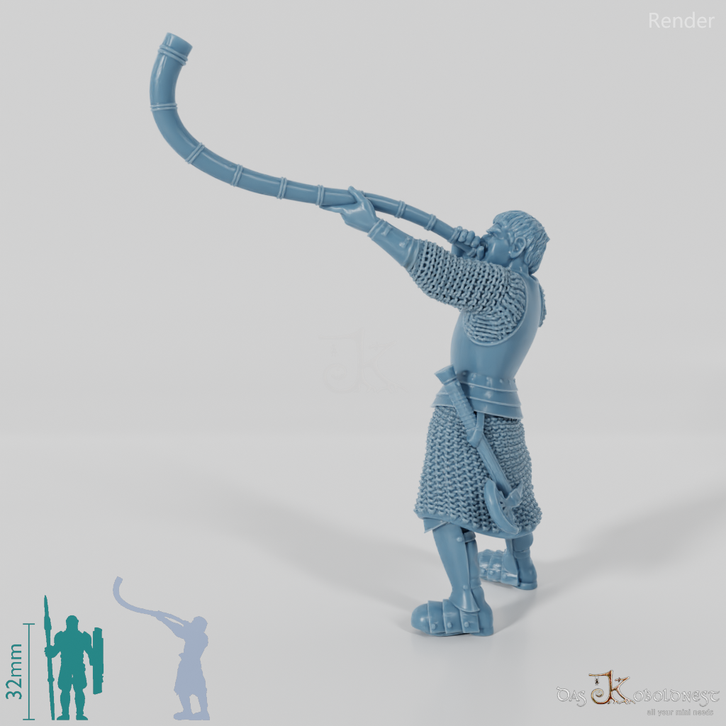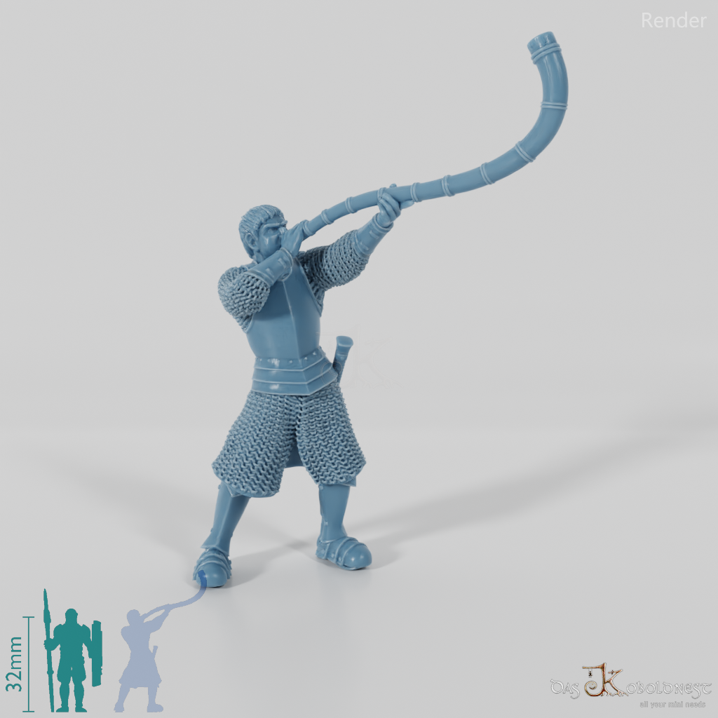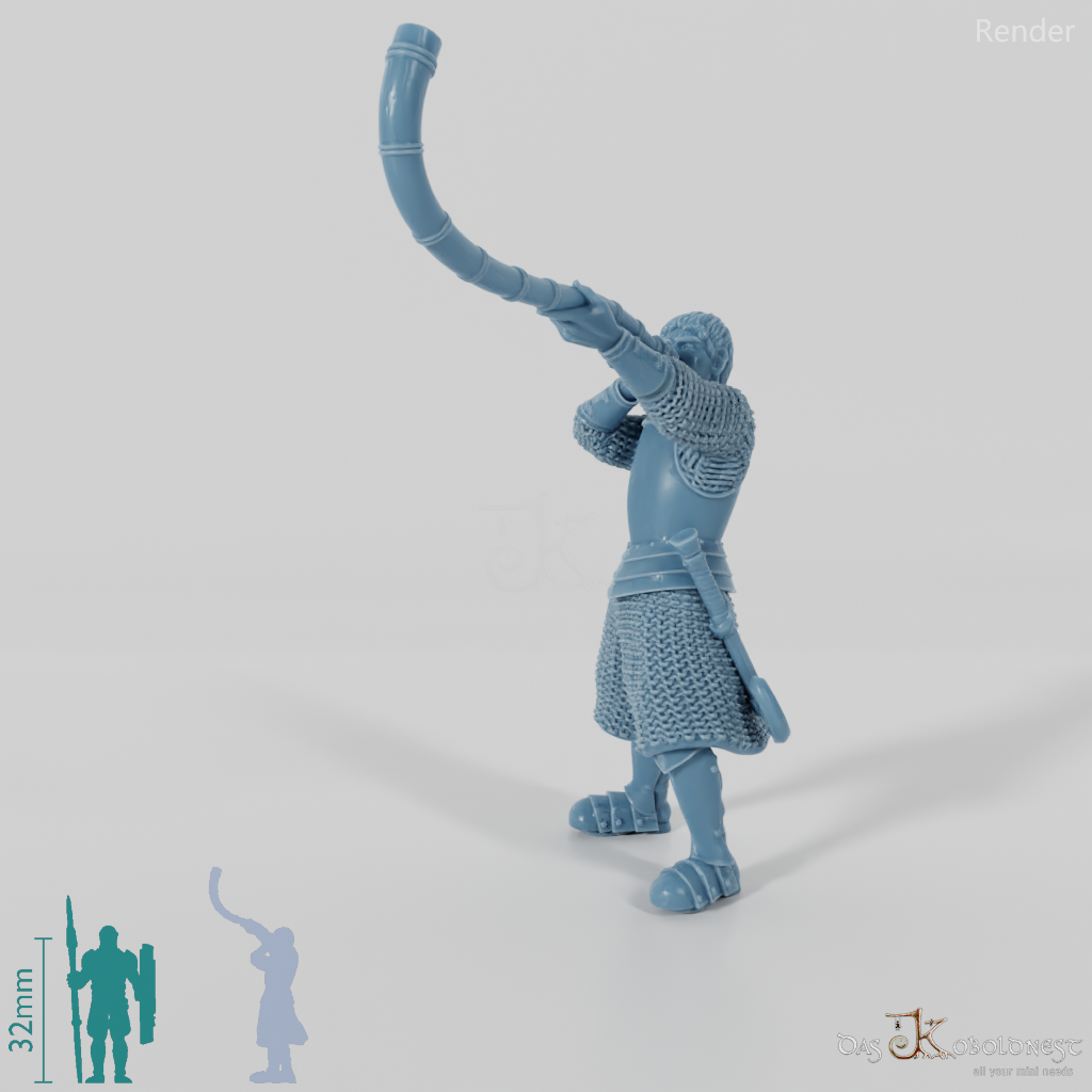 Soldat mit Kettenpanzer und Plattenrüstung, der ein langes Holzhorn an die Lippen gehoben hat