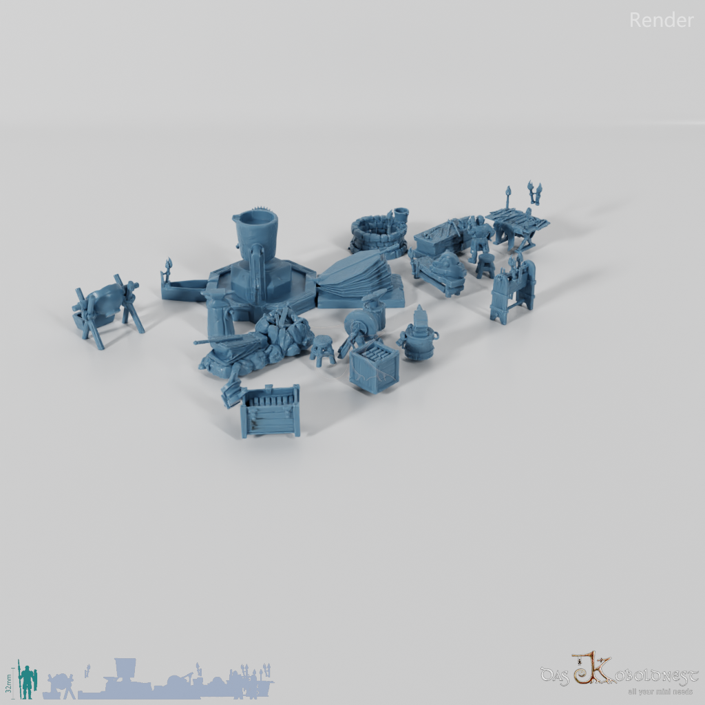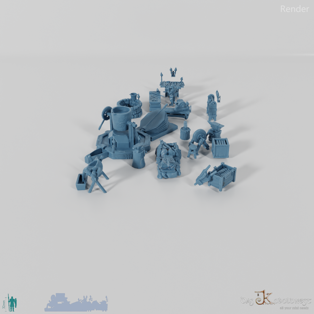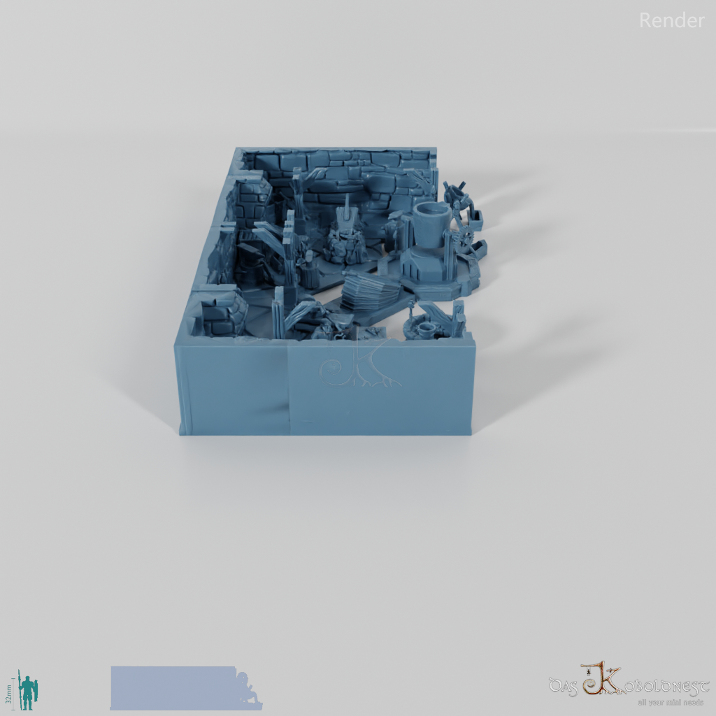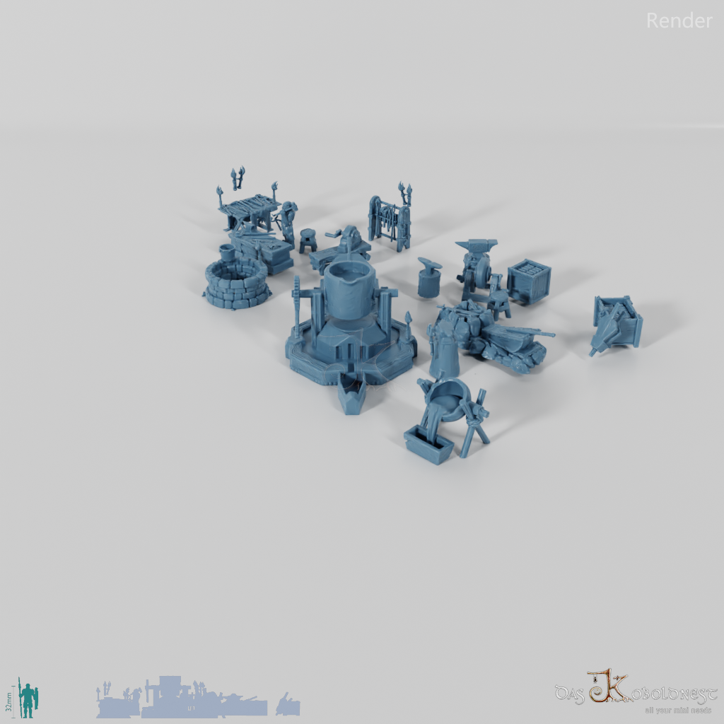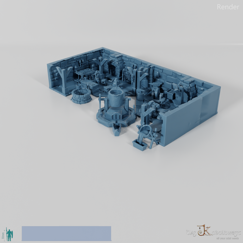 Fackelbeleuchtete Zwergenschmiede voller Ambosse, Blasebalge und Werkzeuge, in der ein zwergischer Schmied arbeitet. Alle Kleinteile sind aus Resin gefertigt, die Wände und Böden der Schmiede aus PLA. Das Komplettset besteht aus 35 Einzelteilen, die beliebig für Diorama- und Geländebau im 28-32mm Maßstab verwendet werden können. Set wahlweise mit oder ohne Wände und Steinböden verfügbar. Models by Asgard Rising, Brayan Nafarrate, GameScape3D, Keta Minies, llewinidas (CC BY 4.0), Pellinor1 (CC BY 4.0), STLMiniatures, The Printing Goes Ever On