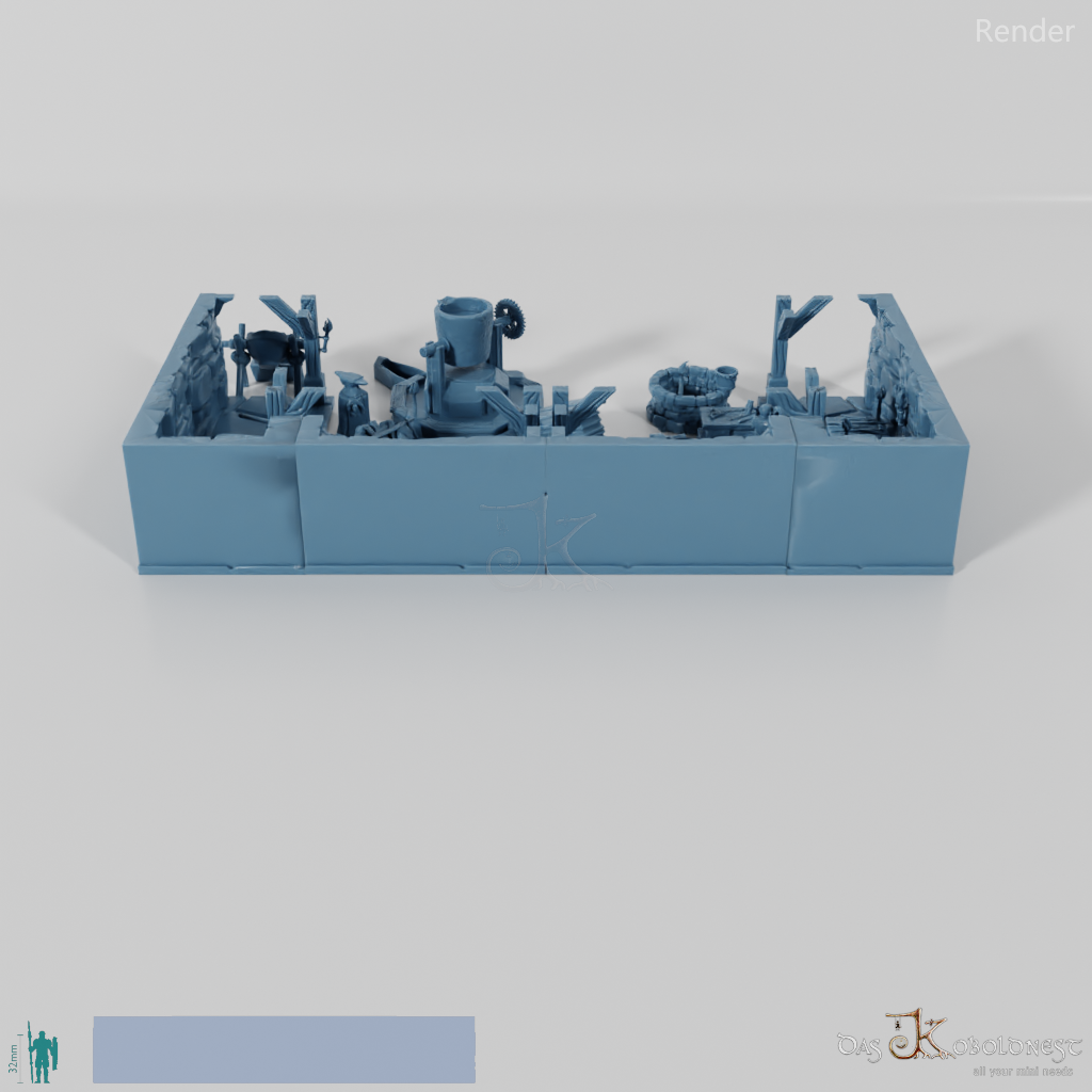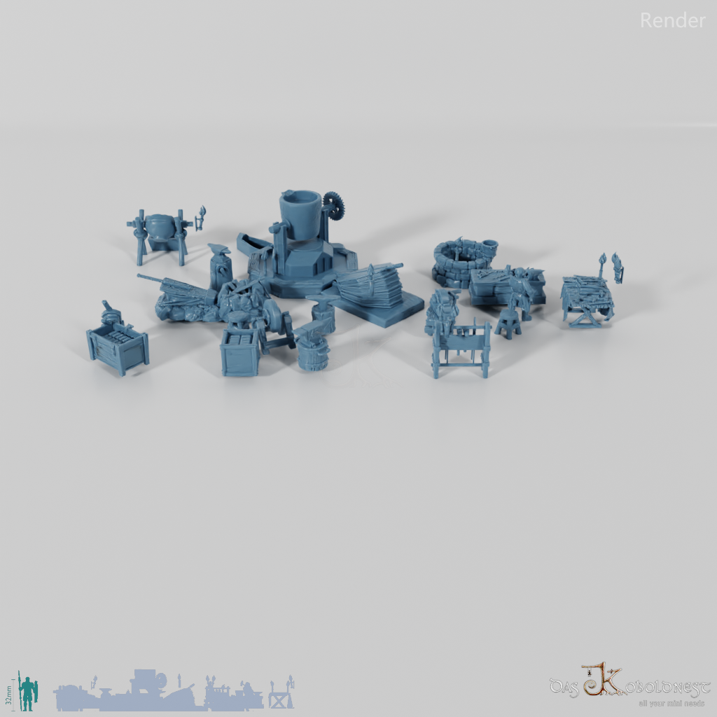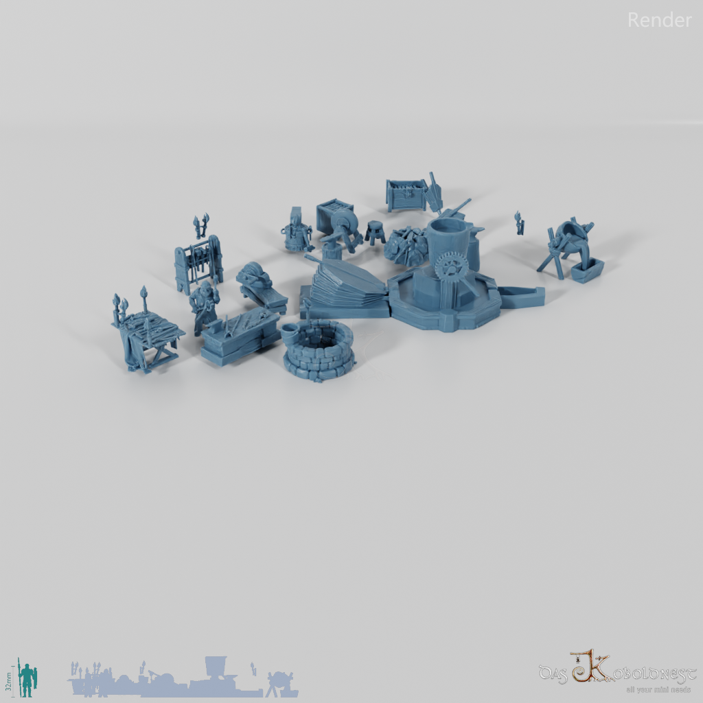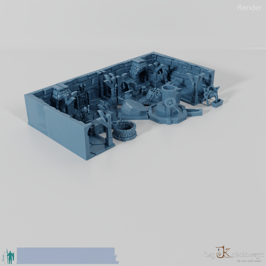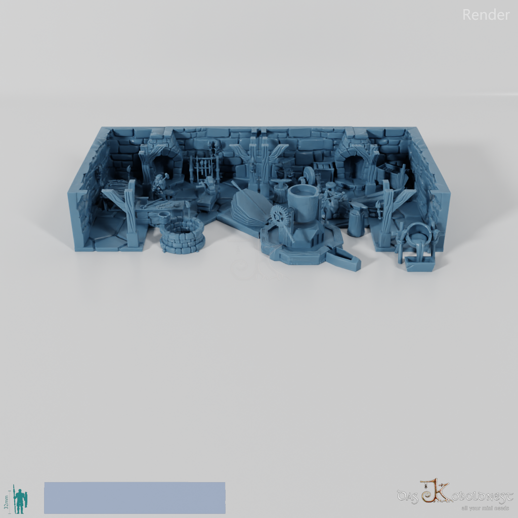 Fackelbeleuchtete Zwergenschmiede voller Ambosse, Blasebalge und Werkzeuge, in der ein zwergischer Schmied arbeitet. Alle Kleinteile sind aus Resin gefertigt, die Wände und Böden der Schmiede aus PLA. Das Komplettset besteht aus 35 Einzelteilen, die beliebig für Diorama- und Geländebau im 28-32mm Maßstab verwendet werden können. Set wahlweise mit oder ohne Wände und Steinböden verfügbar. Models by Asgard Rising, Brayan Nafarrate, GameScape3D, Keta Minies, llewinidas (CC BY 4.0), Pellinor1 (CC BY 4.0), STLMiniatures, The Printing Goes Ever On