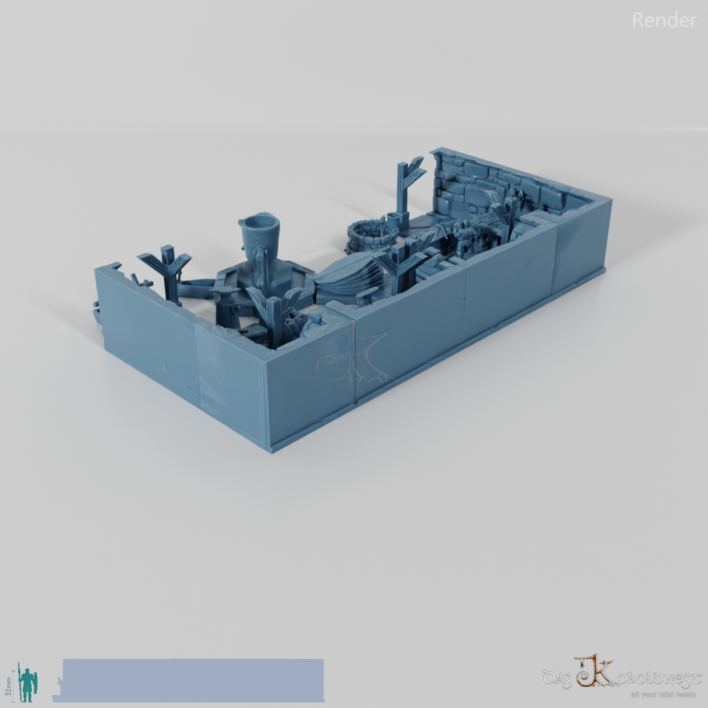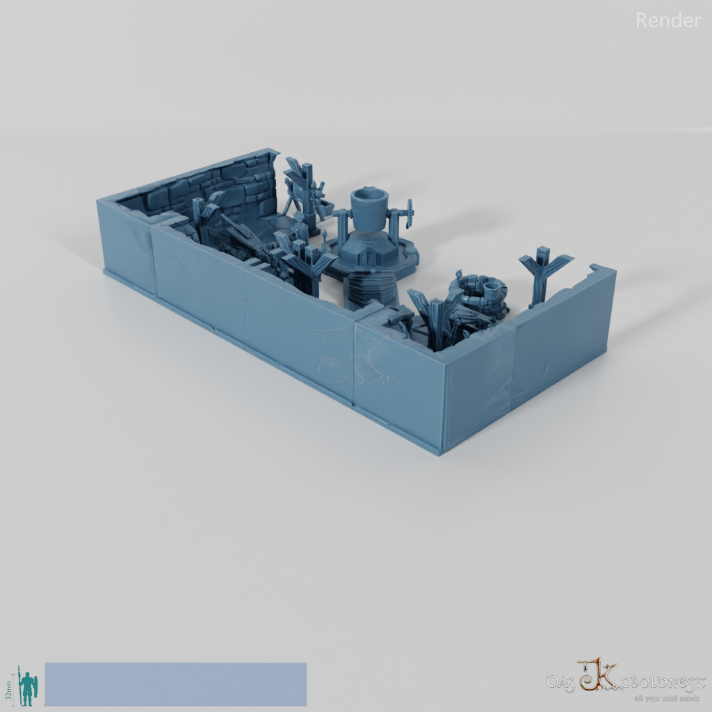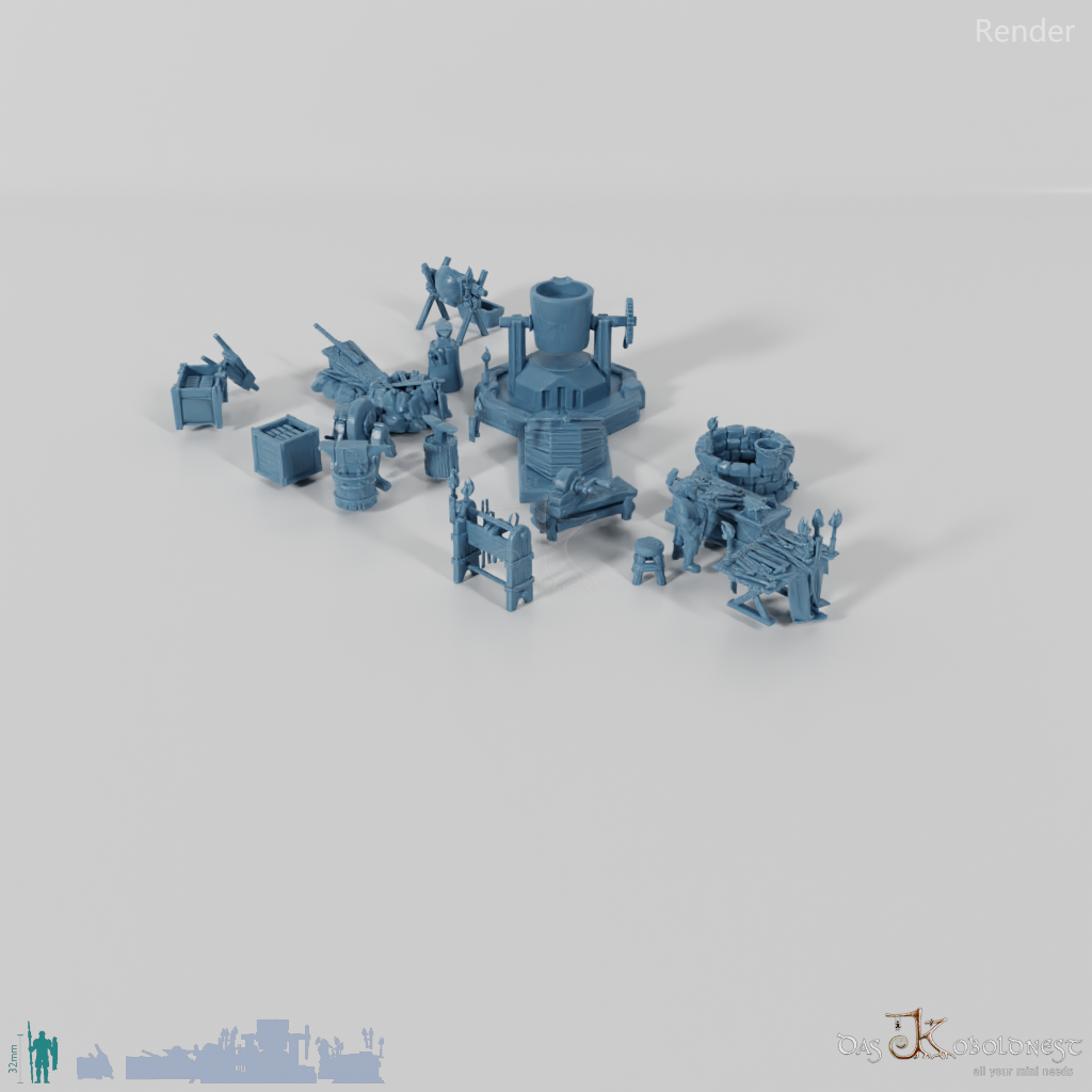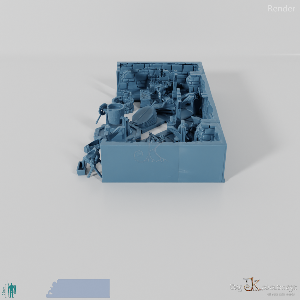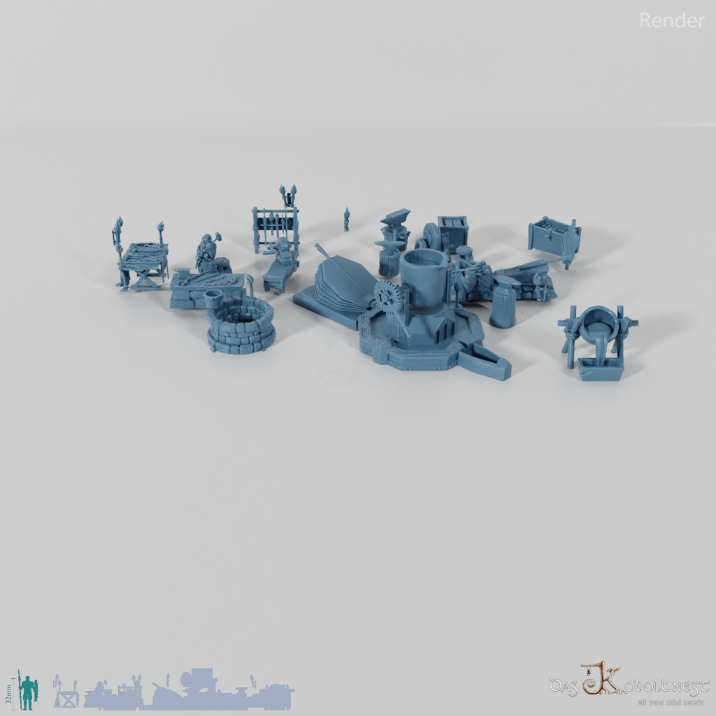 Fackelbeleuchtete Zwergenschmiede voller Ambosse, Blasebalge und Werkzeuge, in der ein zwergischer Schmied arbeitet. Alle Kleinteile sind aus Resin gefertigt, die Wände und Böden der Schmiede aus PLA. Das Komplettset besteht aus 35 Einzelteilen, die beliebig für Diorama- und Geländebau im 28-32mm Maßstab verwendet werden können. Set wahlweise mit oder ohne Wände und Steinböden verfügbar. Models by Asgard Rising, Brayan Nafarrate, GameScape3D, Keta Minies, llewinidas (CC BY 4.0), Pellinor1 (CC BY 4.0), STLMiniatures, The Printing Goes Ever On