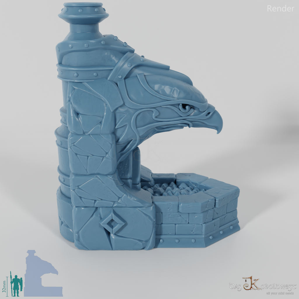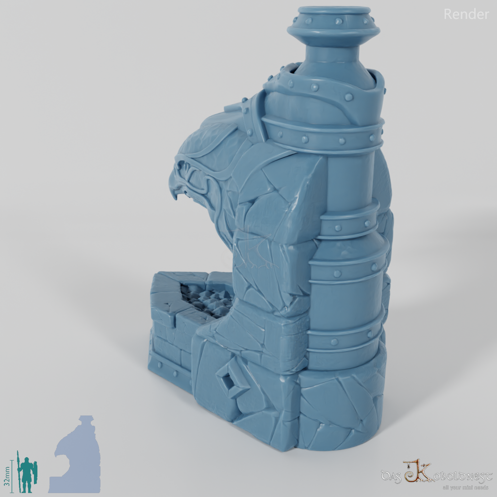 Große steinerne Esse mit metallenem Abzug in Form eines riesigen Adlerkopfes, in der Kohle glüht