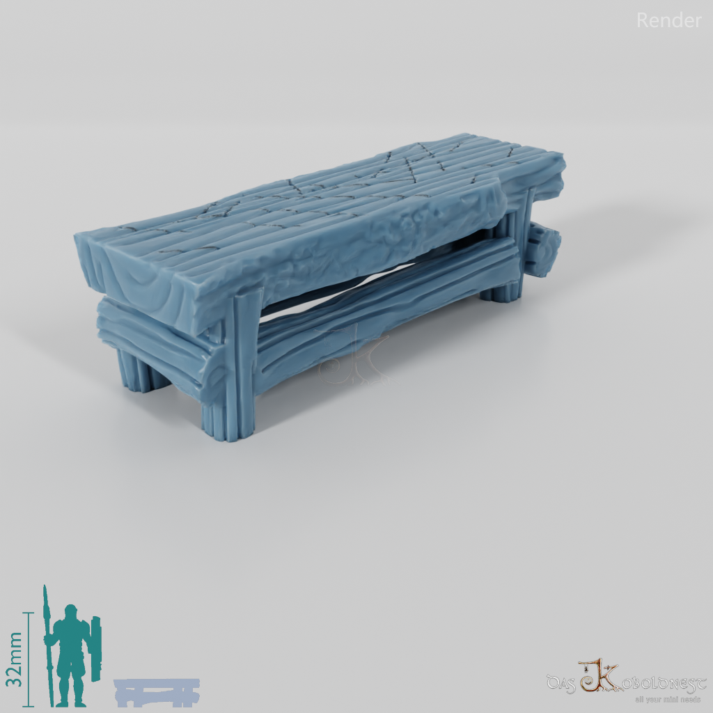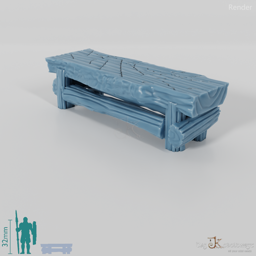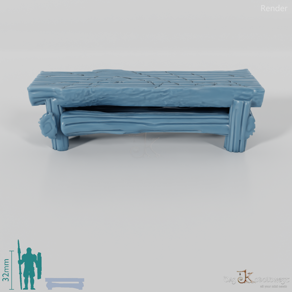 Sitzbank aus einem halbierten Baumstamm auf einem groben Holzgestell