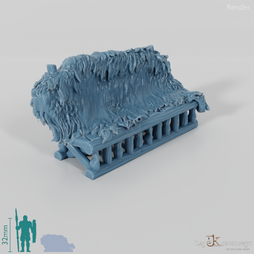 Hölzerne Sitzbank mit Lehne, die aus geschwungenen Ästen gefertigt ist und über der ein großes Fell hängt