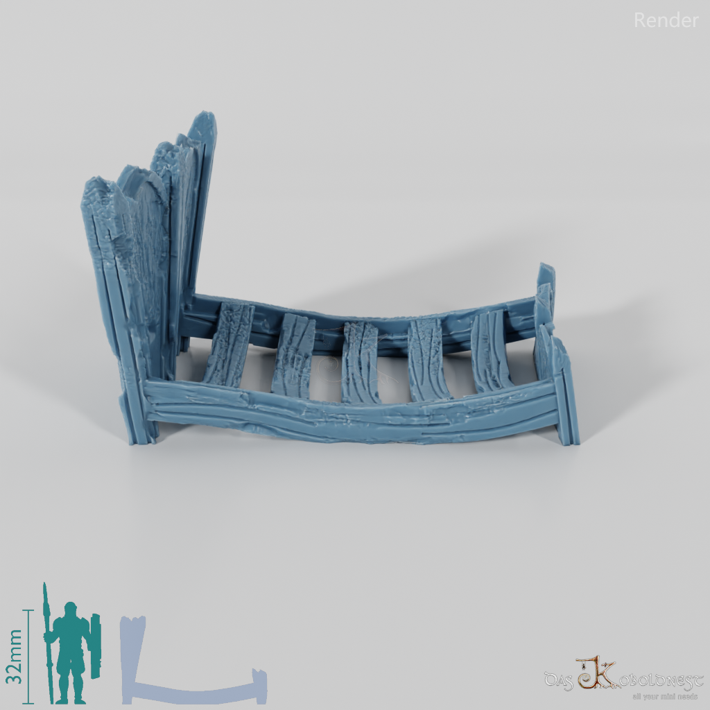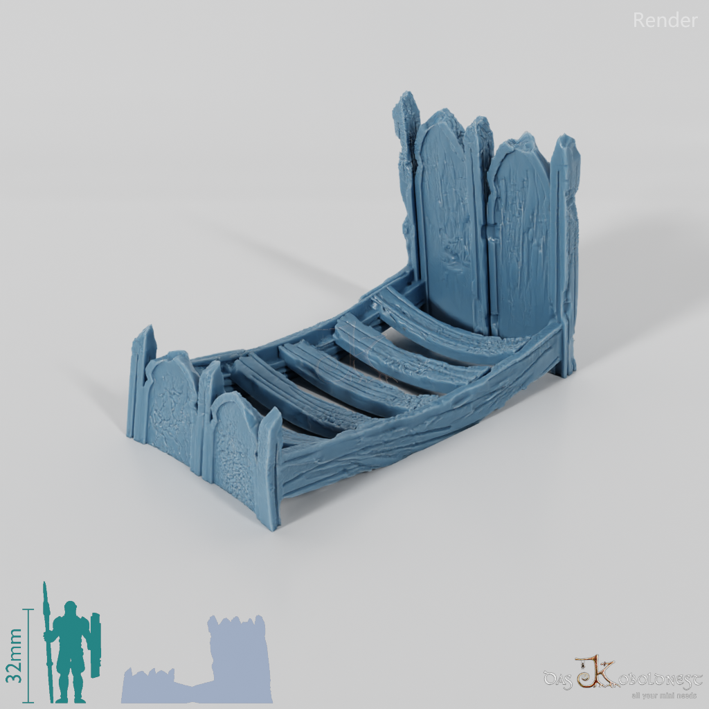 Kleines Bettgestell mit bis zum Boden durchgebogenem Lattenrost und vermoderndem Holz